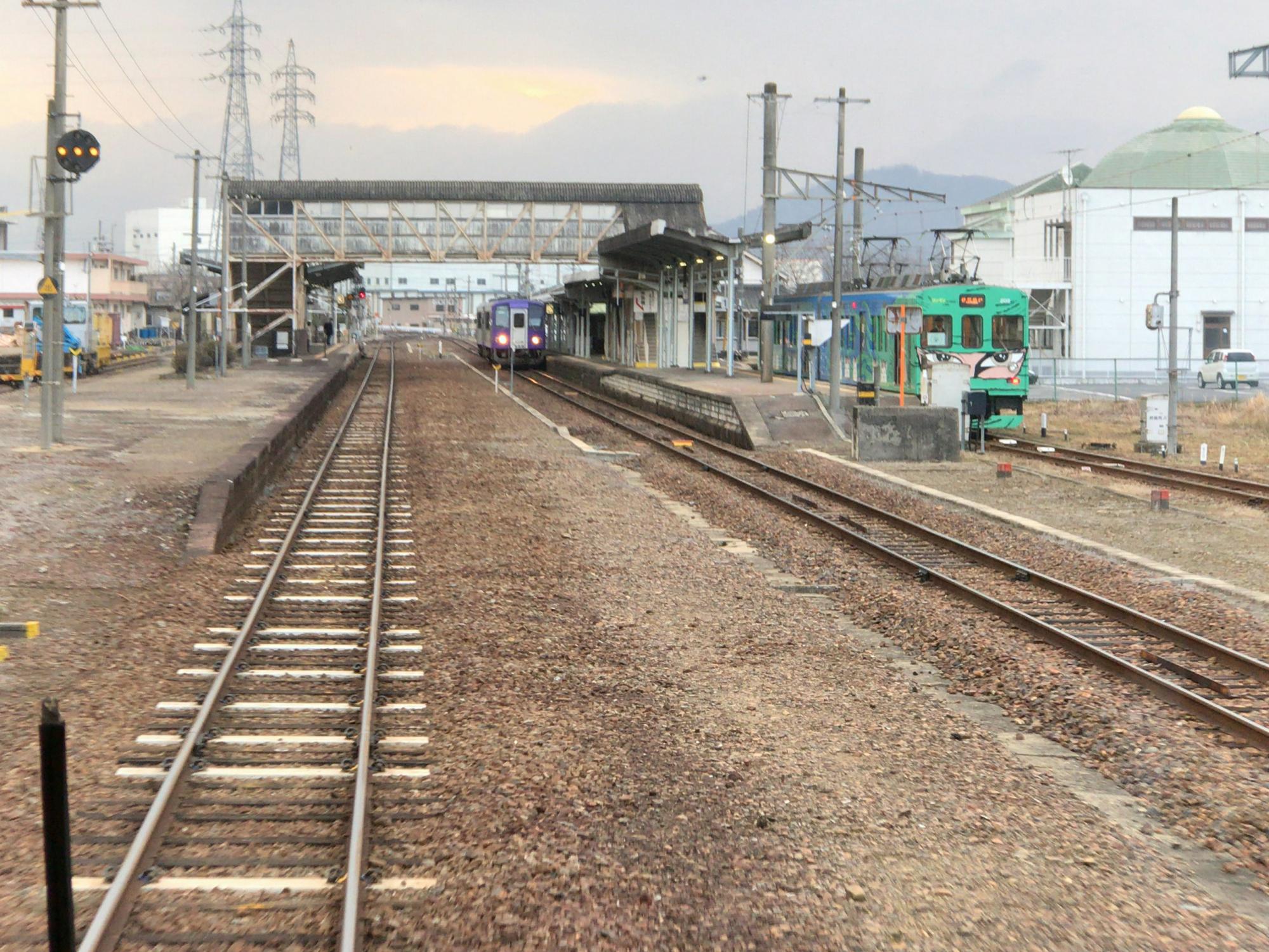 大垣で養老鉄道と樽見鉄道。ライトが小さく見えるのが養老鉄道の電車で昔の近鉄のカラーです。