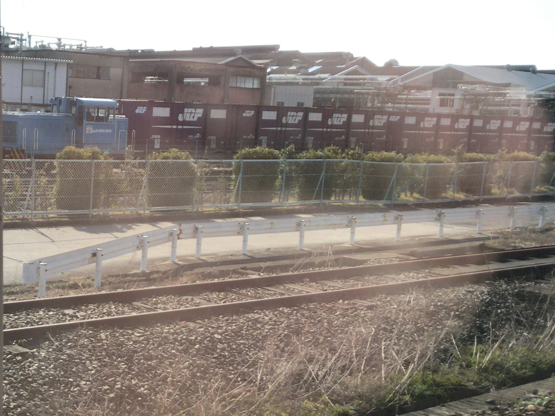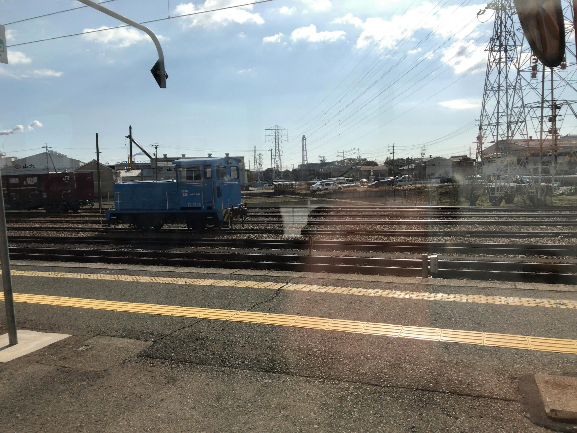 南四日市駅の東側に貨物ヤードがあって水色のスイッチャー(入替用ディーゼル機)が2台。L型がDB20、凸型がDB25です。ここから1kmほど、JSR四日市工場の専用線が現役です。機関車は山九株式会社の所属で、山九が専用線のオペレーションを受託しているということのようです。