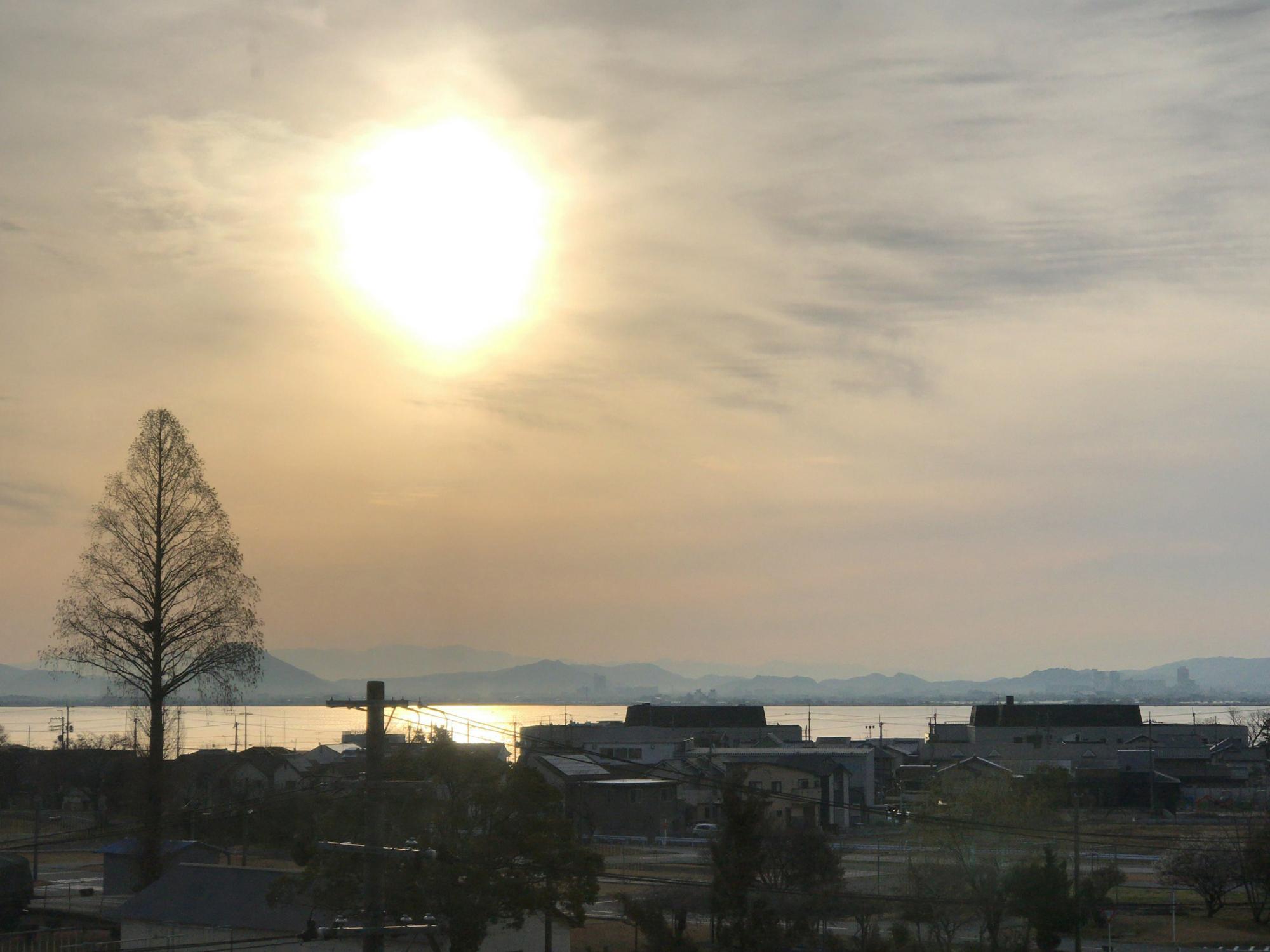 湖西線車窓の朝日と琵琶湖とメタセコイア。