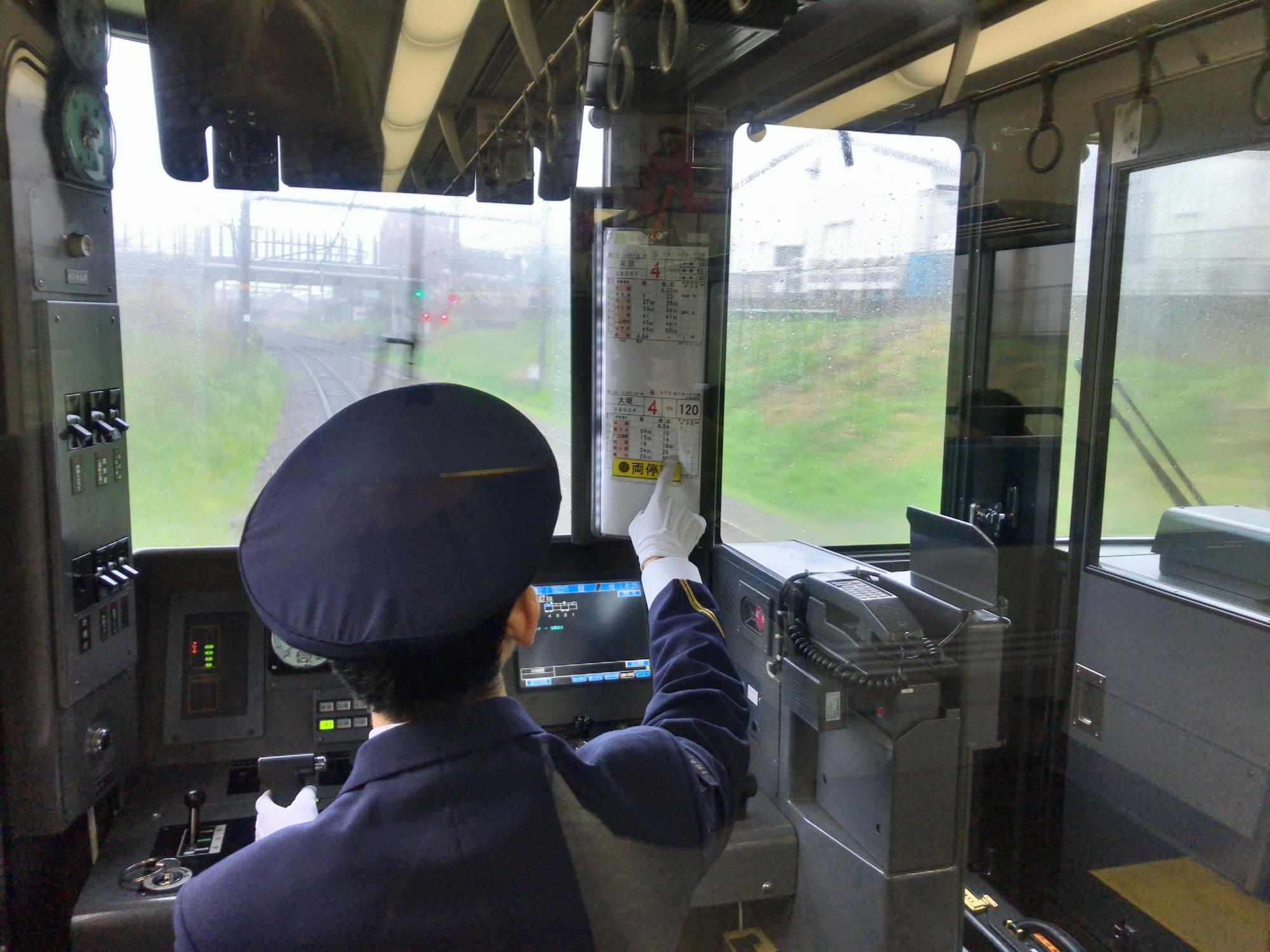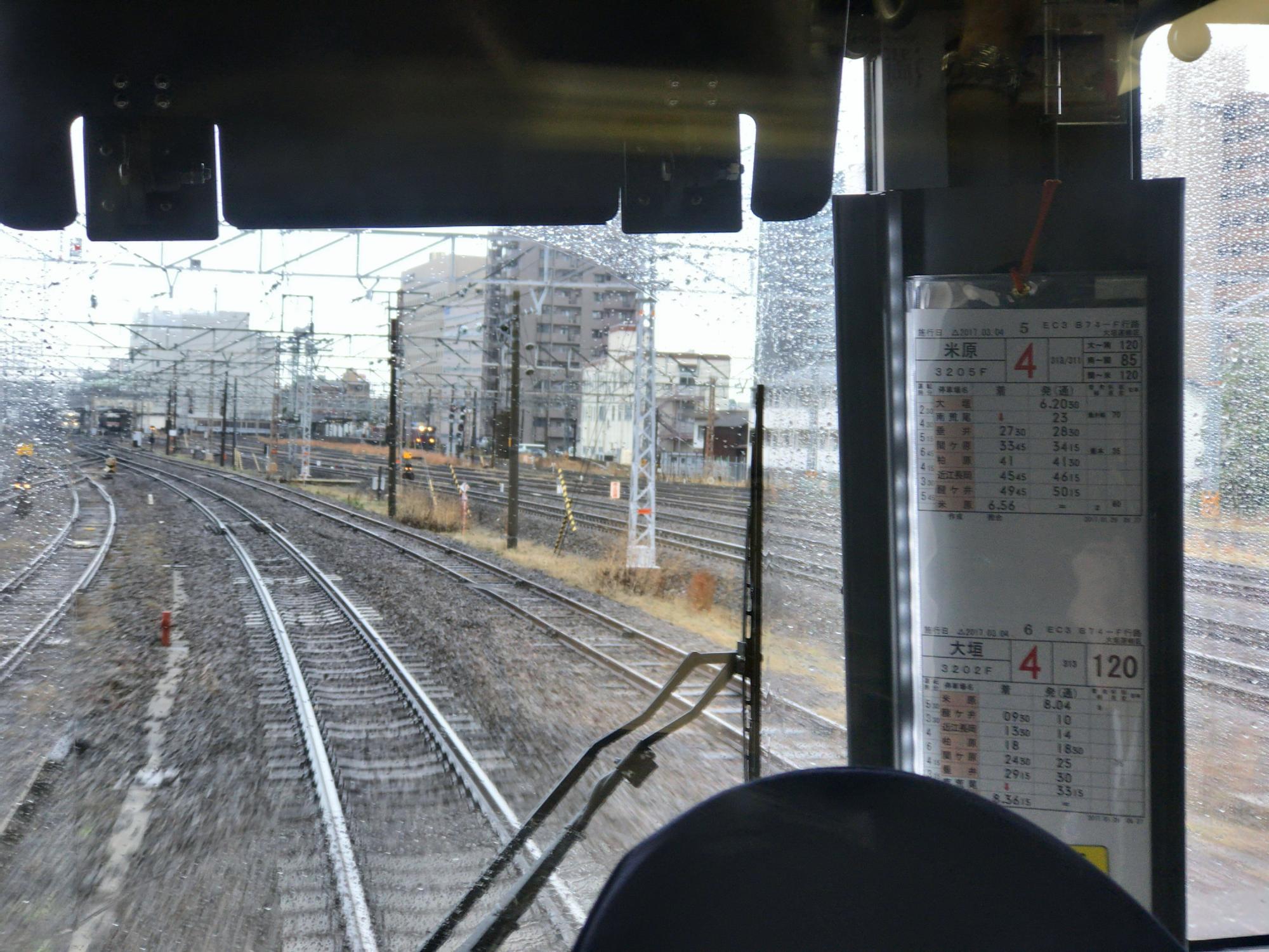 JR東海313系のかぶりつき、普通電車でも120km/hで飛ばします。運転士さんが行路表の発着時間をかなり神経質にチェック、黄色いプレートが磁石板になっていて、駅ごとにこのプレートをずらして何度も指差し確認しています。乗り換えた電車の運転手さんも同様、他の鉄道会社では見たことのない動作で、JR東海は定時運行にかなり厳しい会社のようです。