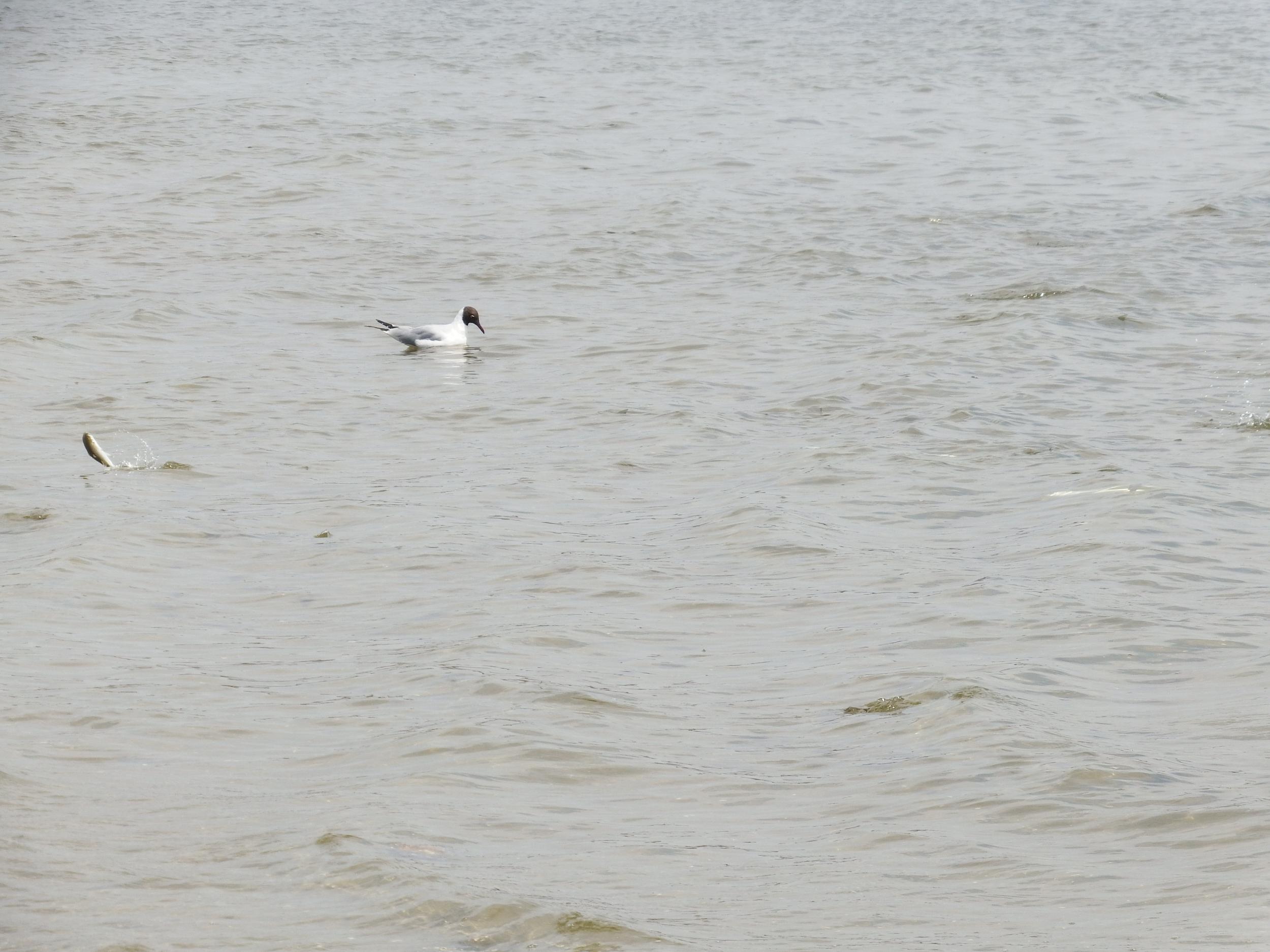 ガングロユリカモメを目印にじっとカメラを構えて動画を撮ってみました。撮ってる時には気づかなかったものの、ジャンプしなくても水面すれすれにかなりの数のボラが泳いでいるのが見えます。