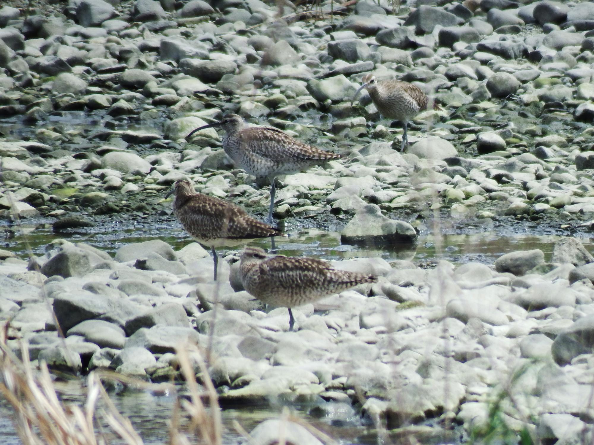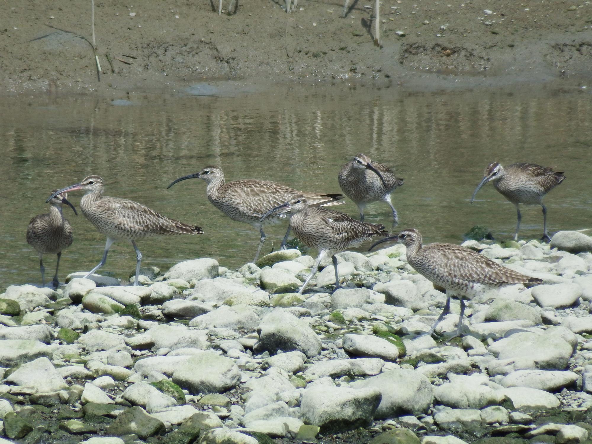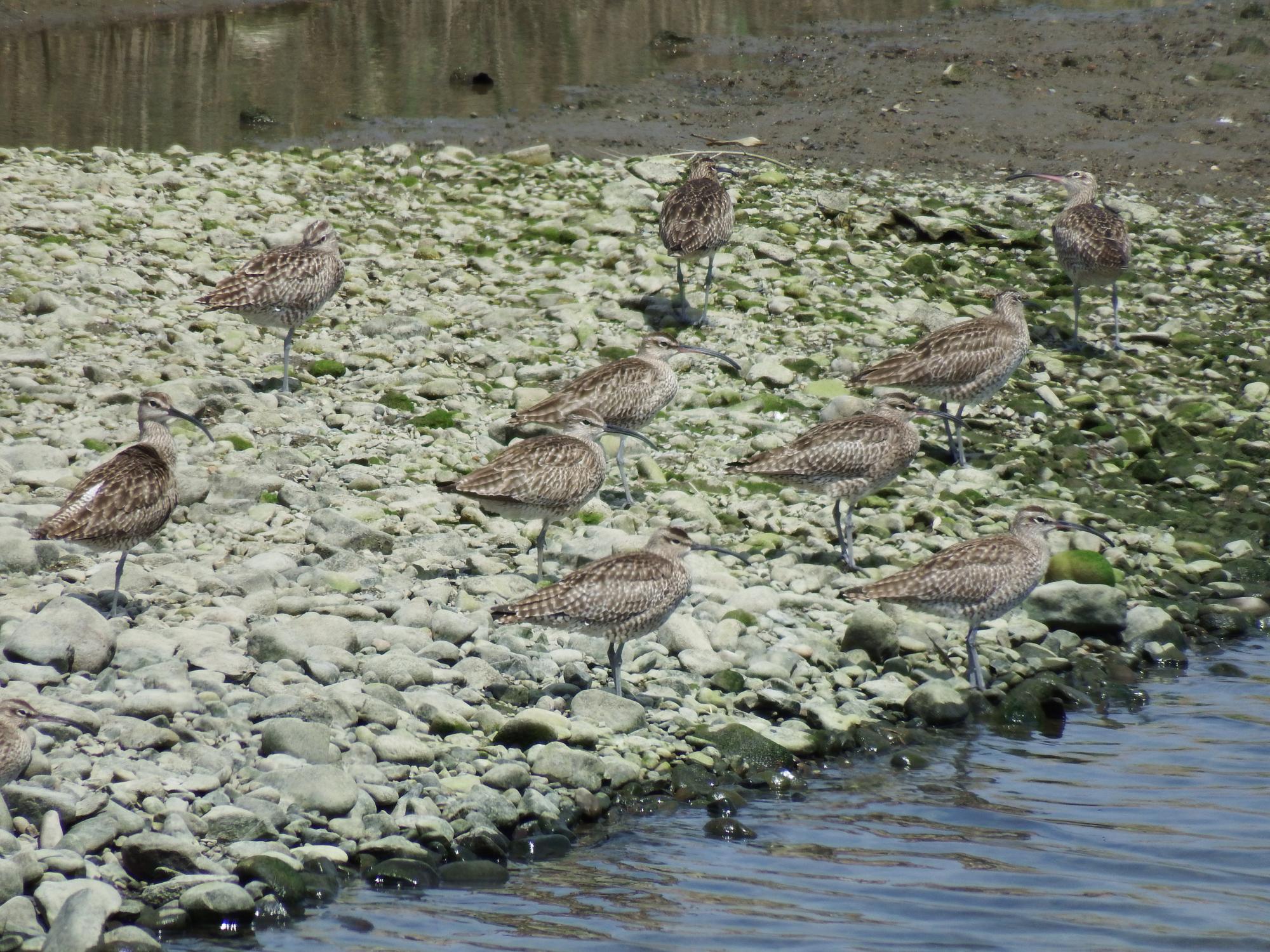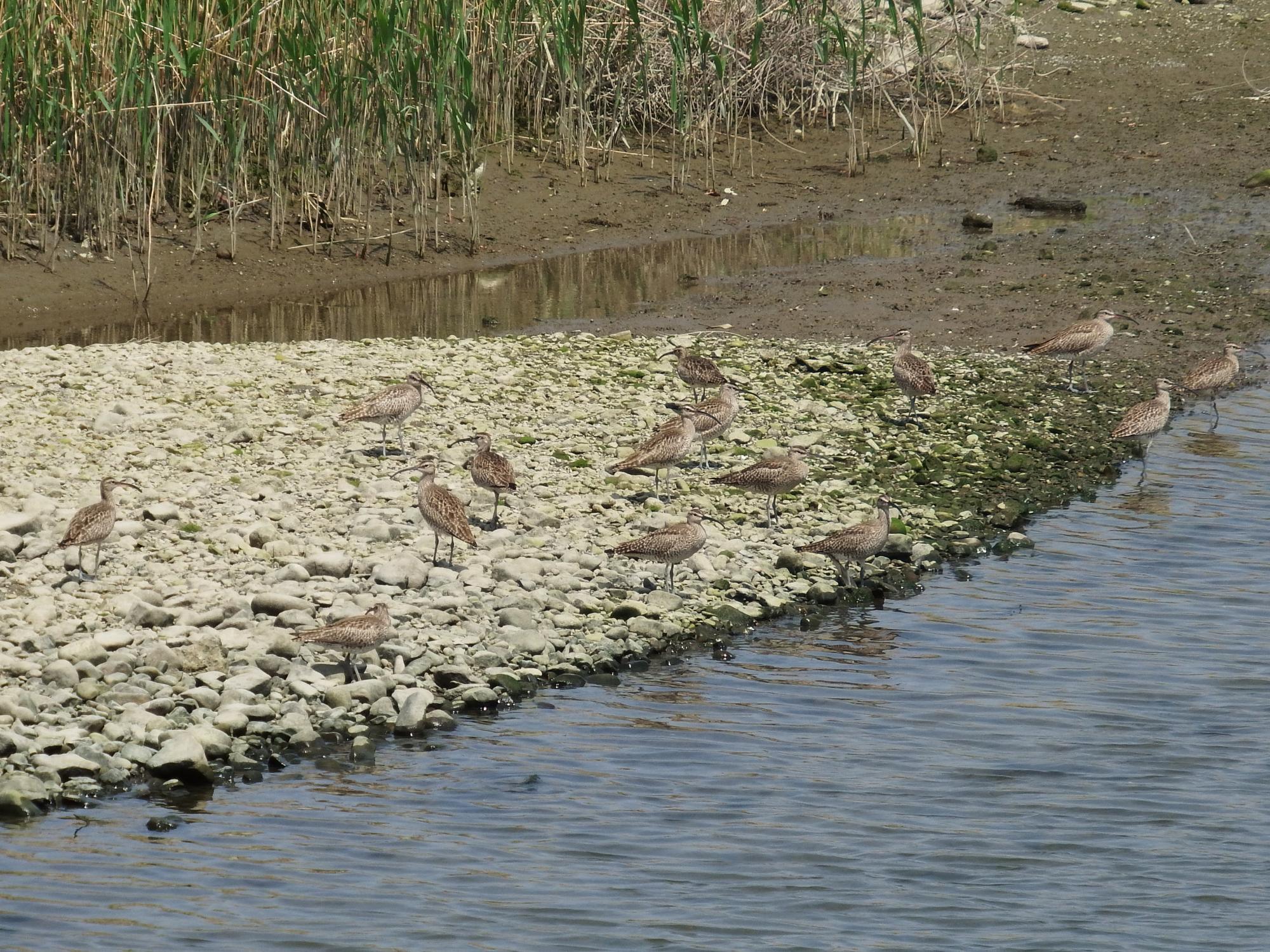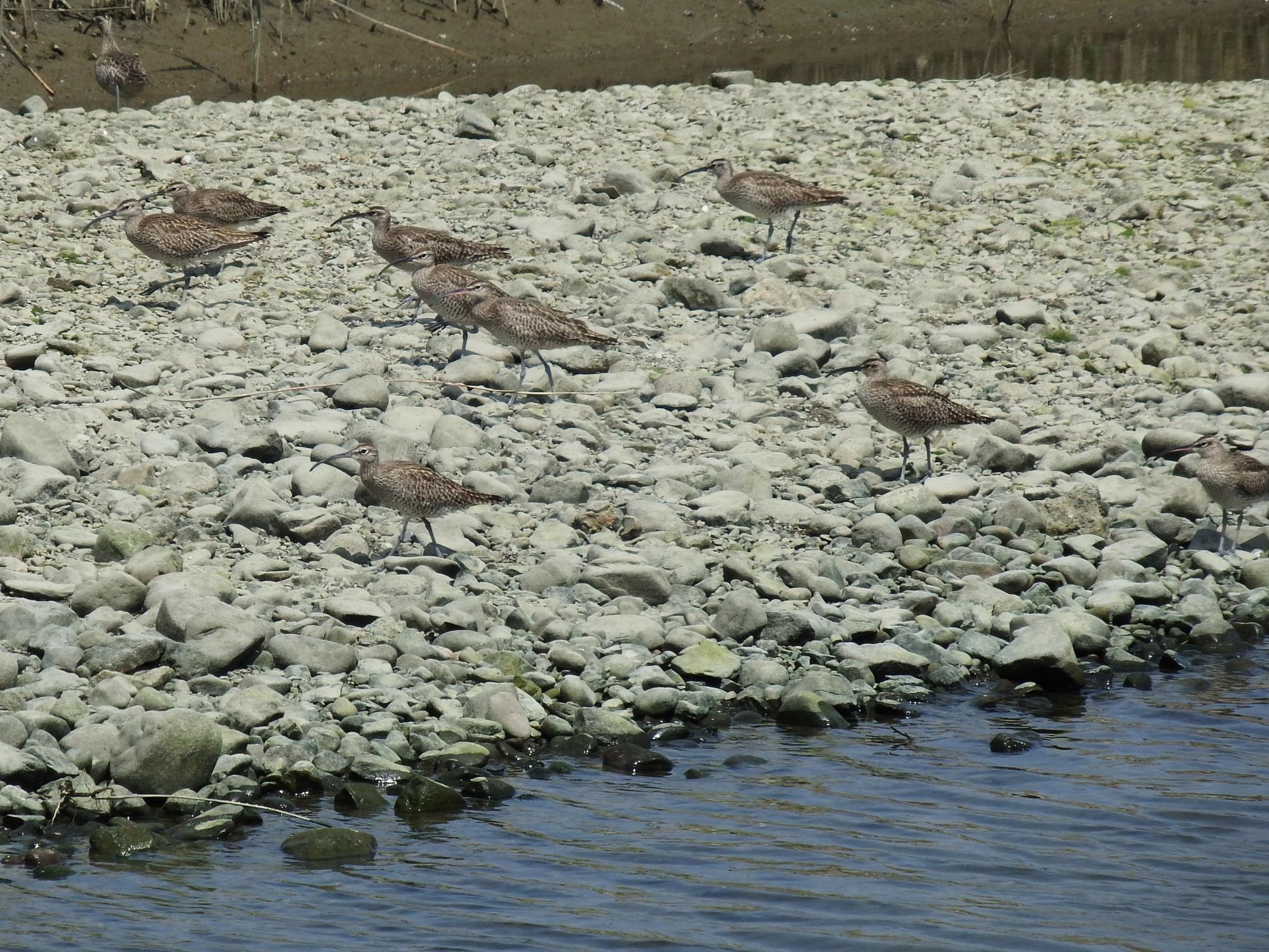 右岸の堤防のハシゴを登って川の中州をチェックしてみると、チュウシャクシギが15羽。チュウシャクシギをこれだけまとめてみたのは初めて。