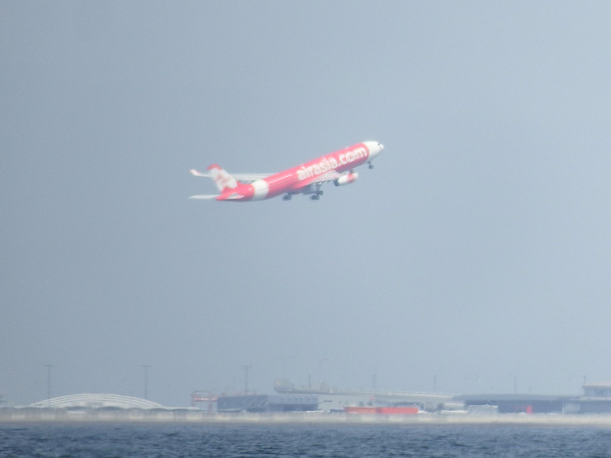 左岸先端の石積みの堤防に座って、関空を離陸する飛行機を眺めながらランチ。エアアジアA333クアラルンプール行とスターフライヤーA320羽田行。