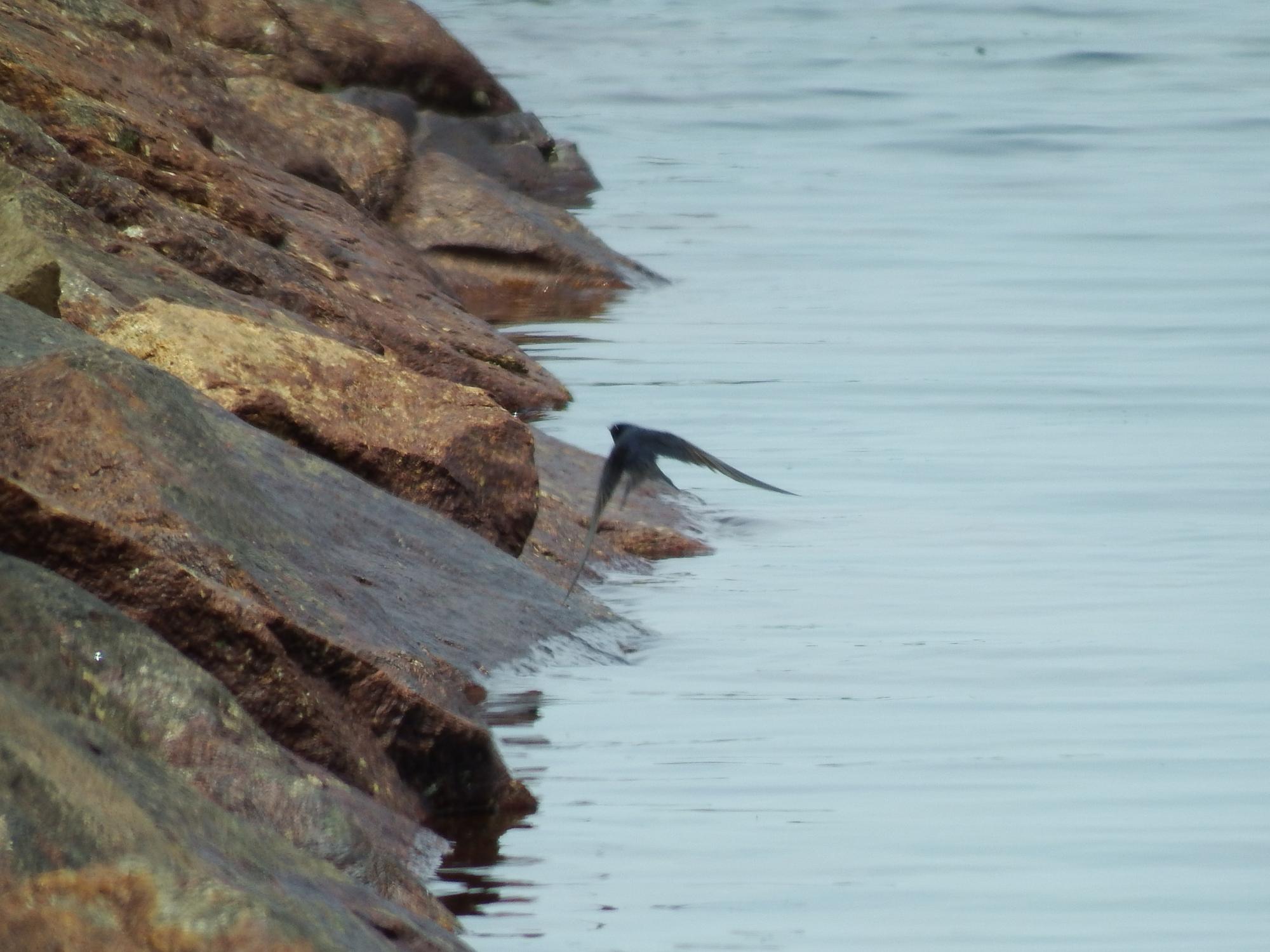 石積みの堤防に戻ってしばし腰をおろします。何羽かのツバメが舞っていて、よく見ると、同じコースを巡回しています。堤防に並行して低空飛行がコースに含まれていて、ツバメの飛行シーンが撮れました。