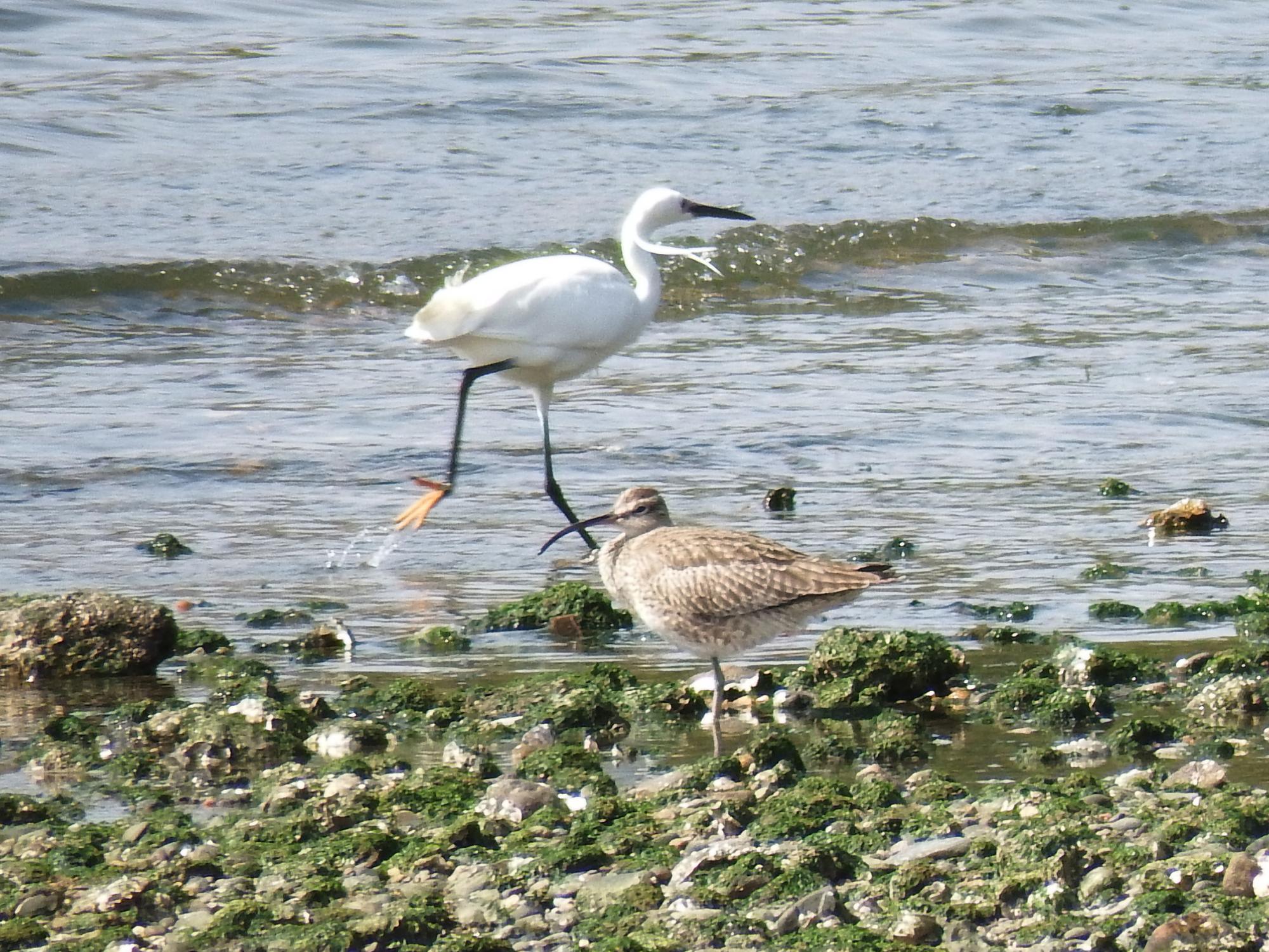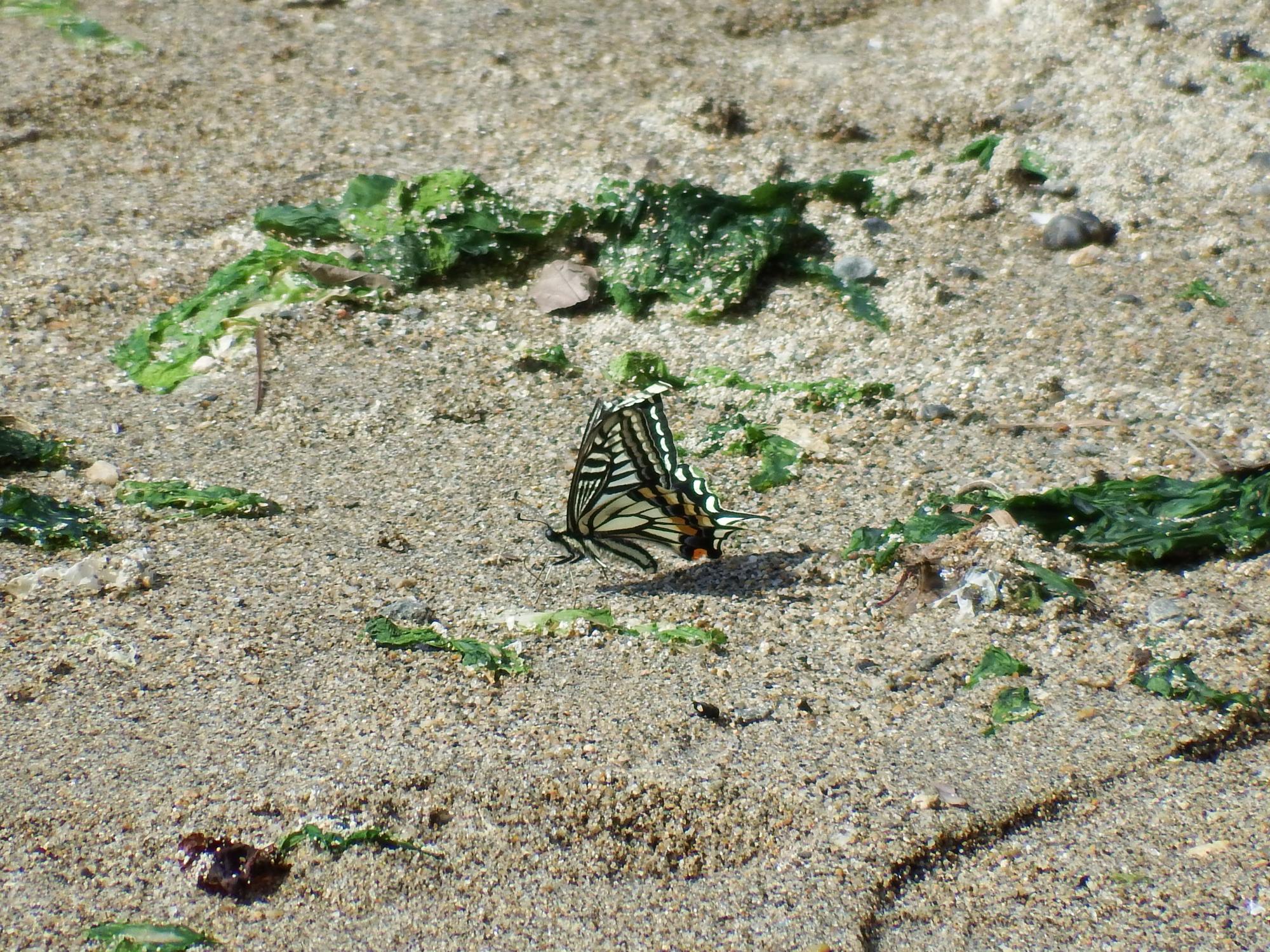 チュウシャクシギとダイサギのツーショット。浜に小さなナミアゲハが降り立ちました。春のナミアゲハは夏のナミアゲハよりずいぶん小さいです。