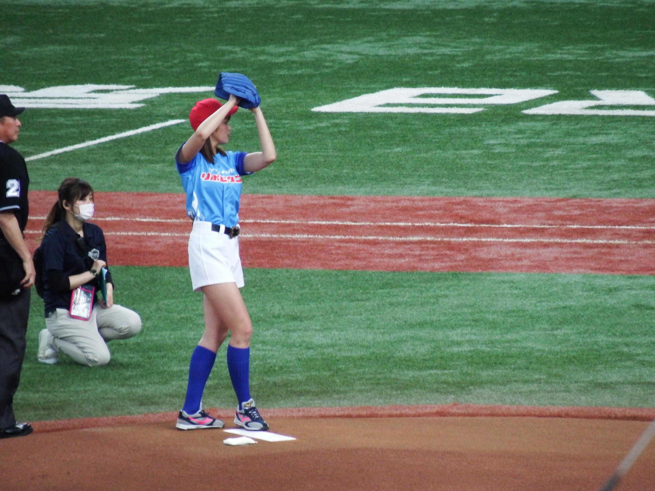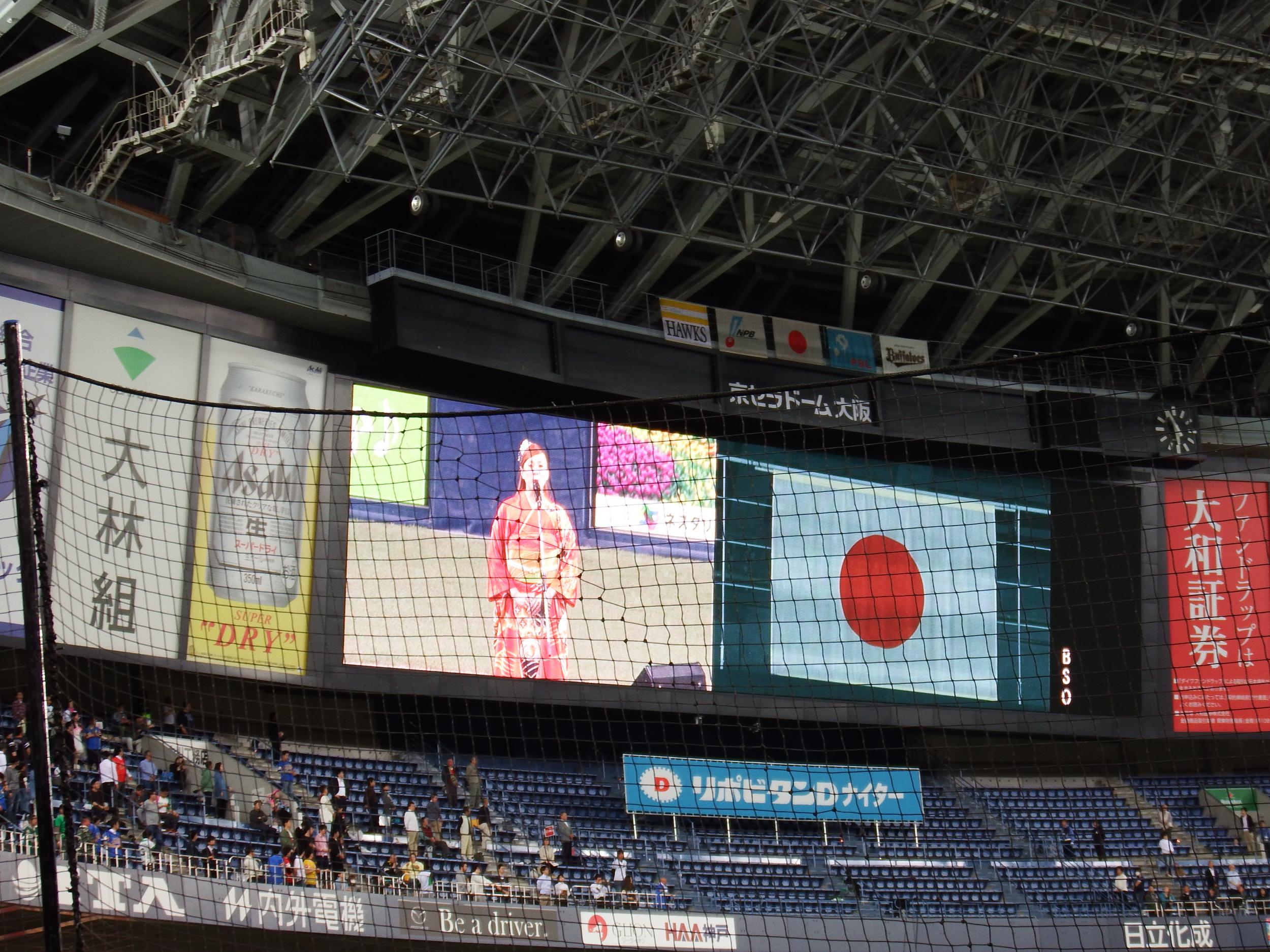 国歌独唱と始球式があって、かなりのビッグイベント扱いです。始球式は稲村亜美さん。そうそう太田幸司さんも来ていましたが、ぎっくり腰で今日は投げられないとのこと、かつての甲子園のアイドルもええおっちゃんになってました。