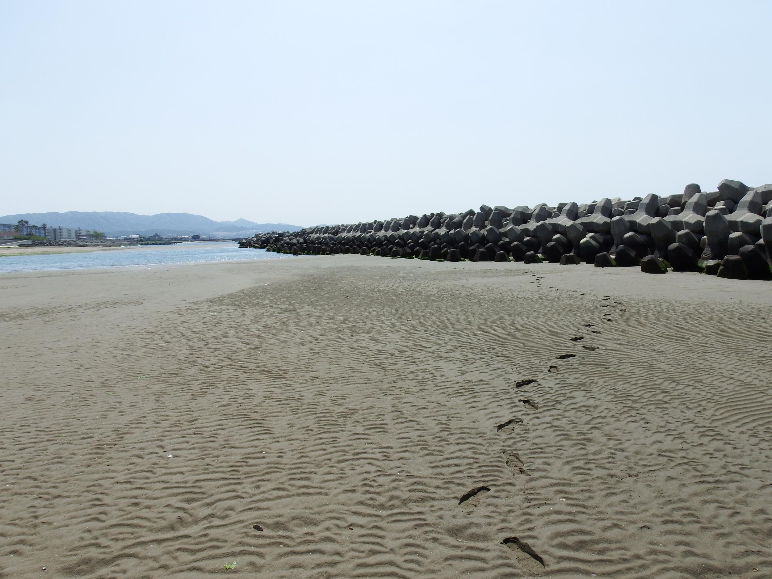 尾崎の浜のハマヒルガオ。大潮の干潮なので、テトラポッドの防波堤まで歩いて行けます。普段は水の底の浜辺に自分の足跡。