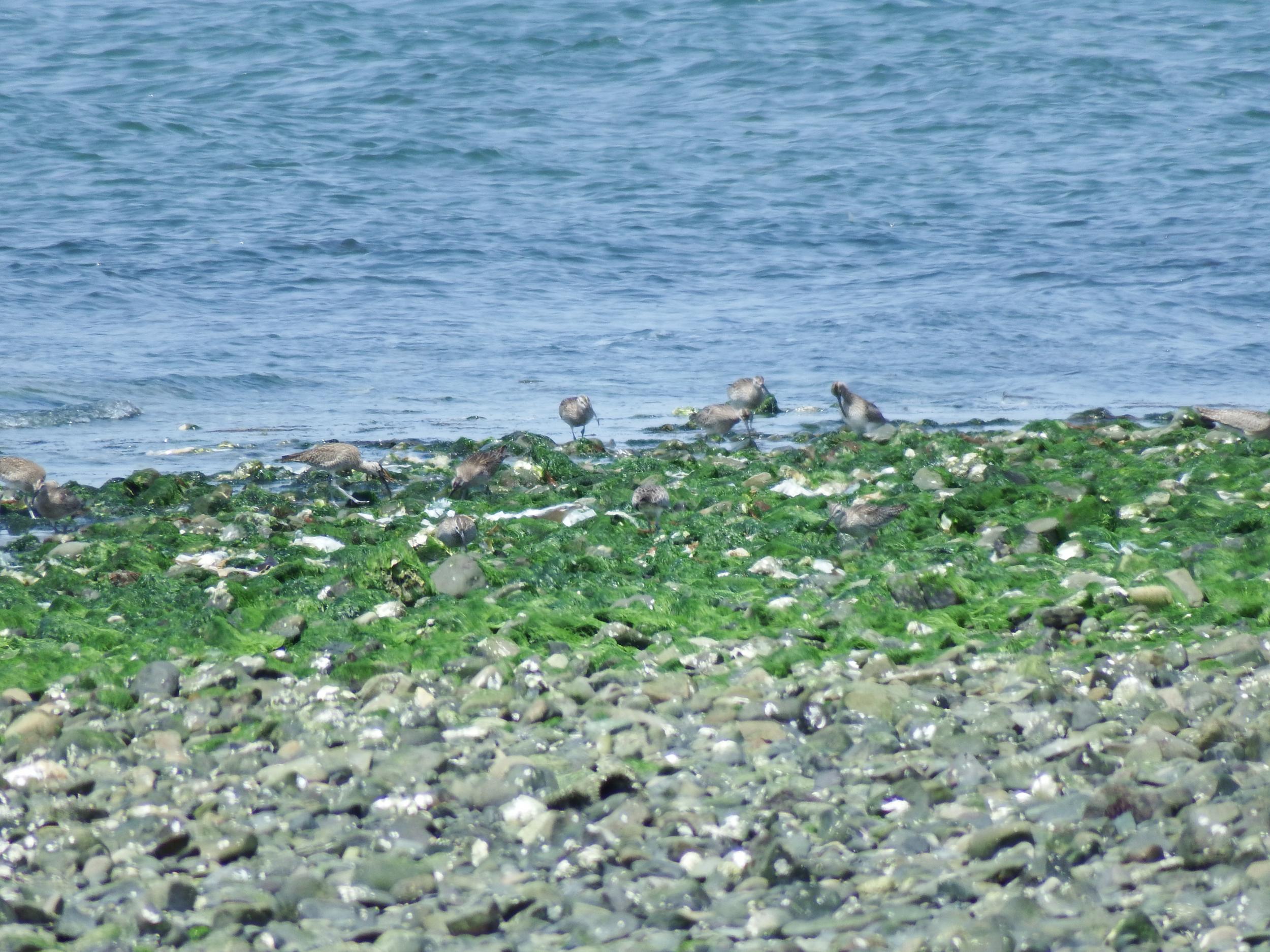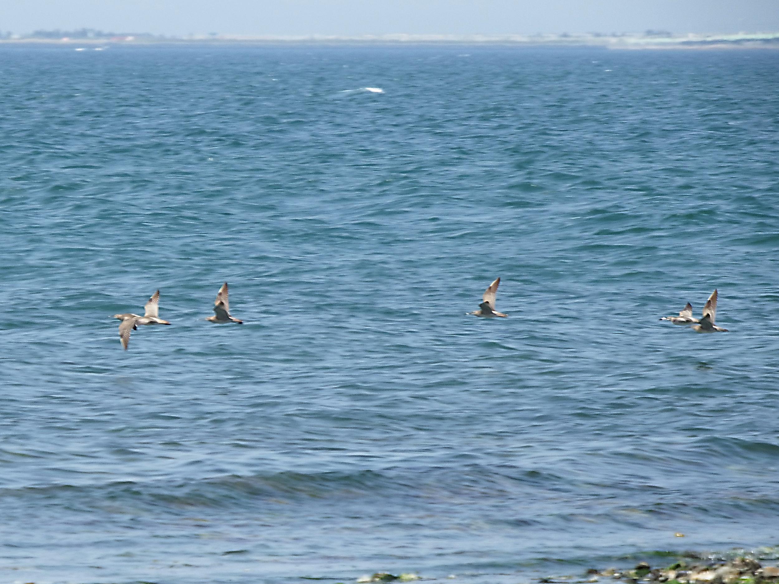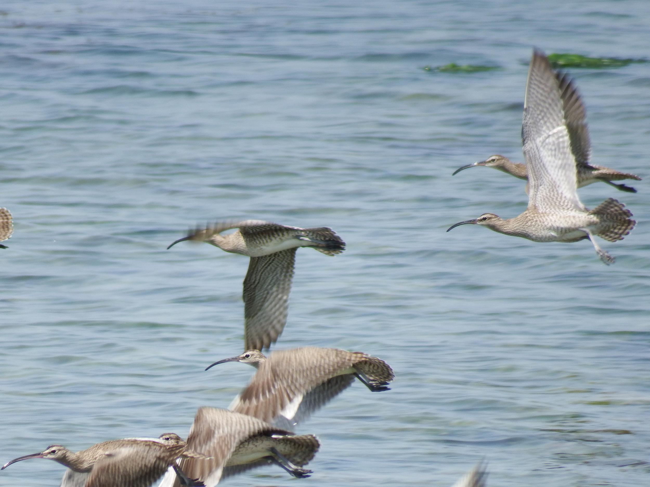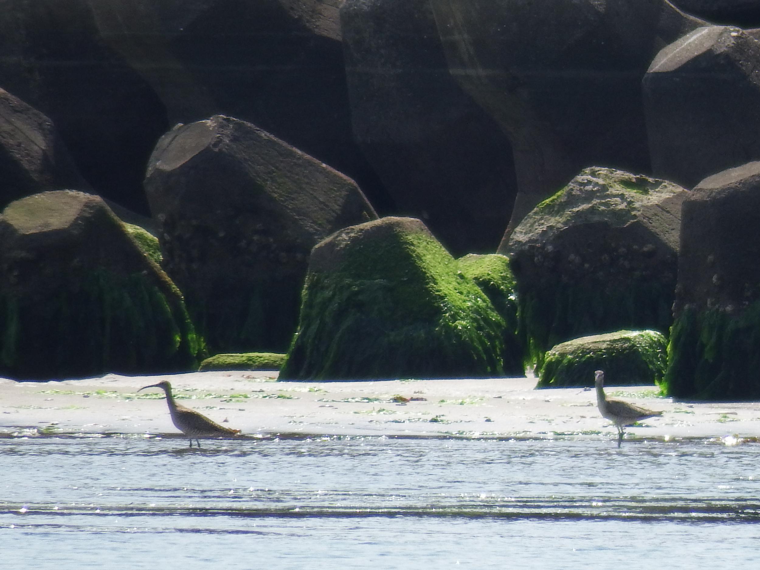 男里川河口へ抜ける消波用の石垣の上を歩いていたら、バタバタバタっと15羽くらいのチュウシャクシギが飛び立ちました。