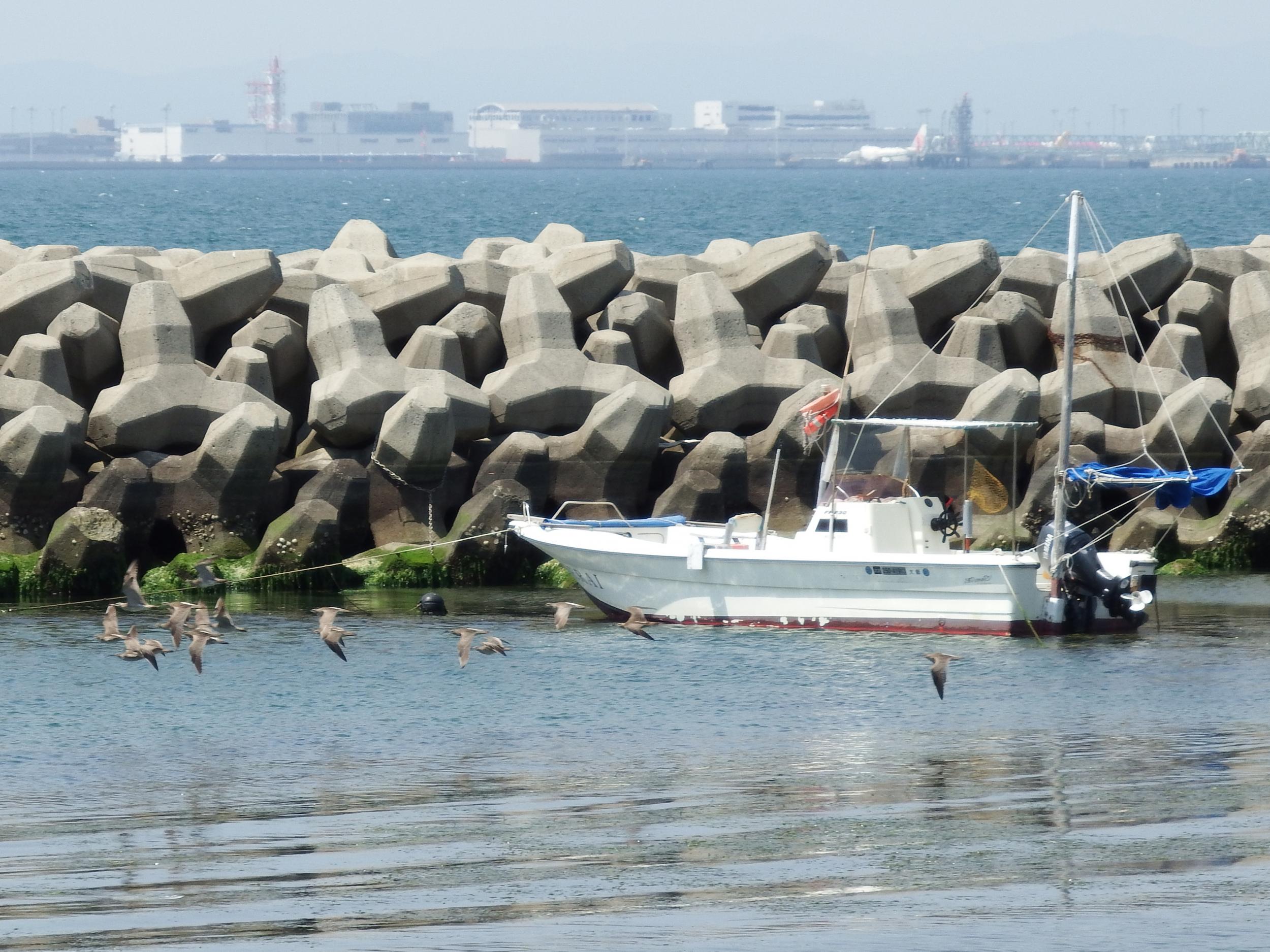 チュウシャクシギたちが飛ぶ向こうのテトラポッドのさらに向こうには中華航空のジャンボが見えます。