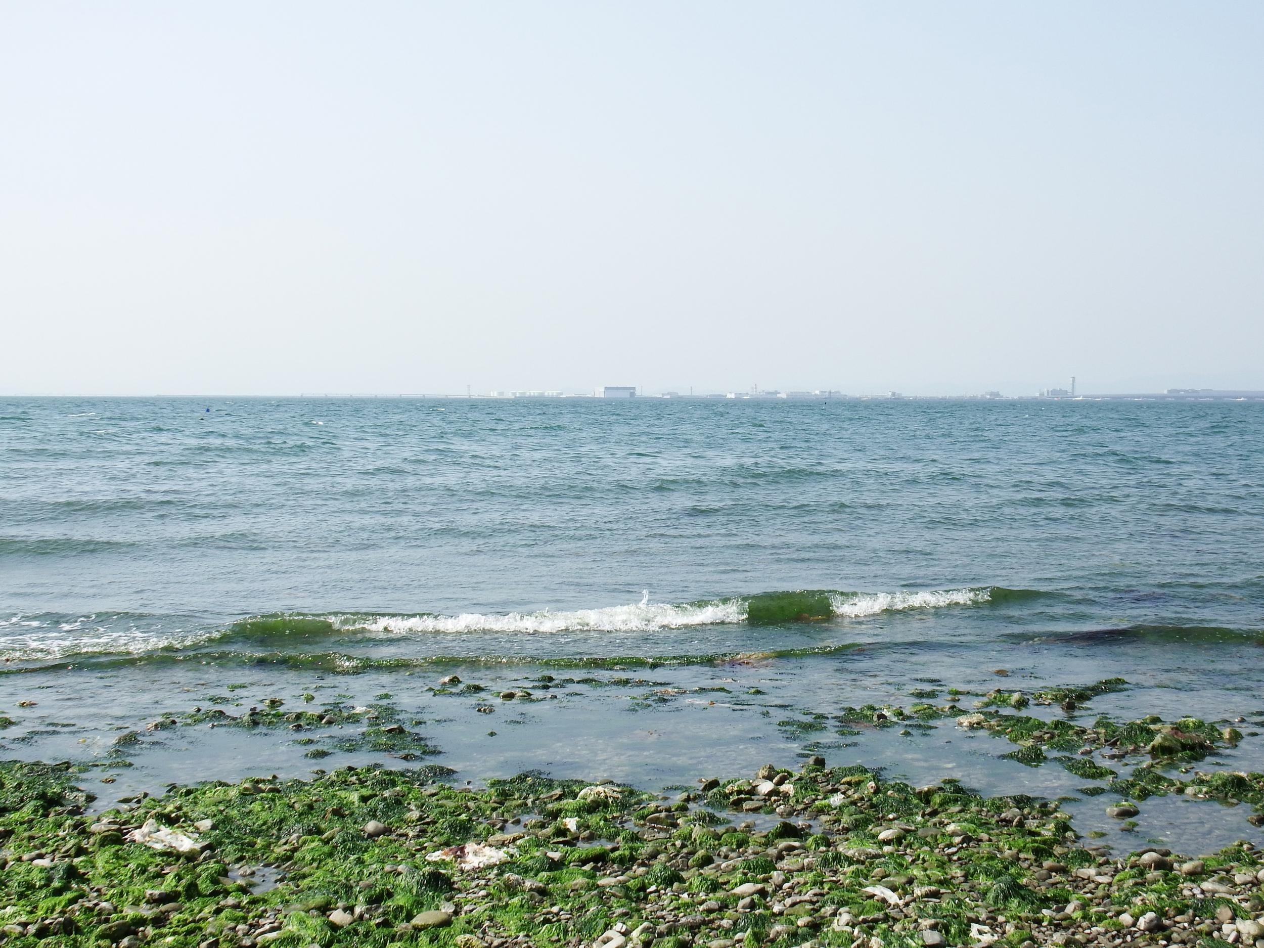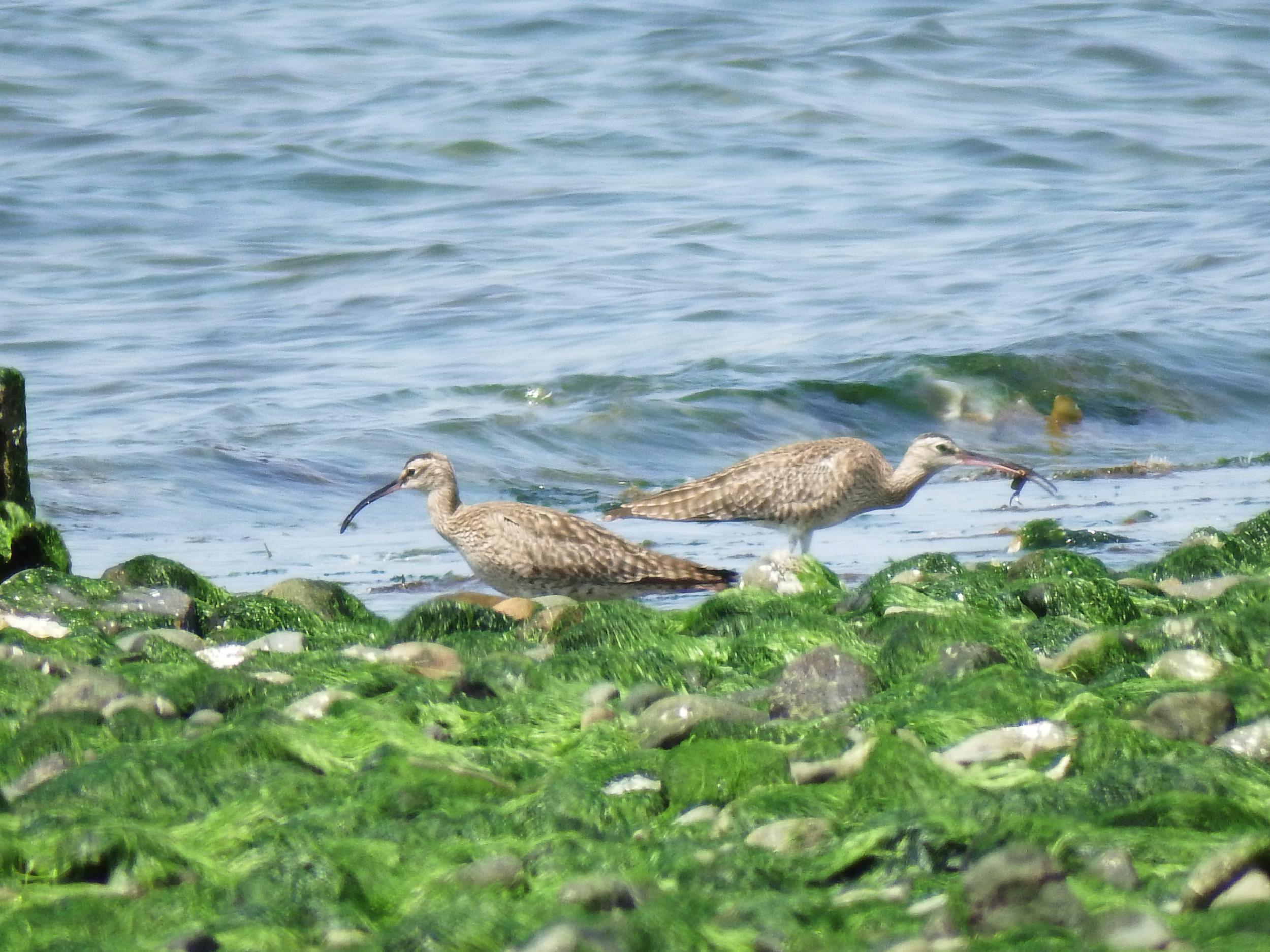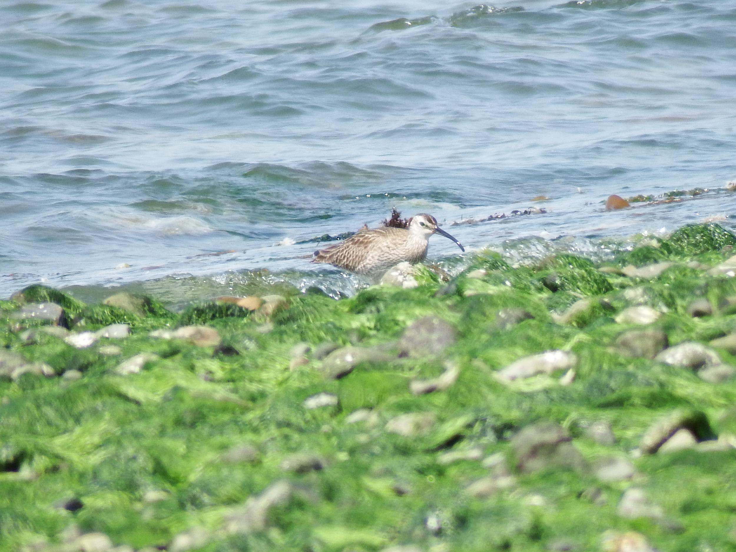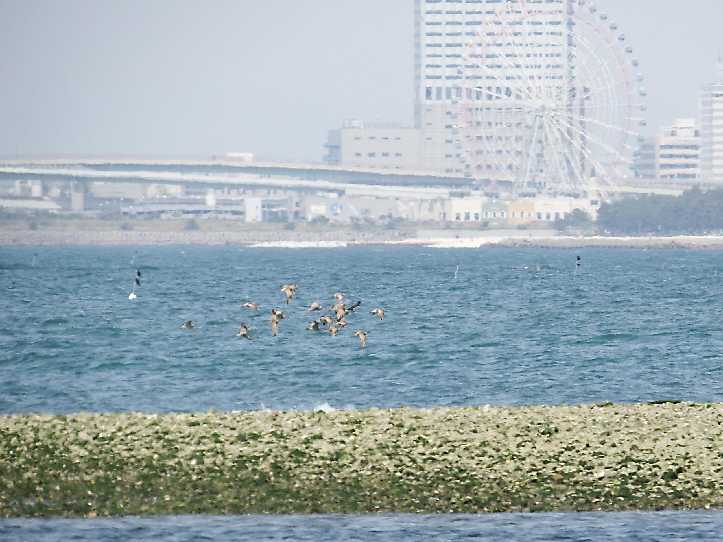 男里川河口左岸に到着、水辺にチュウシャクシギ。こちらもバタバタバタっと飛び上がったものの、遠くへは行かないようです。背景はりんくうタウン。