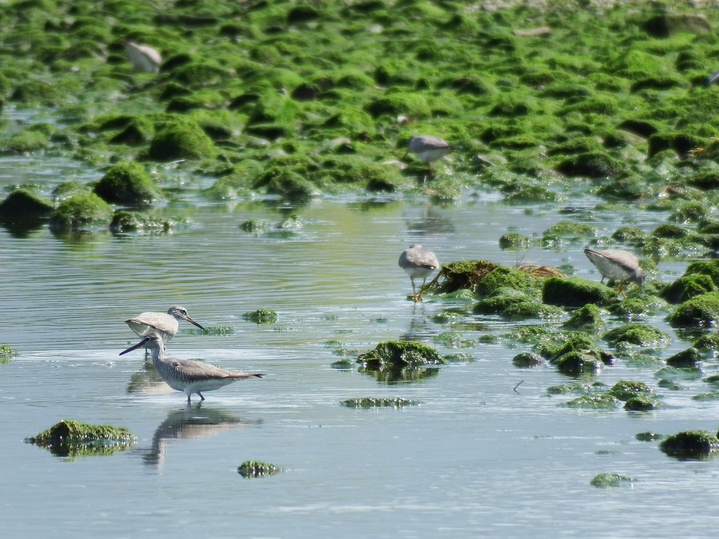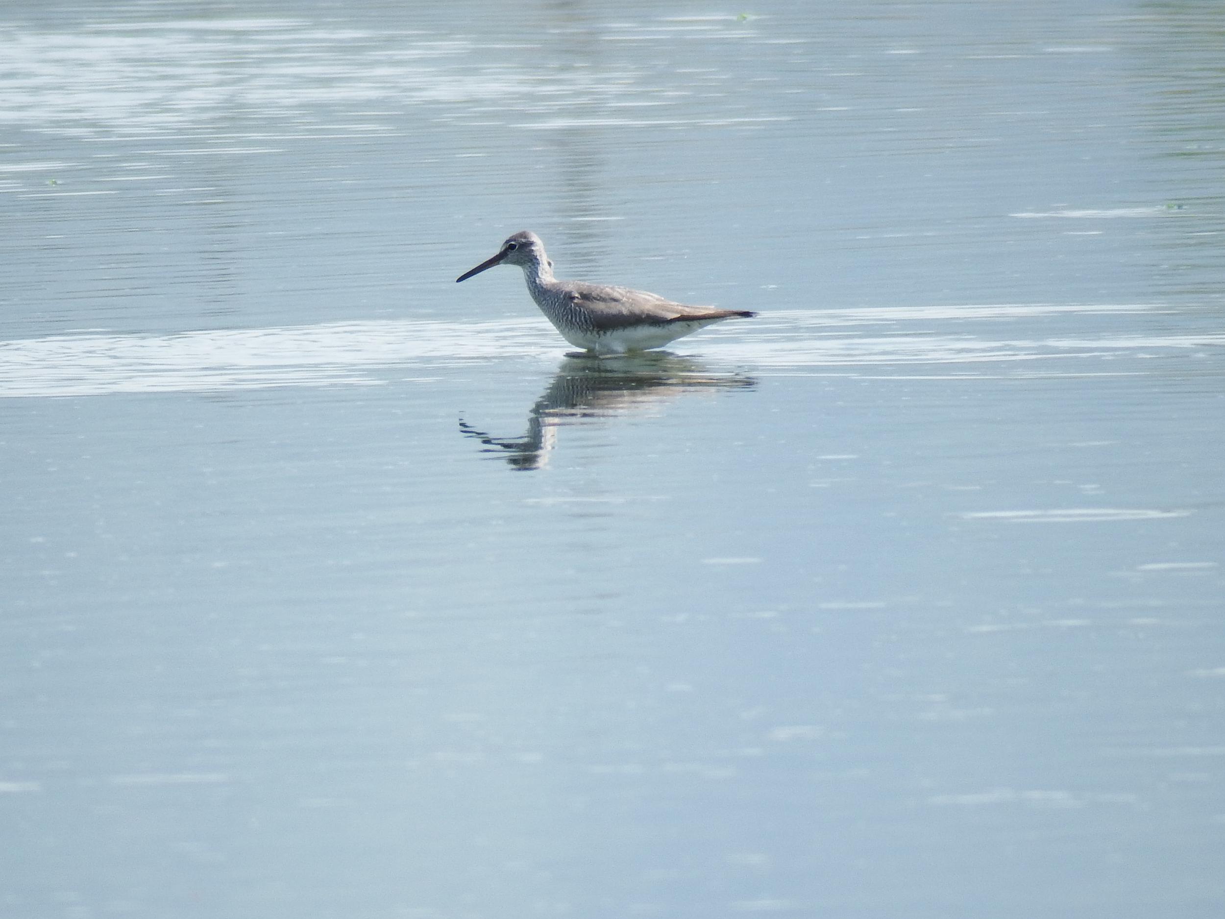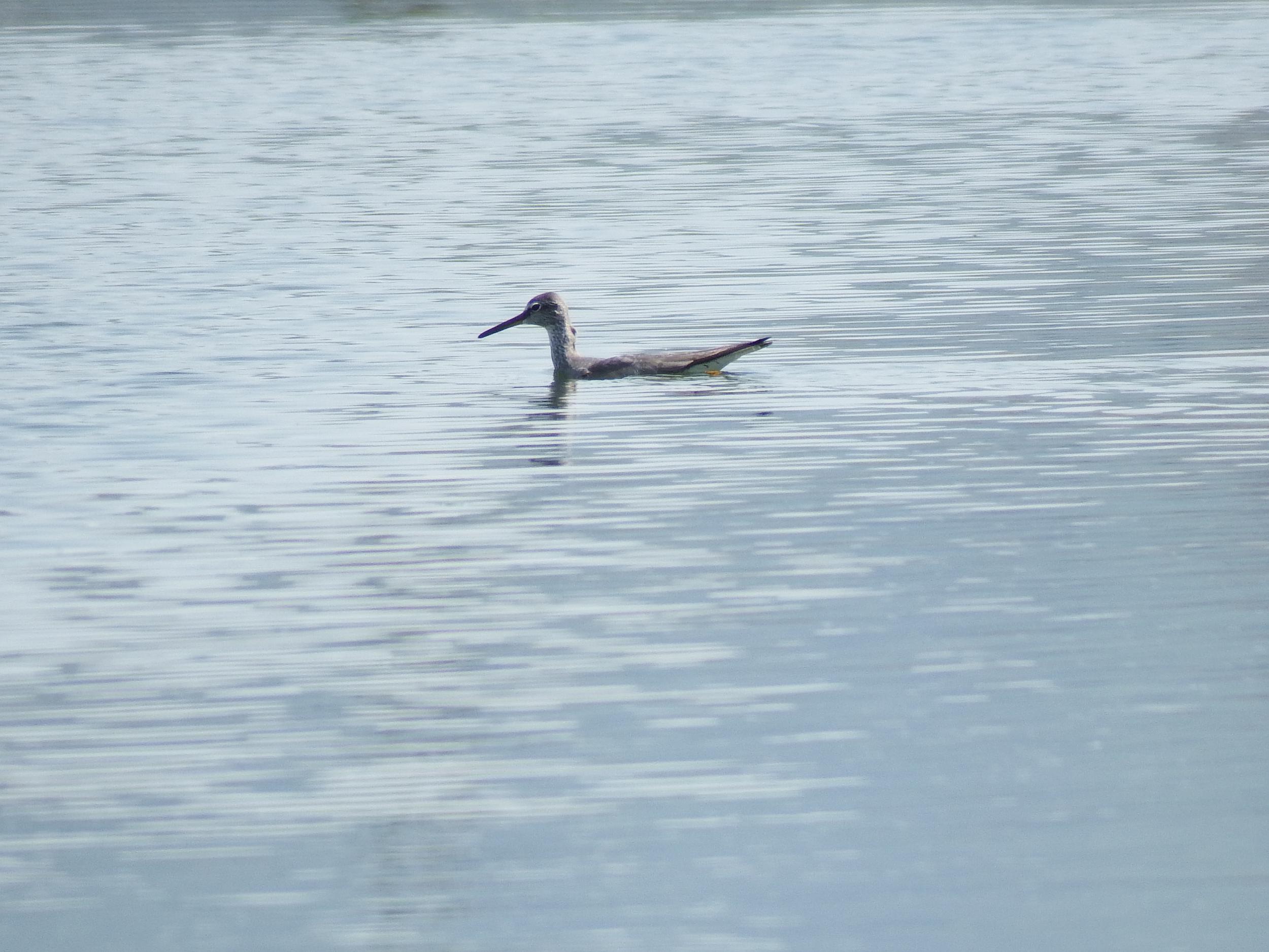 なんと、キアシシギが泳いでます! 黄色い足がカモのような位置に見えます。キアシシギにかぎらず、水掻きのないシギチが泳ぐのを見るのは初めてで感動。