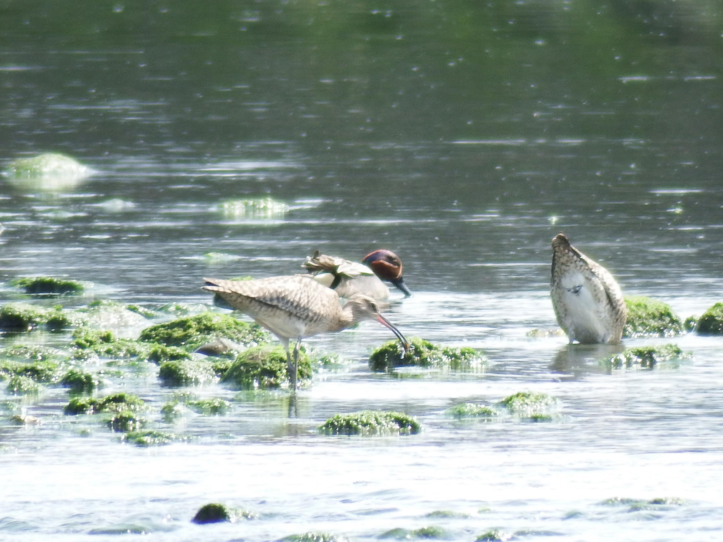 チュウシャクシギとコガモ、それにキアシシギも仲良く一緒にお食事。