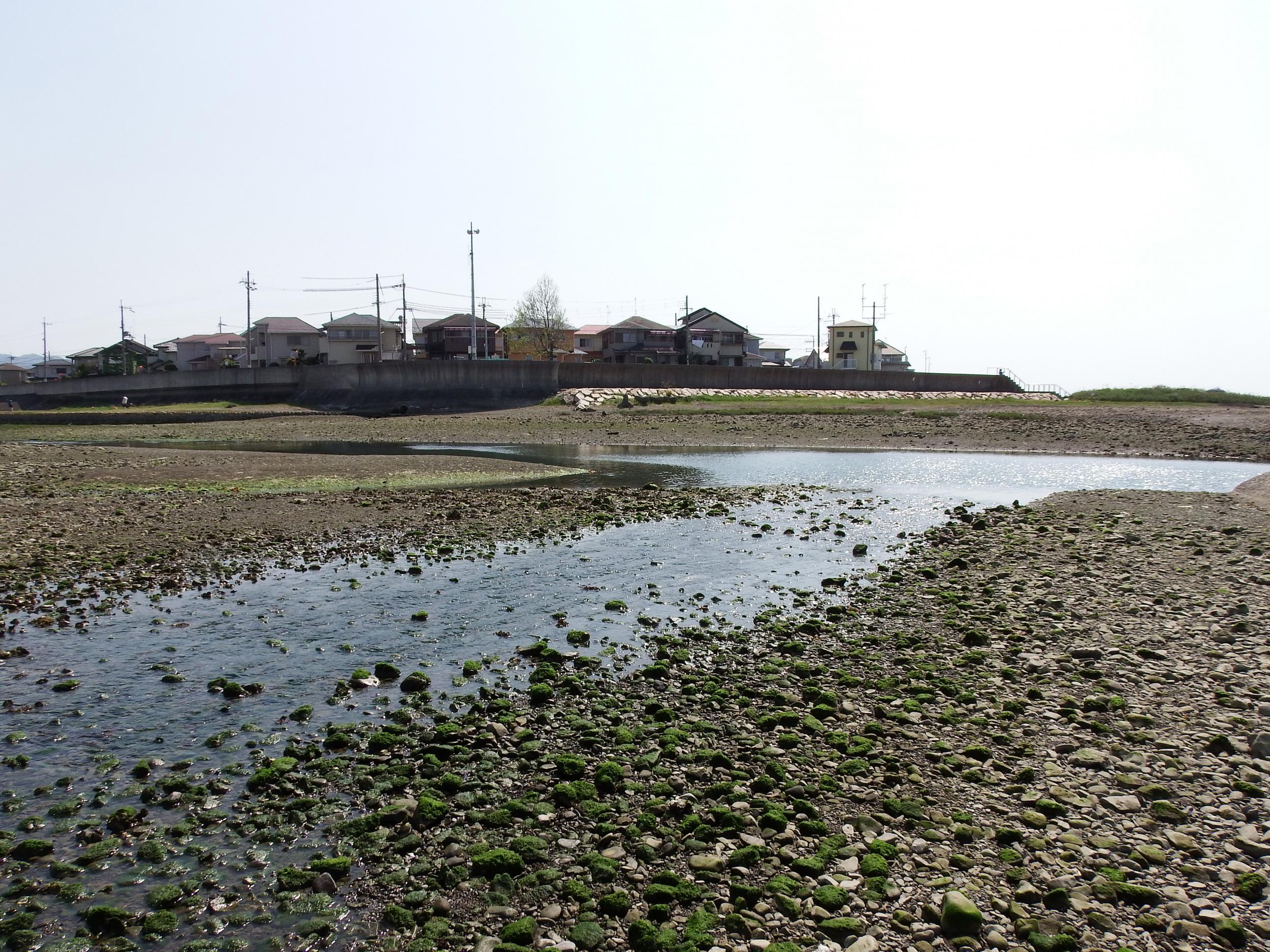 大潮の干潮で河川敷が大きく広がっていて、男里川右岸の泉南市側へ歩いて渡れそうと気が付きました。見ていると小さな女の子が、川を歩いて渡ってきて、家族に自慢しています。自分も試してみます。