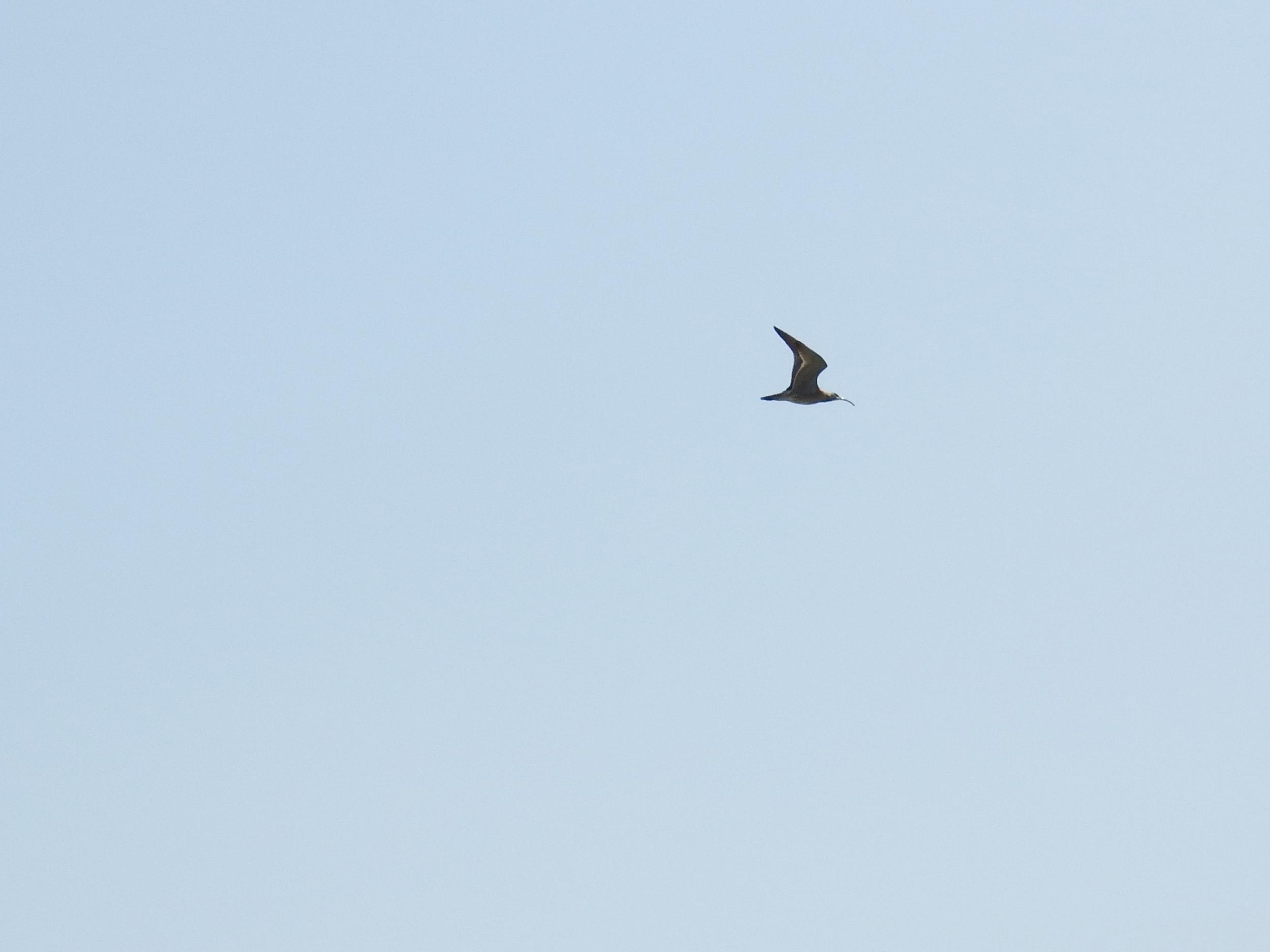 干潟の先端まで歩いてきました。満潮時より100mくらい沖だと思います。空にはチュウシャクシギのシルエット。