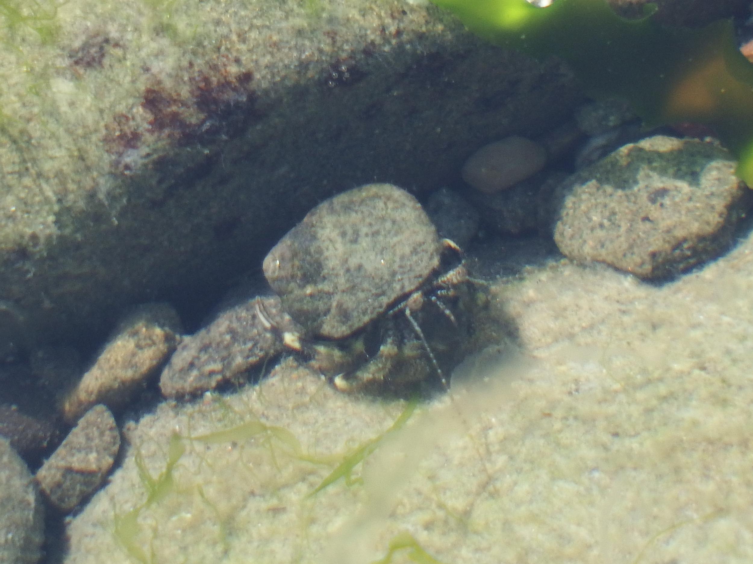 小さな潮溜まりができていて、よーく覗いてみると、いました、ヤドカリ。