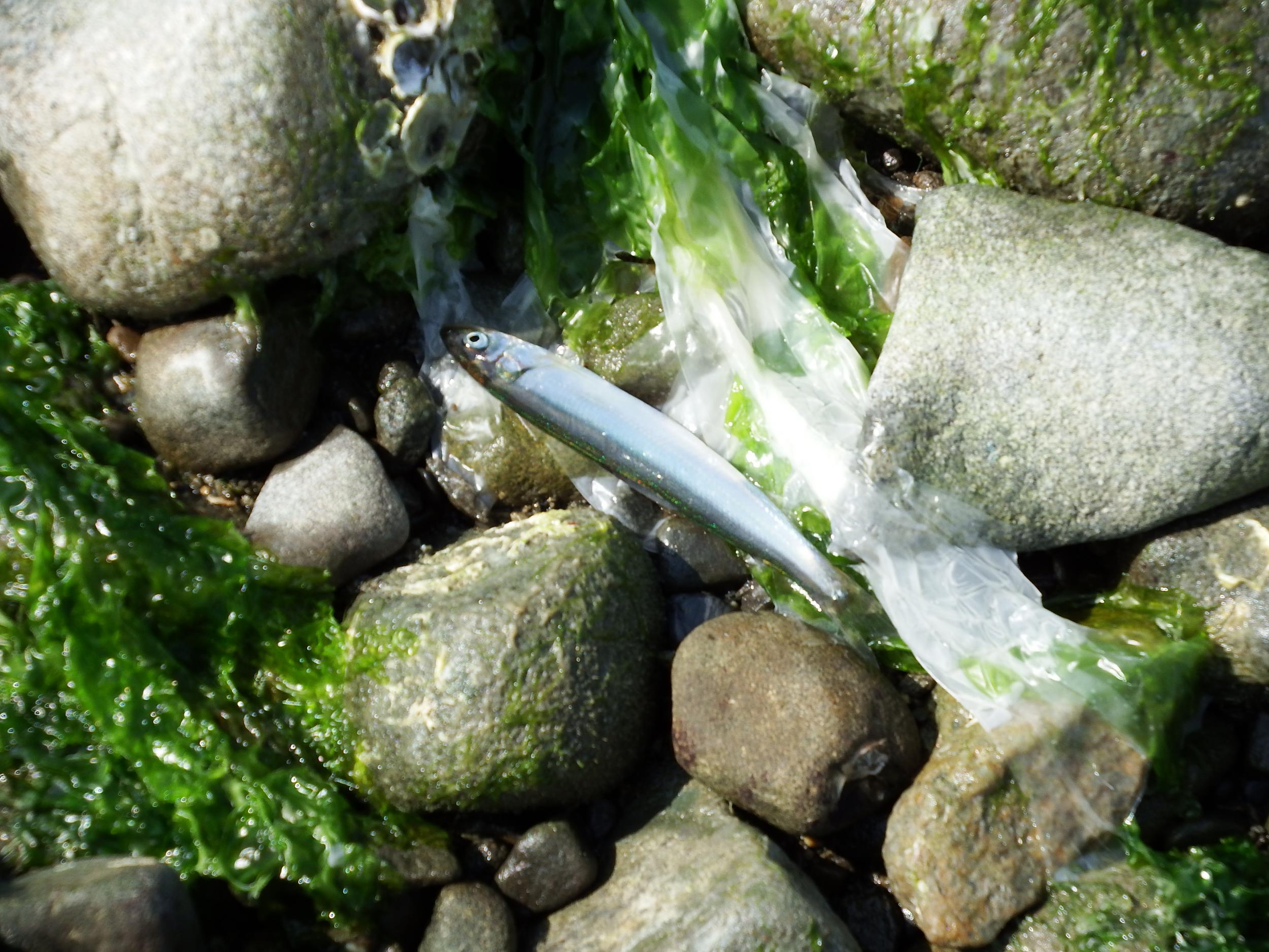 干潟に7cmくらいの魚が打ち上げられていました。カタクチイワシかと思います。まだピクピクしています。拾って海に返してあげました。遠からず玉手箱を持ってカタクチイワシが自分のところへお礼に来るはずです。