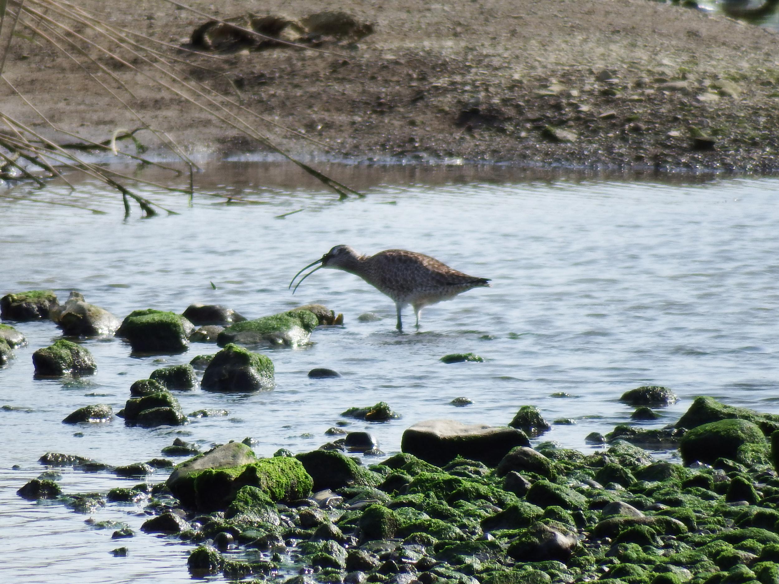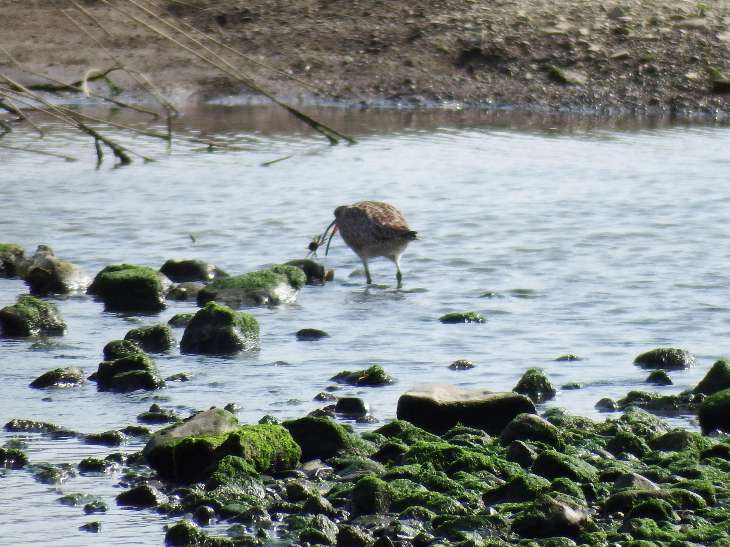 川の少し上流の中洲でチュウシャクシギがカニを捕まえ、飲み込んでいます。