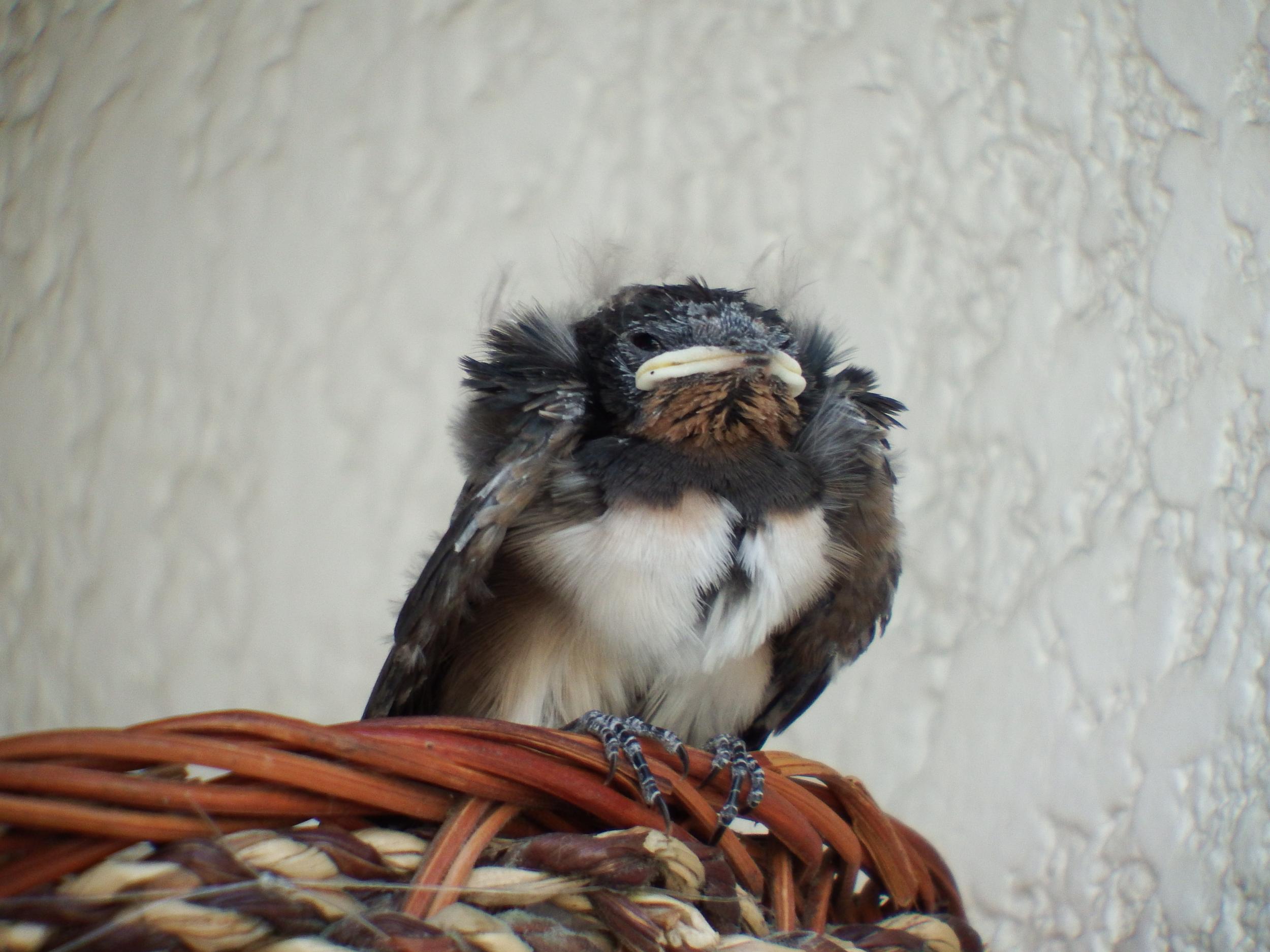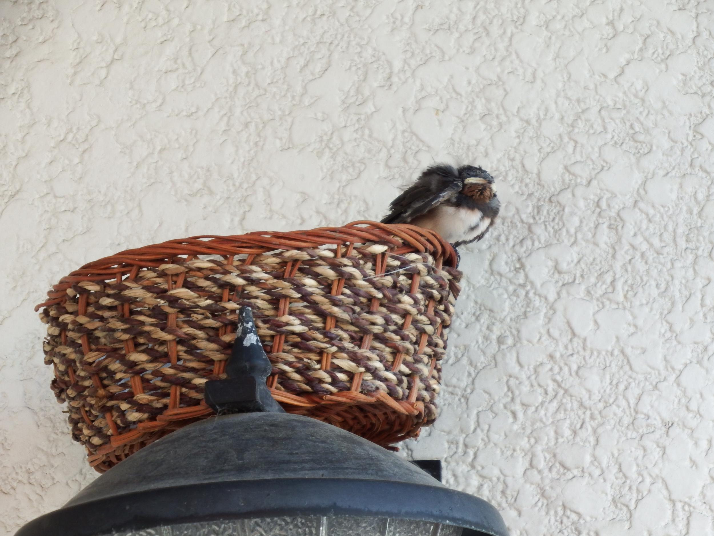 樽井駅近くのカラオケスナックのツバメの雛、スナックのママさんがおいてくれたと思われる籐カゴの巣が居心地よさそうです。