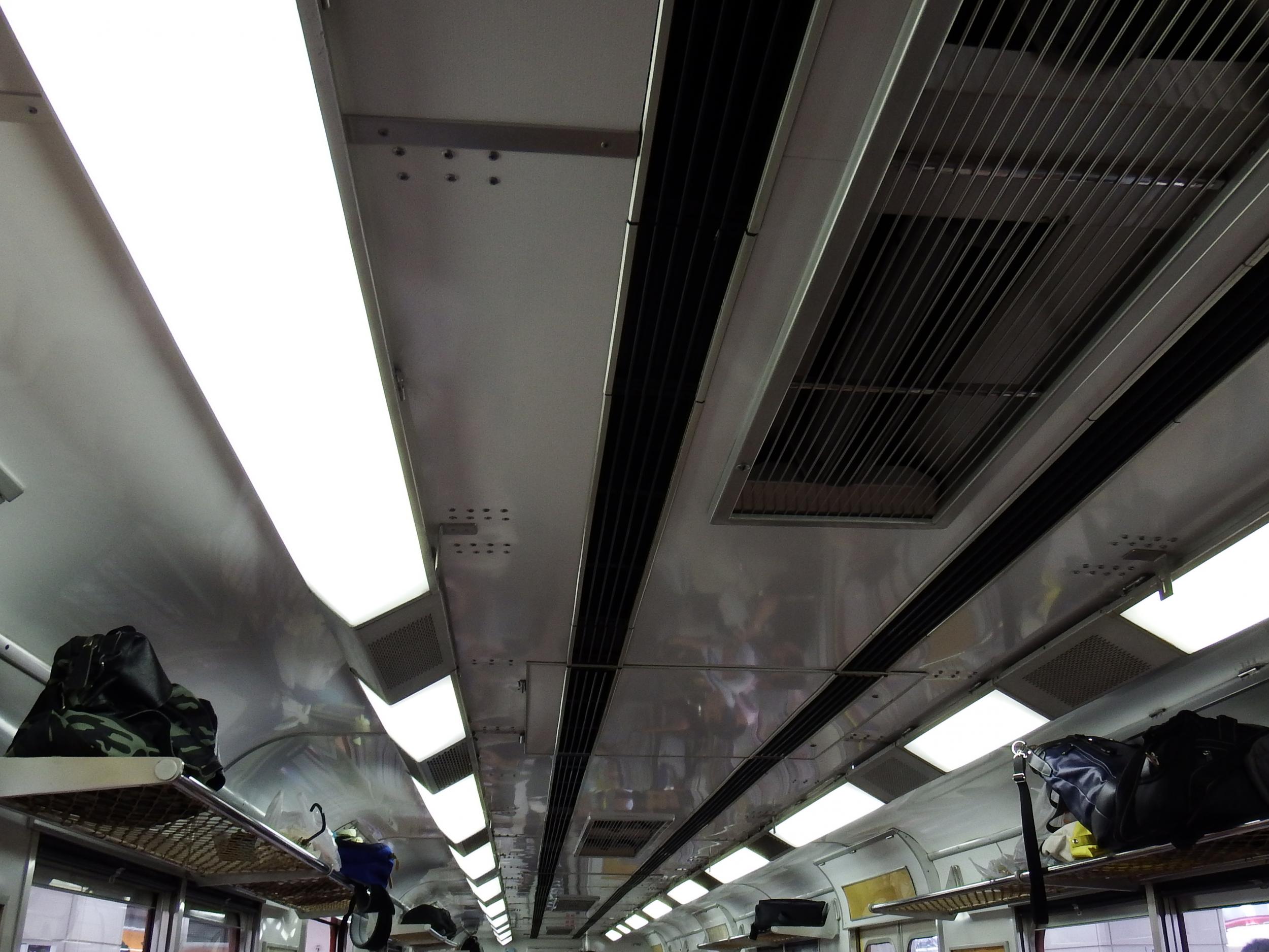 3両目後方かぶりつき席をゲット、網棚は文字通り網棚、それと中吊り広告と吊革の取付具が全部取り外されビスだけになっているのが車内の大きな特徴です。