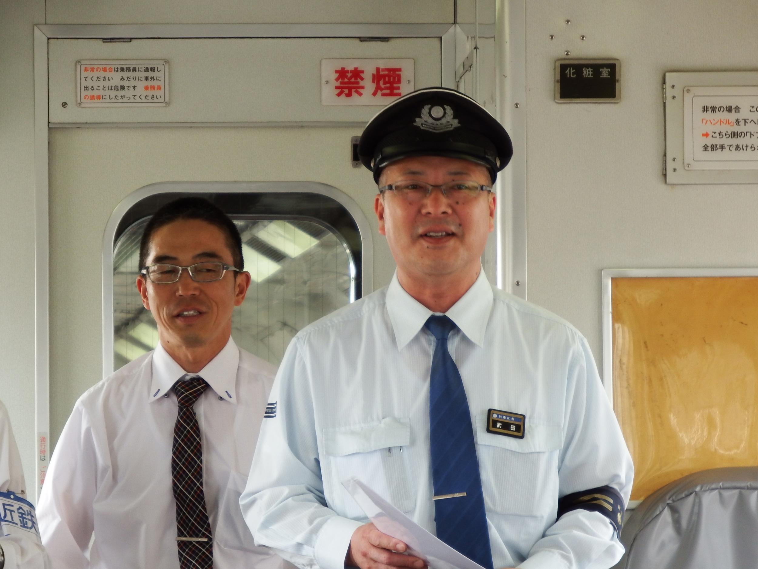 新田辺運転区長が車内を巡回してご挨拶、とても発想が柔軟なリーダーとお見受けしました。でなきゃ、こんな破天荒列車が走るはずないです。こちらこそ、お世話になります!