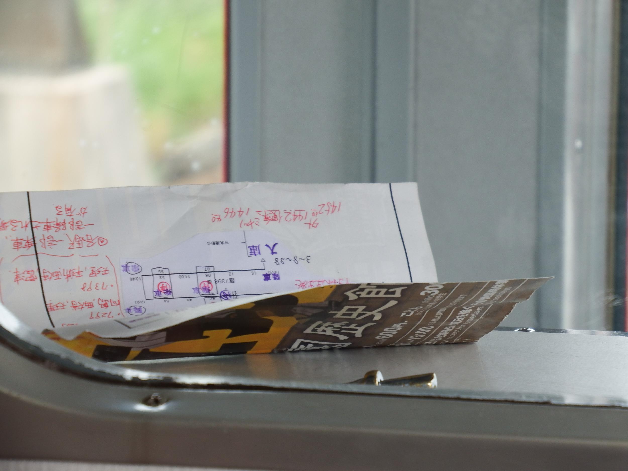 また最後部になって、車掌さんがチラシの裏に丁寧に書き込まれた運行表をチェック中。手作り感たっぷりのイベント列車です。