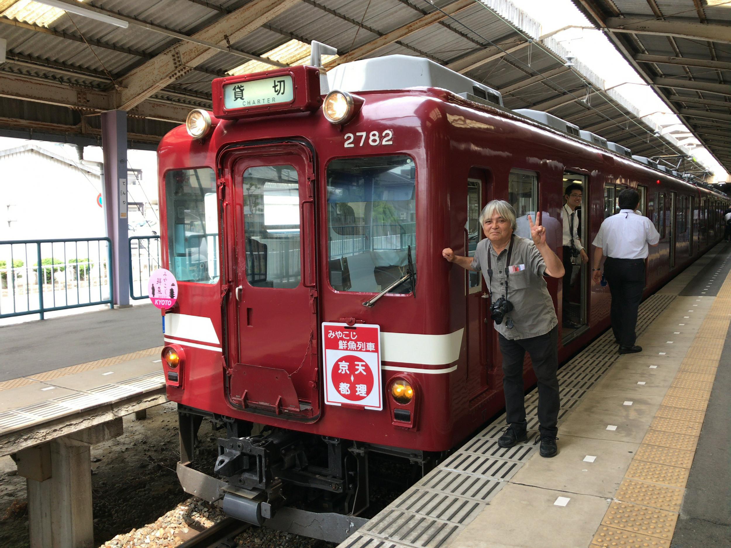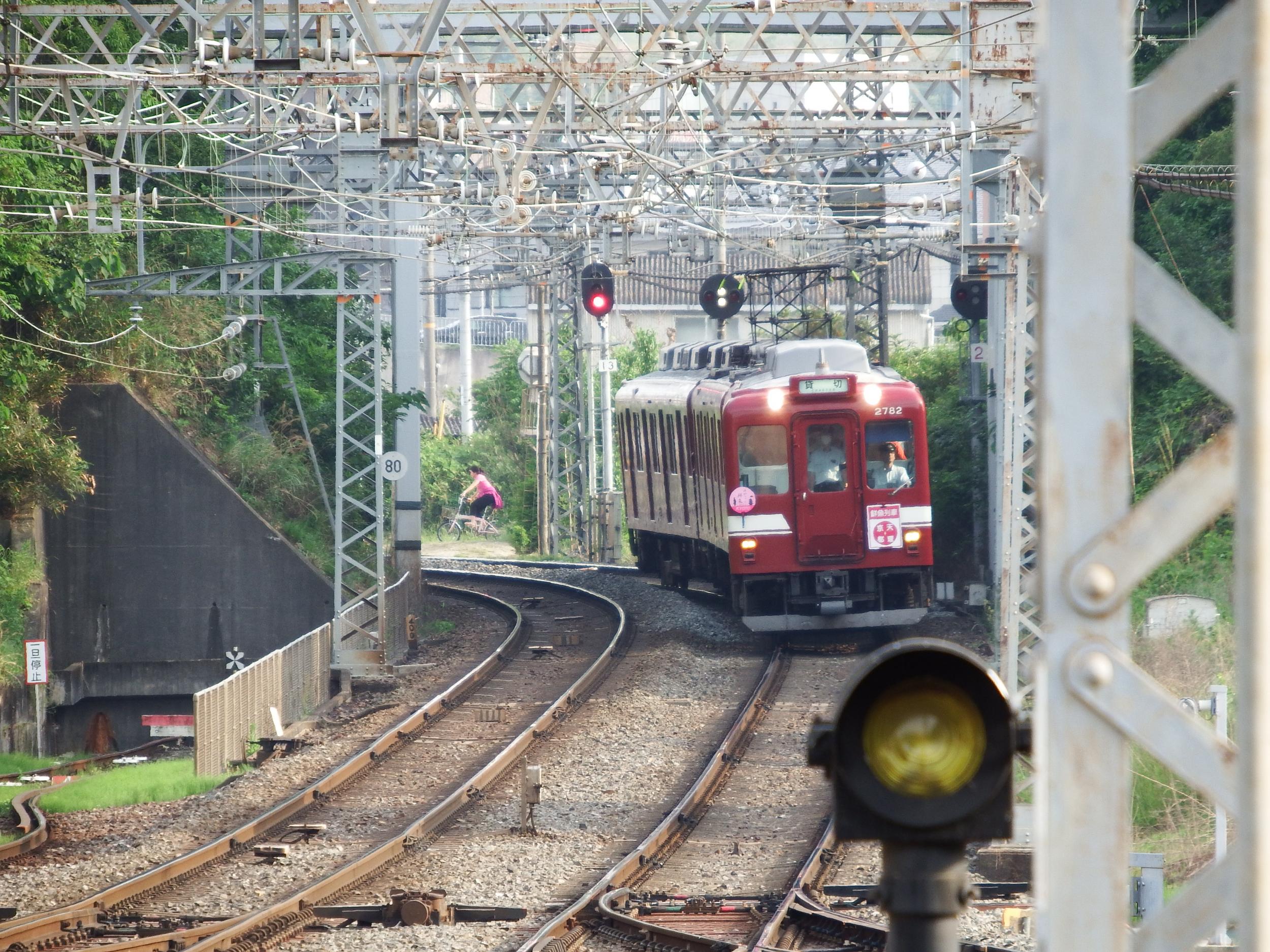 とても5月とは思えない暑さで、興戸駅に戻って来たときにはフラフラ、駅前でしばらく涼んで、京都行きの普通に乗って調べてみたら、このすぐ後が鮮魚列車で、向島へ着いて撮影ポイントへ移動する時間も無いことがわかりました。車内のみんなにももう一度会って、撮ってきた鳥の写真を見てもらいたくもあり、巨椋干拓地は諦めて新田辺で下車、鮮魚列車を迎えることにしました。