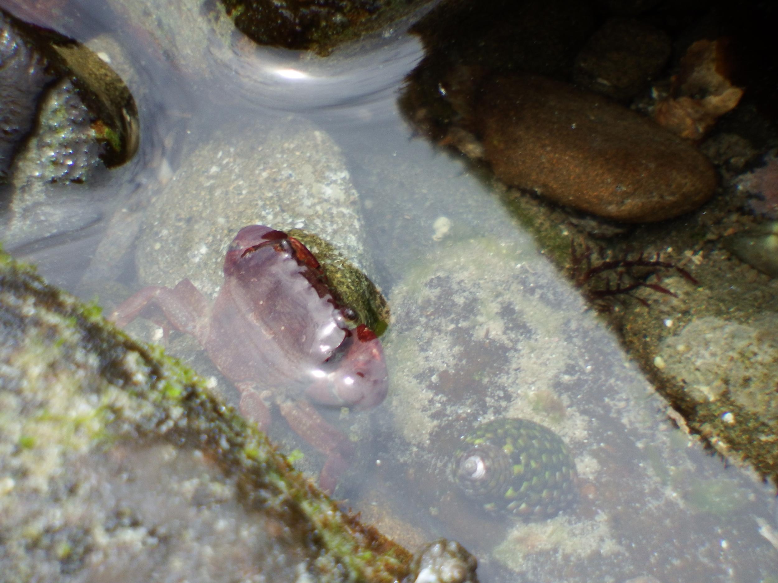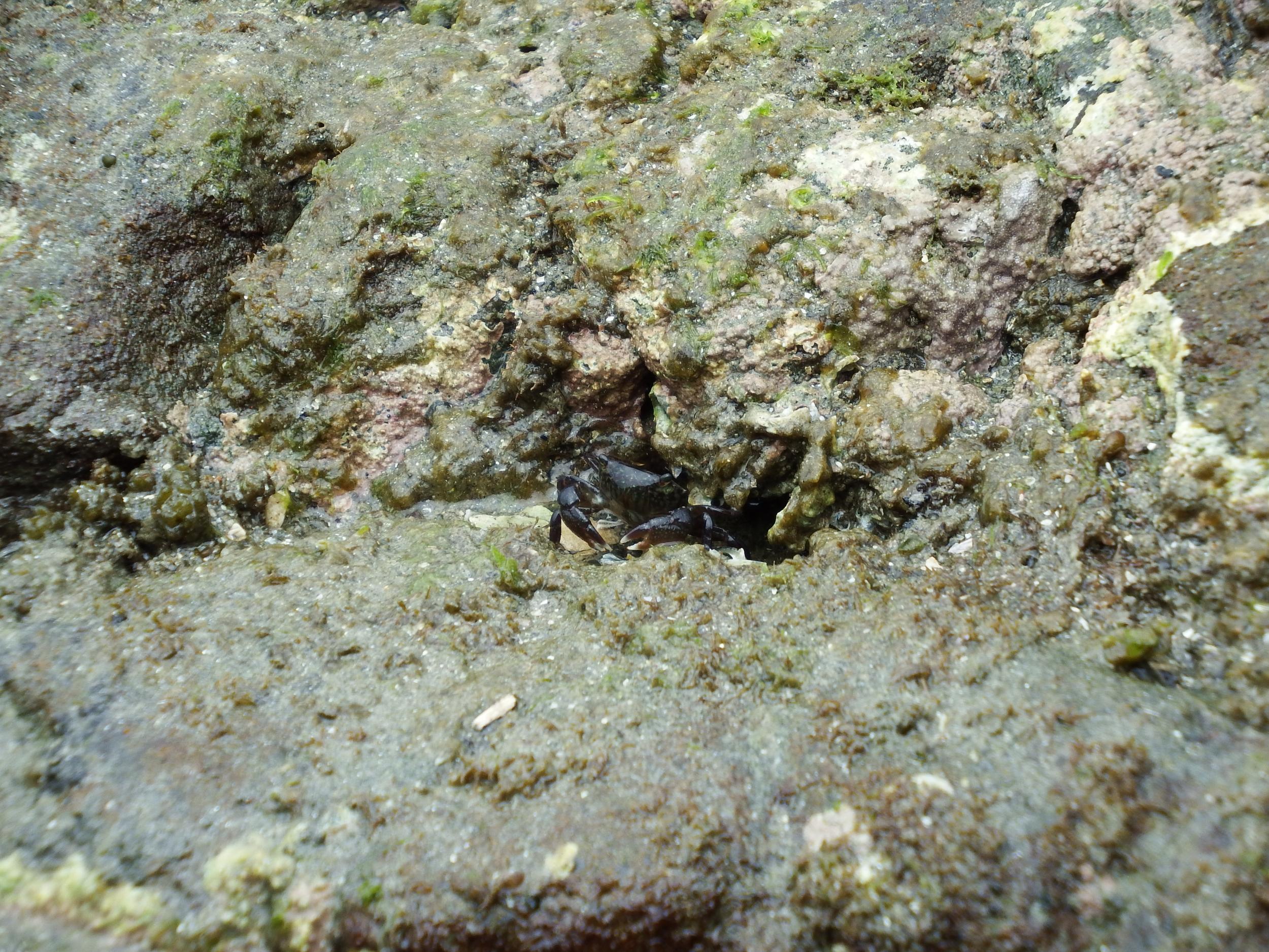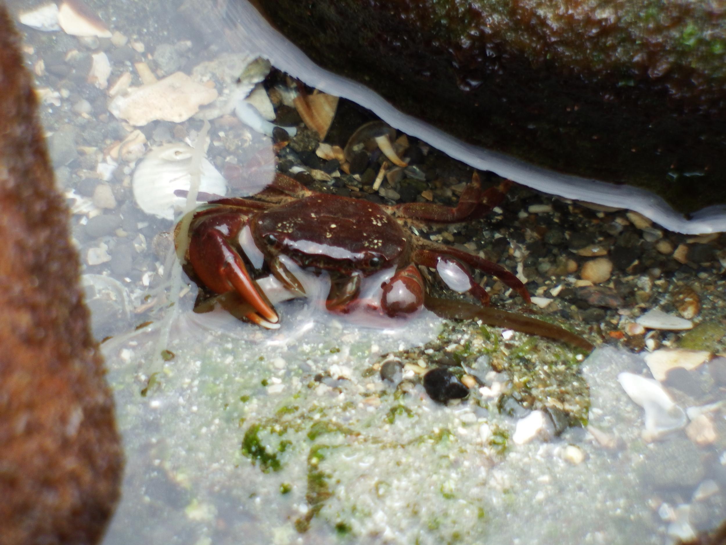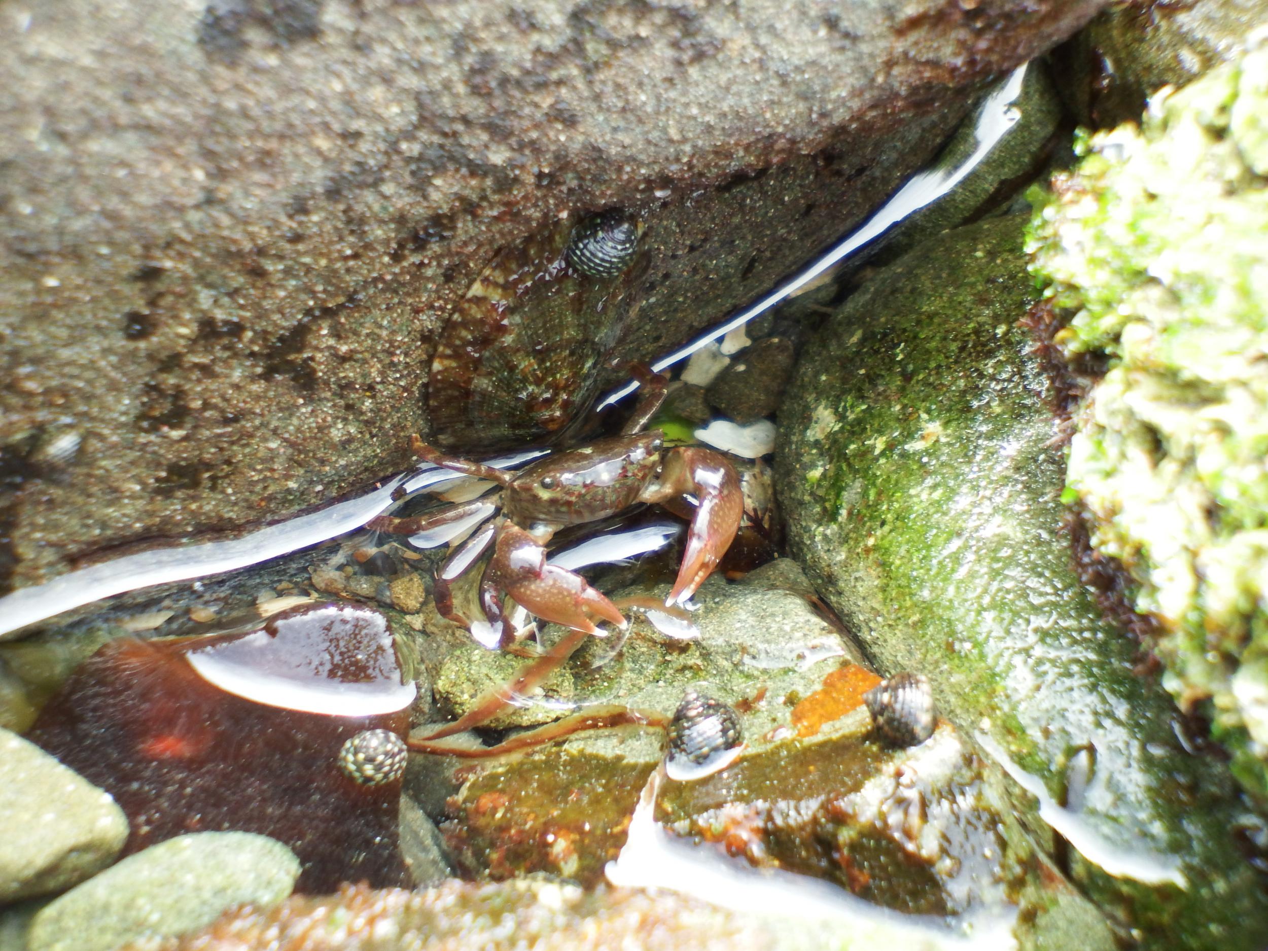 これはイワガニだと思います。イソガニよりずっとハサミががっしりしています。岩陰に隠れていて、こっちがちょっと動くだけで、敏感に反応してすばやく隠れるものの、しばらくするとまた顔をだしてきて様子を伺っています。