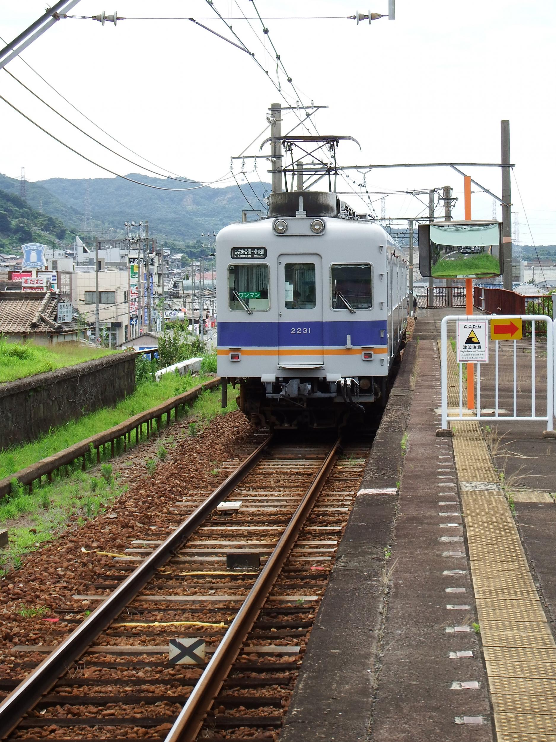 南海っぽい、白い小さな木造駅舎が瀟洒です。屋根はスレートに葺き替えられ、壁や柱は真っ白に塗り直されたばかりのようです。