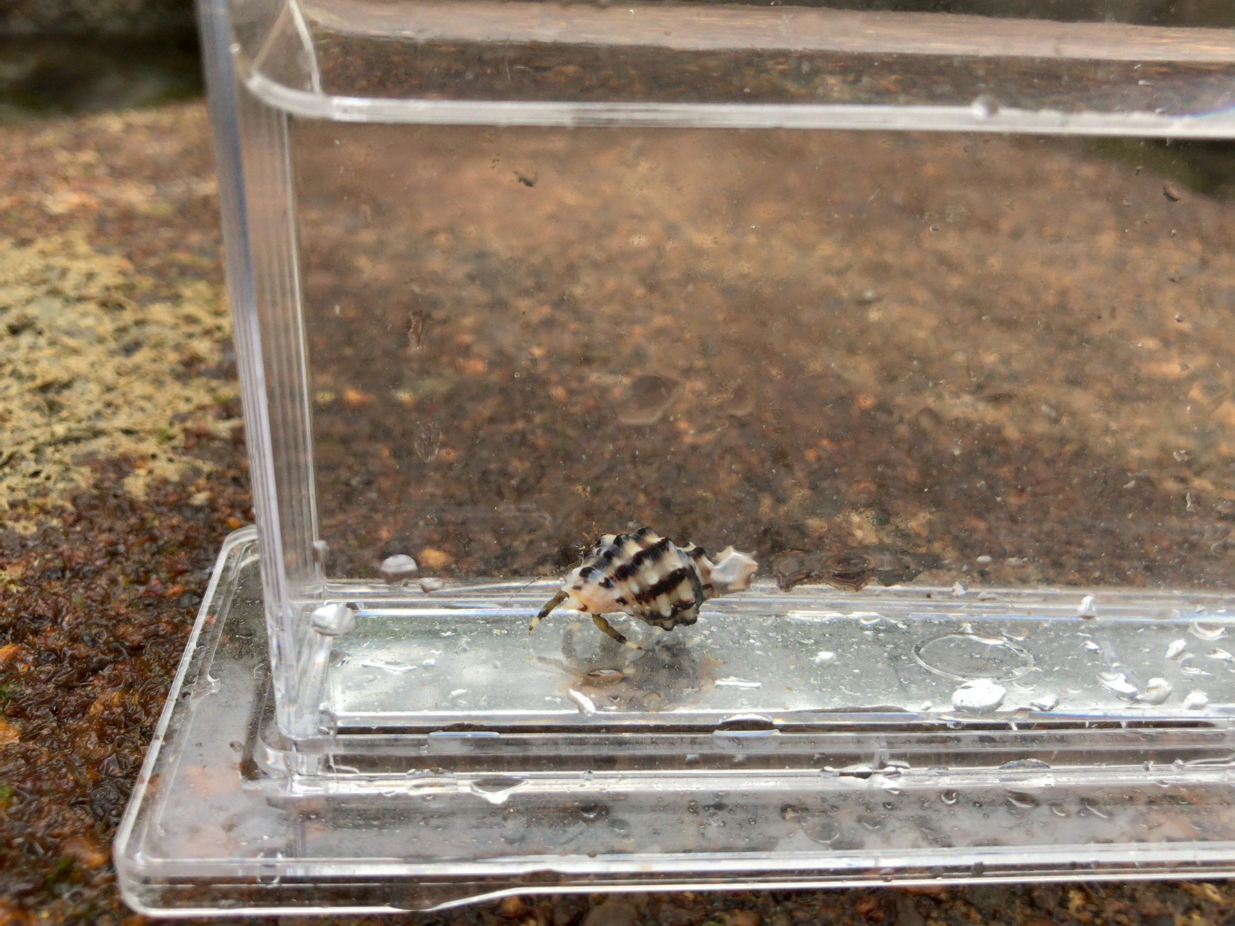 この小さい貝殻を被ったヤドカリは比較的おとなしく、スタコラ走る様をアクリルケースで観察するのは楽しいです。