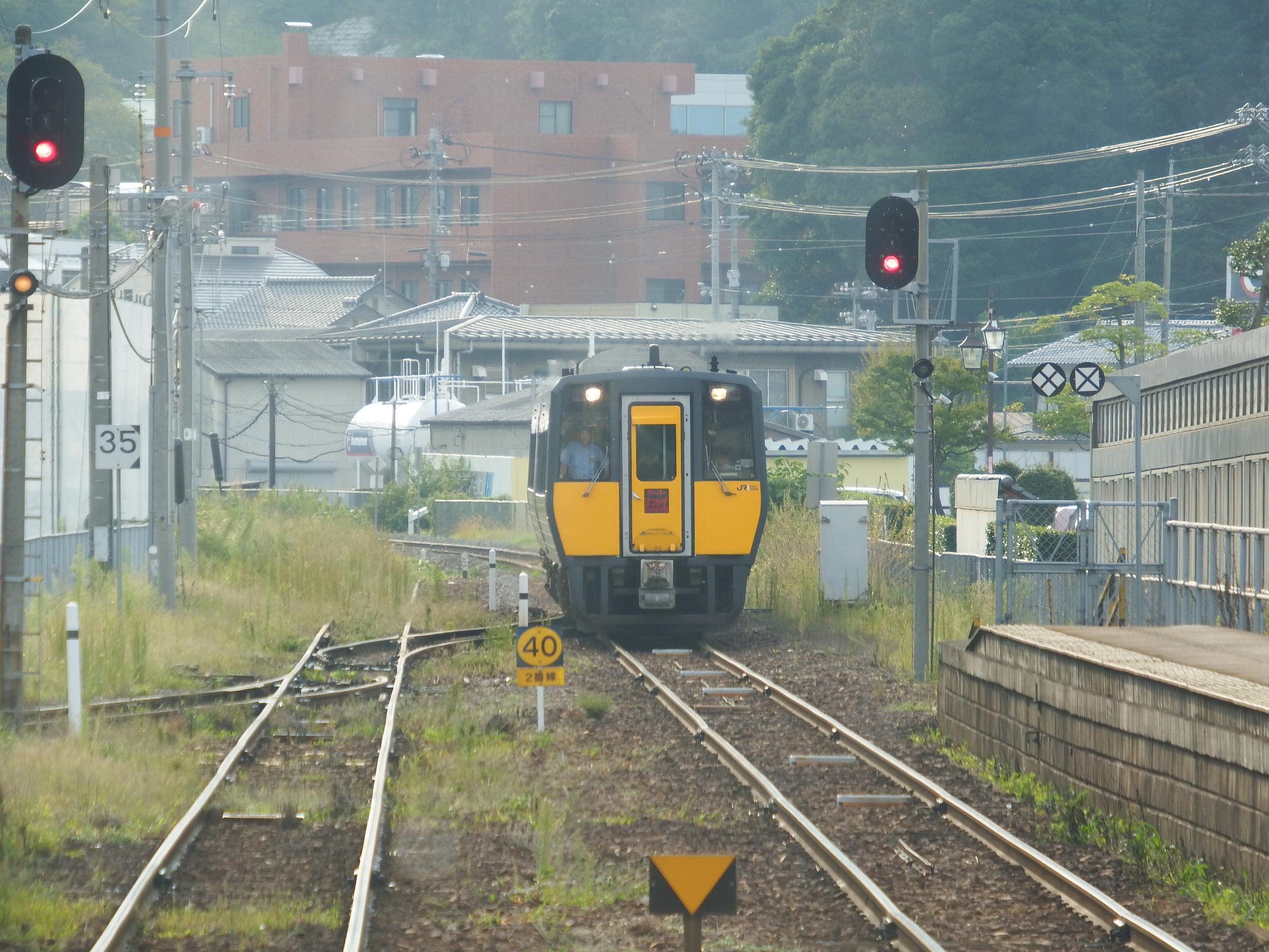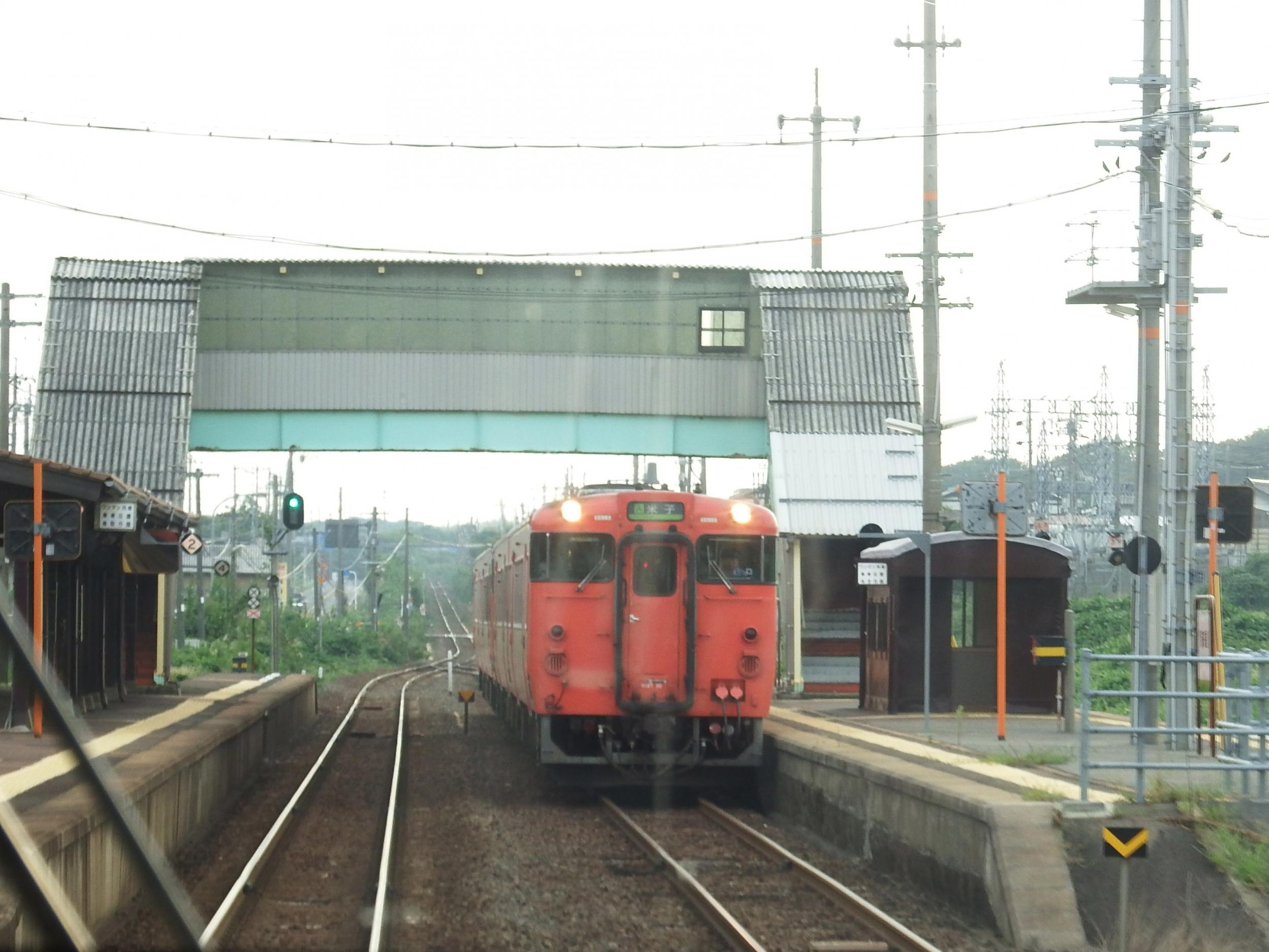 下りスーパーまつかぜ1号と交換、向こうは2連です。かつてキハ82系のまつかぜが食堂車を含む12両編成、京都-大阪-松江-博多をロングランしていたのは遥か昔のお話になってしまいました。