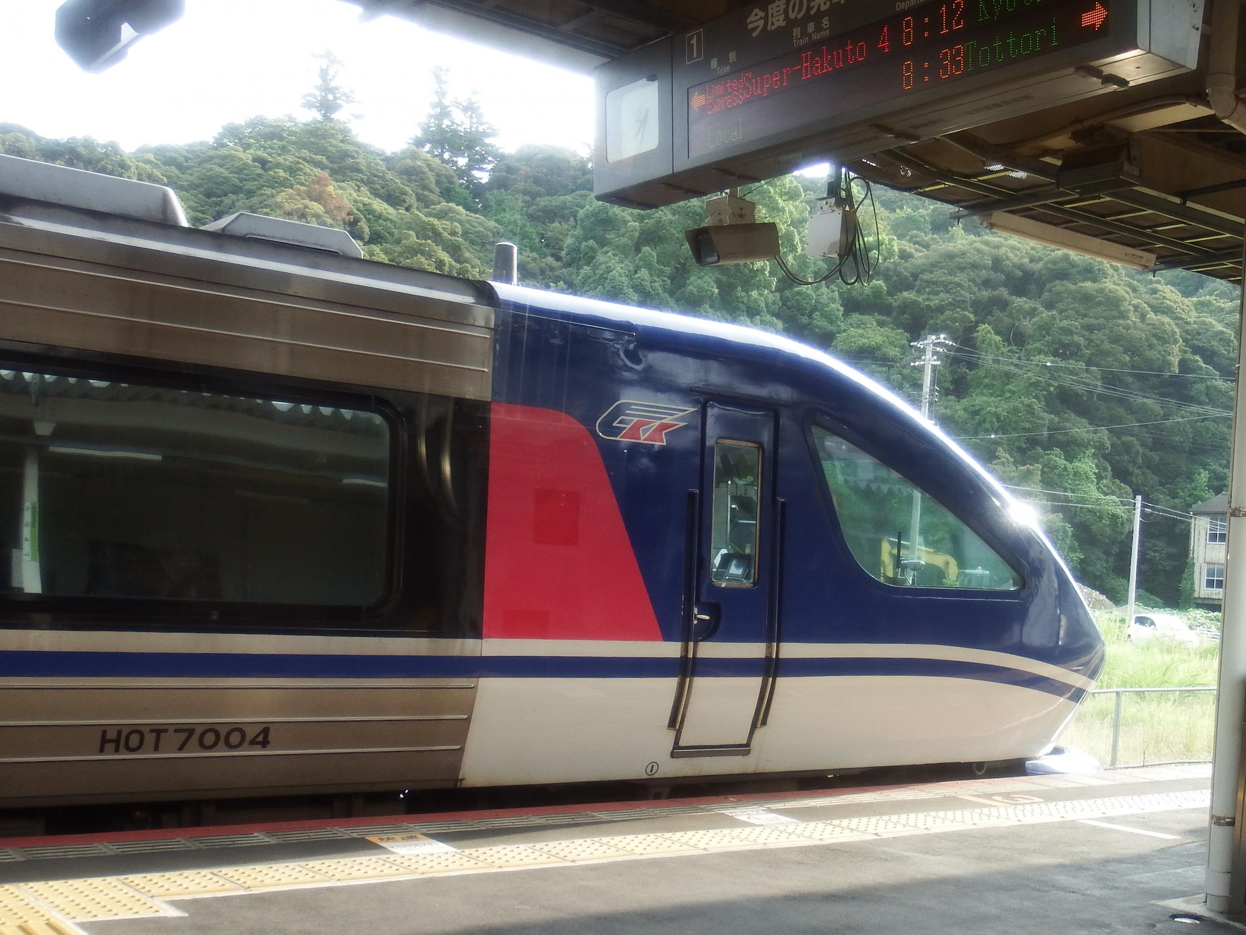 倉吉に到着、淀川でもよく見かける智頭急行のHOT7000系スーパーはくとが停車中。