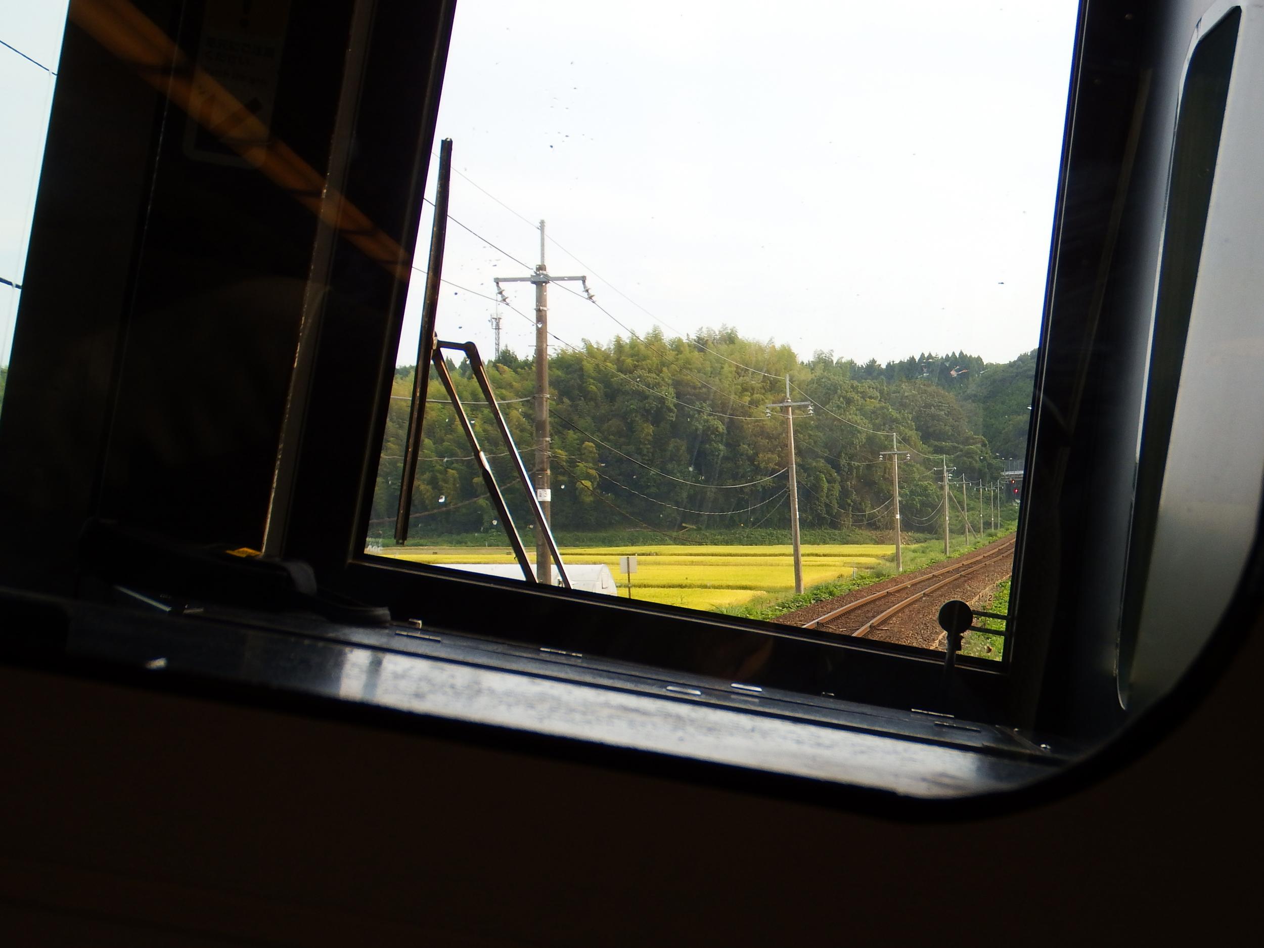 電柱を垂直にトリミングしてみました。振子装置の傾きは5、6°くらいなので実際にはこんなに傾いてはいないのですが、先頭車かぶりつきではこう見えます。