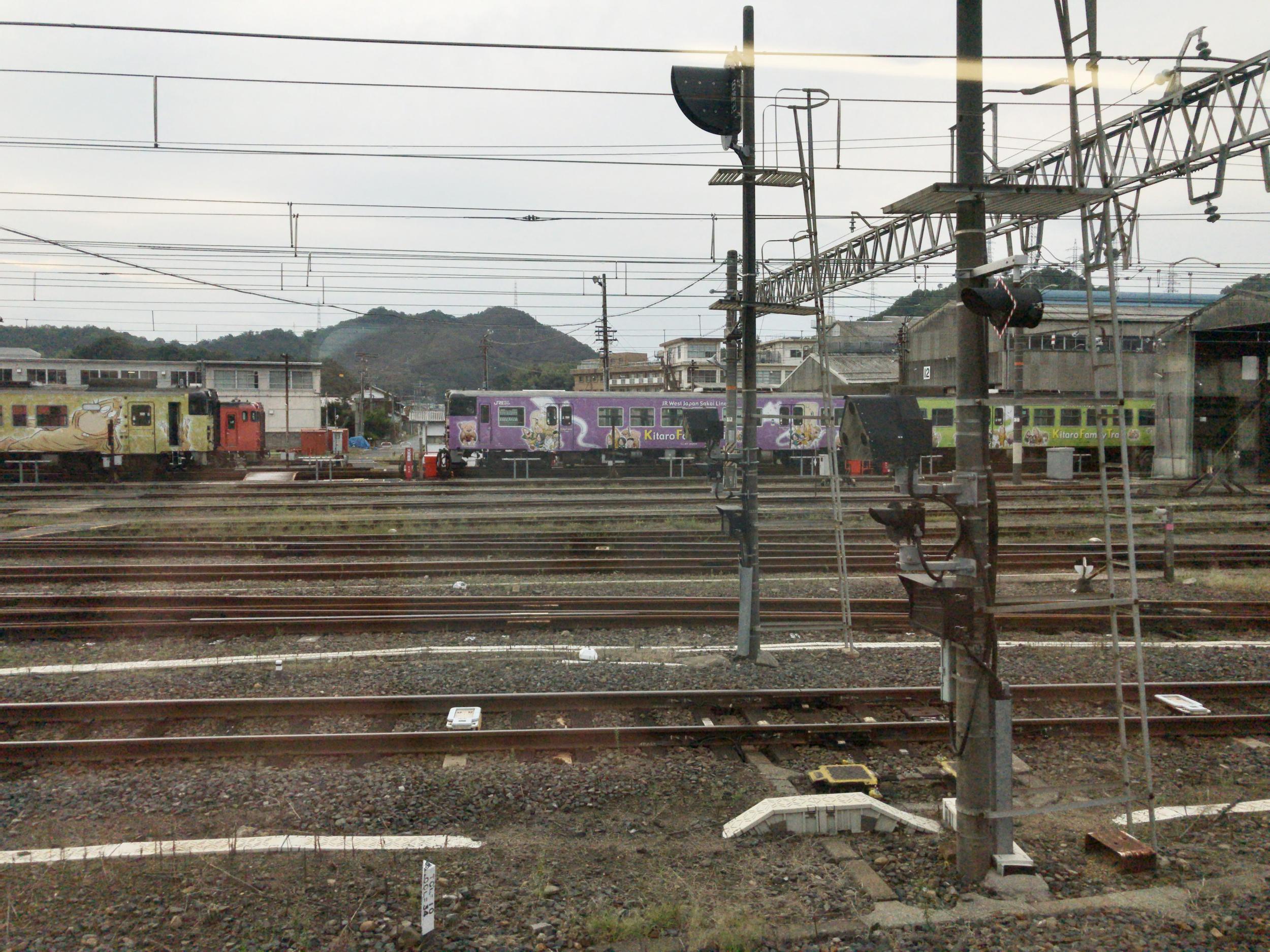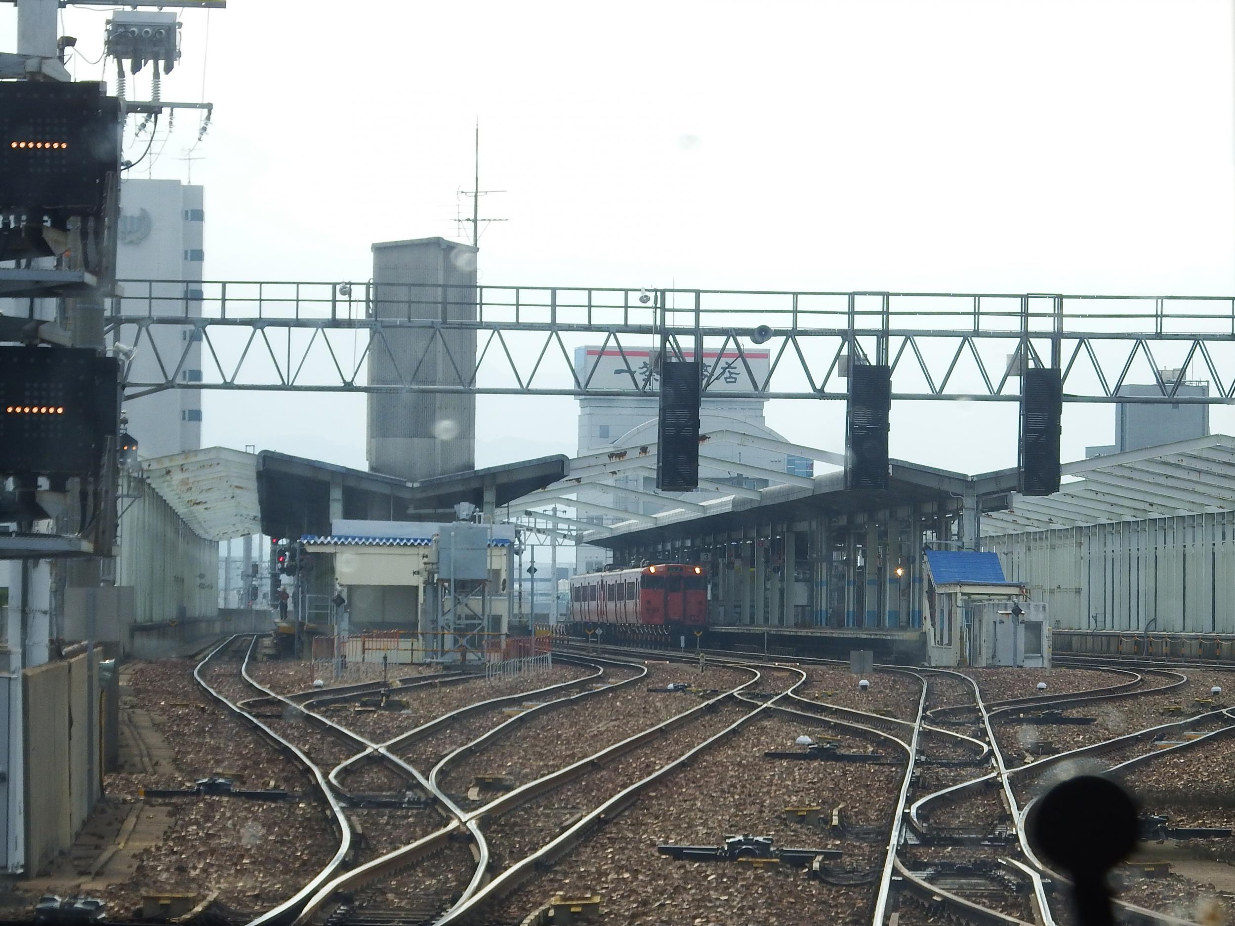 ほどなく米子到着、1番線も2番線も埋まっていて、上り本線からポイントを2つ渡り3番線に入線します。