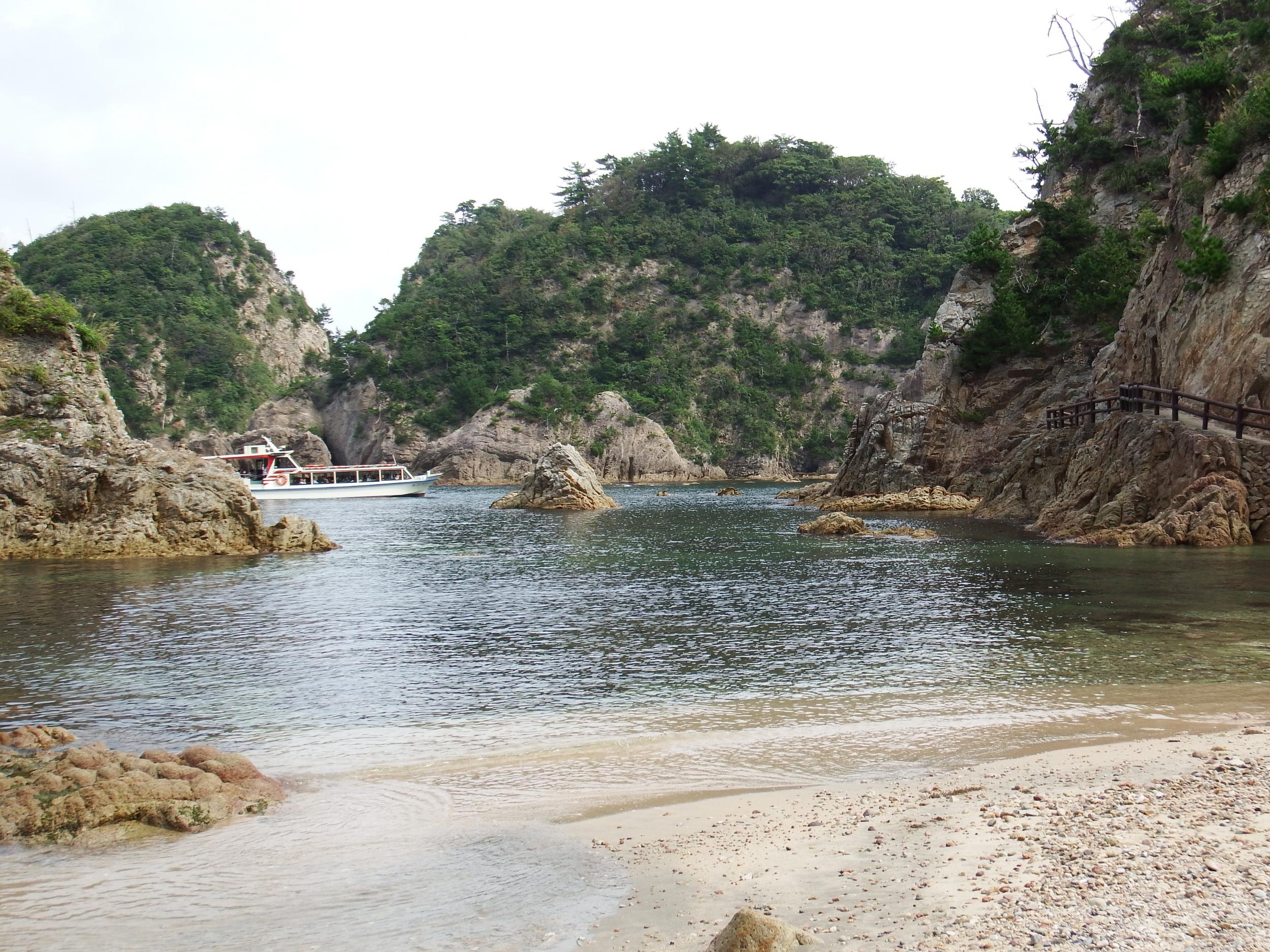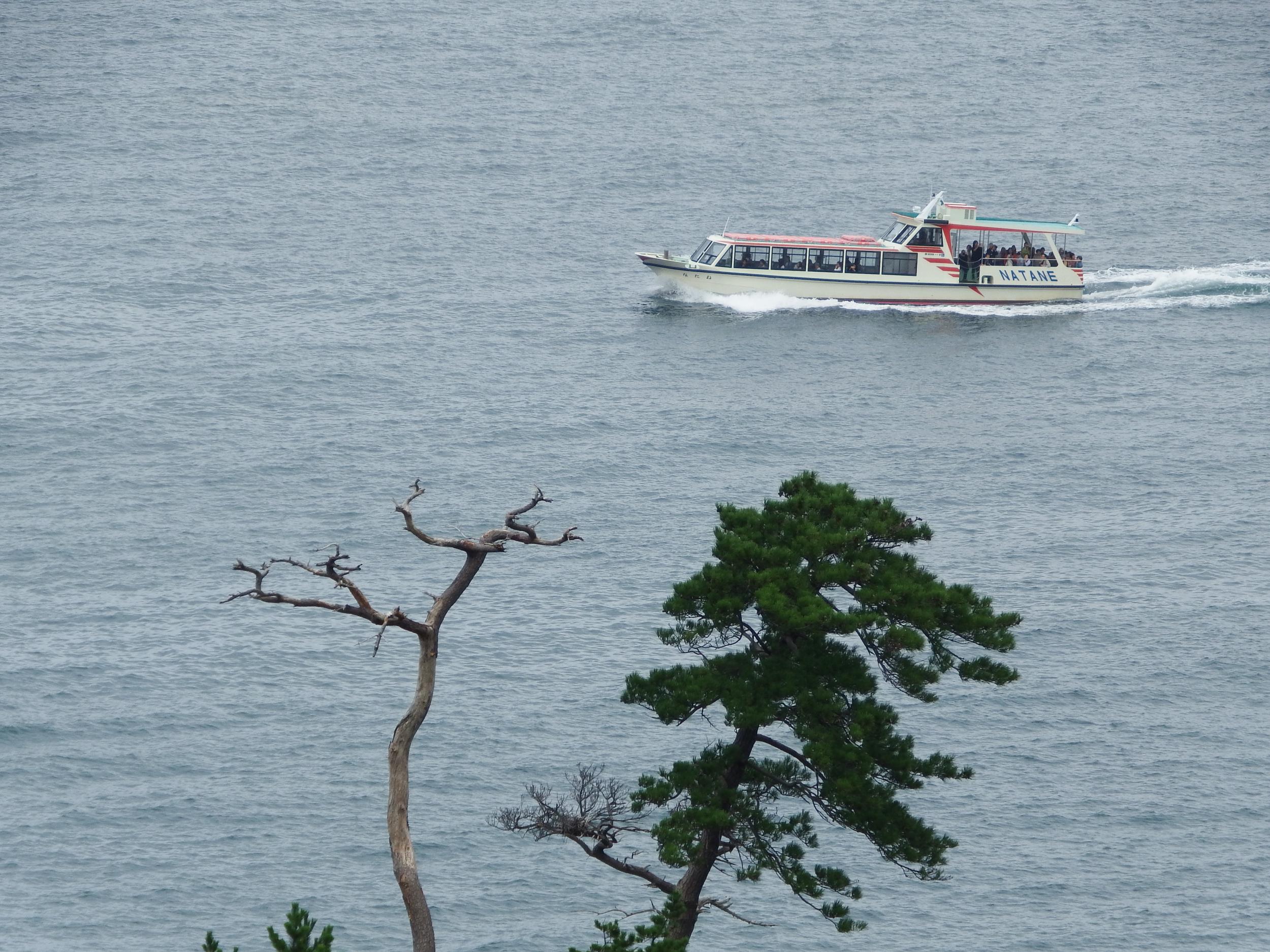 入江に遊覧船が入ってきました。時々日差しも指してきて曇り空でも十二分に気持ちいい場所です。