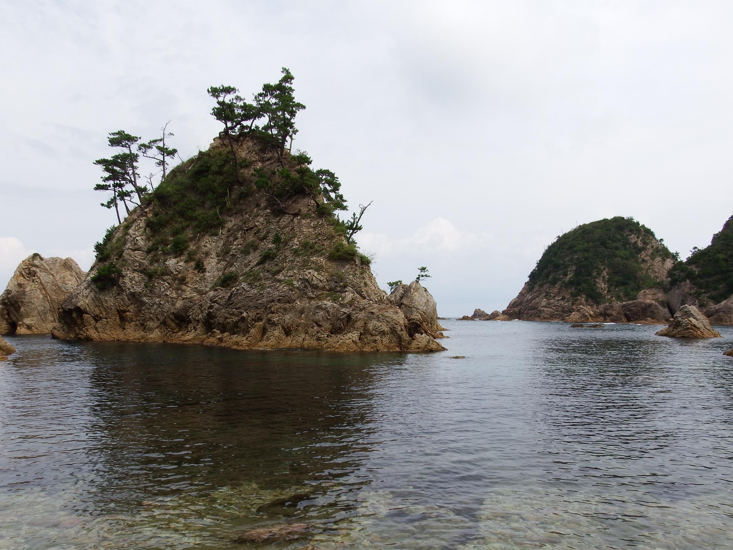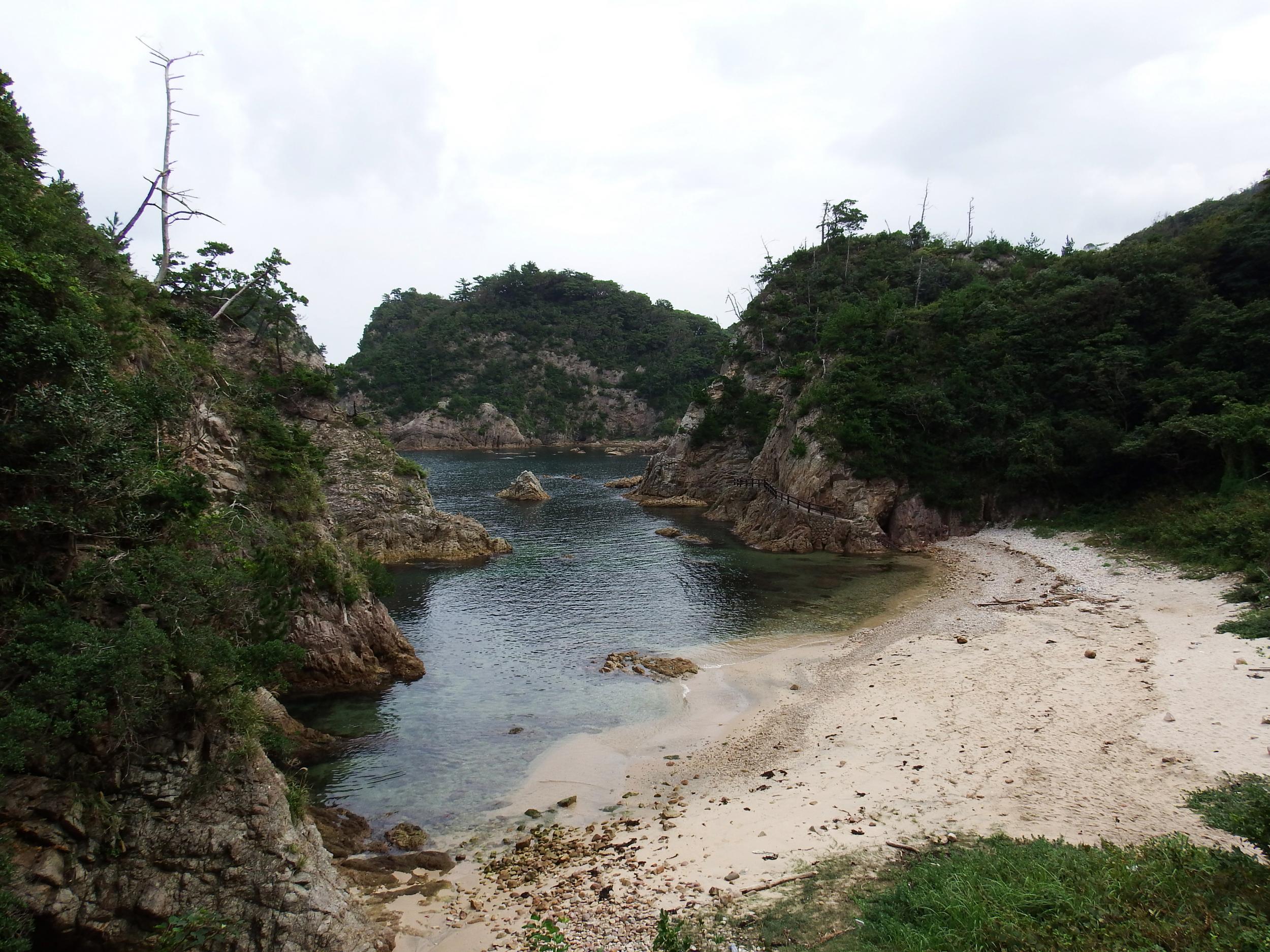 浦富海岸から西へ、リアス式海岸の地形に沿ってヘアピンカーブとアップダウンを繰り返す道路を行きます。ぼっろぼろママチャリは何故か外装7段変速が付いているものの、ほぼほぼ2段変速でしか機能しません。上り坂は大汗かいて押して上り、下り坂はキーキーと耳障りな後輪ブレーキ音を鳴らしながら下ります。やはりここでは電動アシスト付予約がマストのようです。