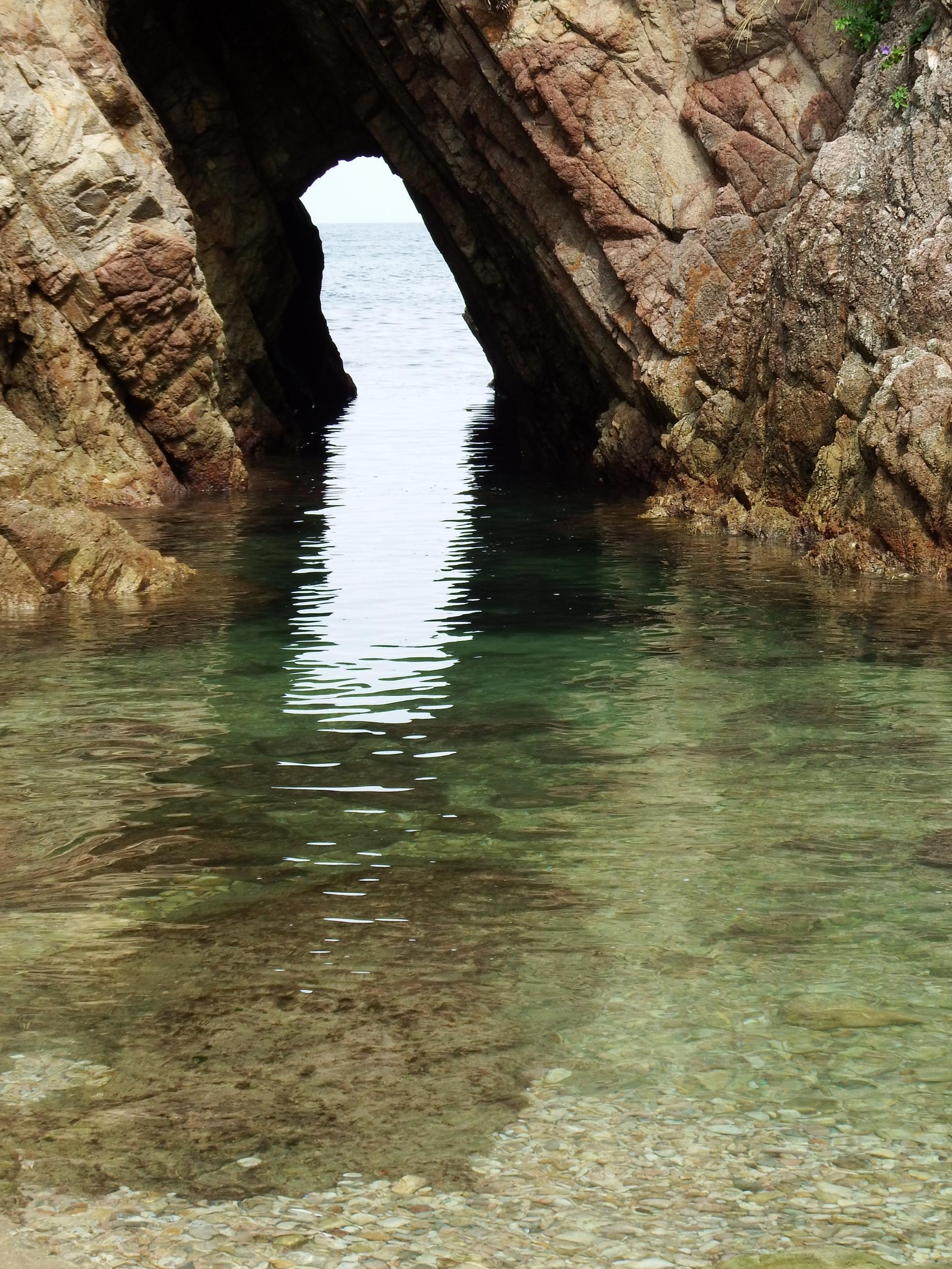 浜の左端に狭い洞窟、その右側に見通せる洞窟、右側は入江が広がり小島が点在しています。海の透明度は文句なしですが、期待していた生き物は全然見当たりません。