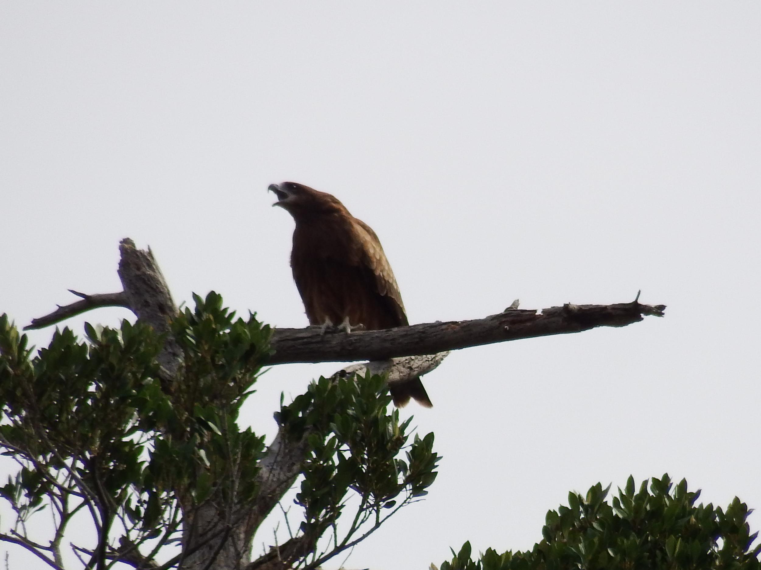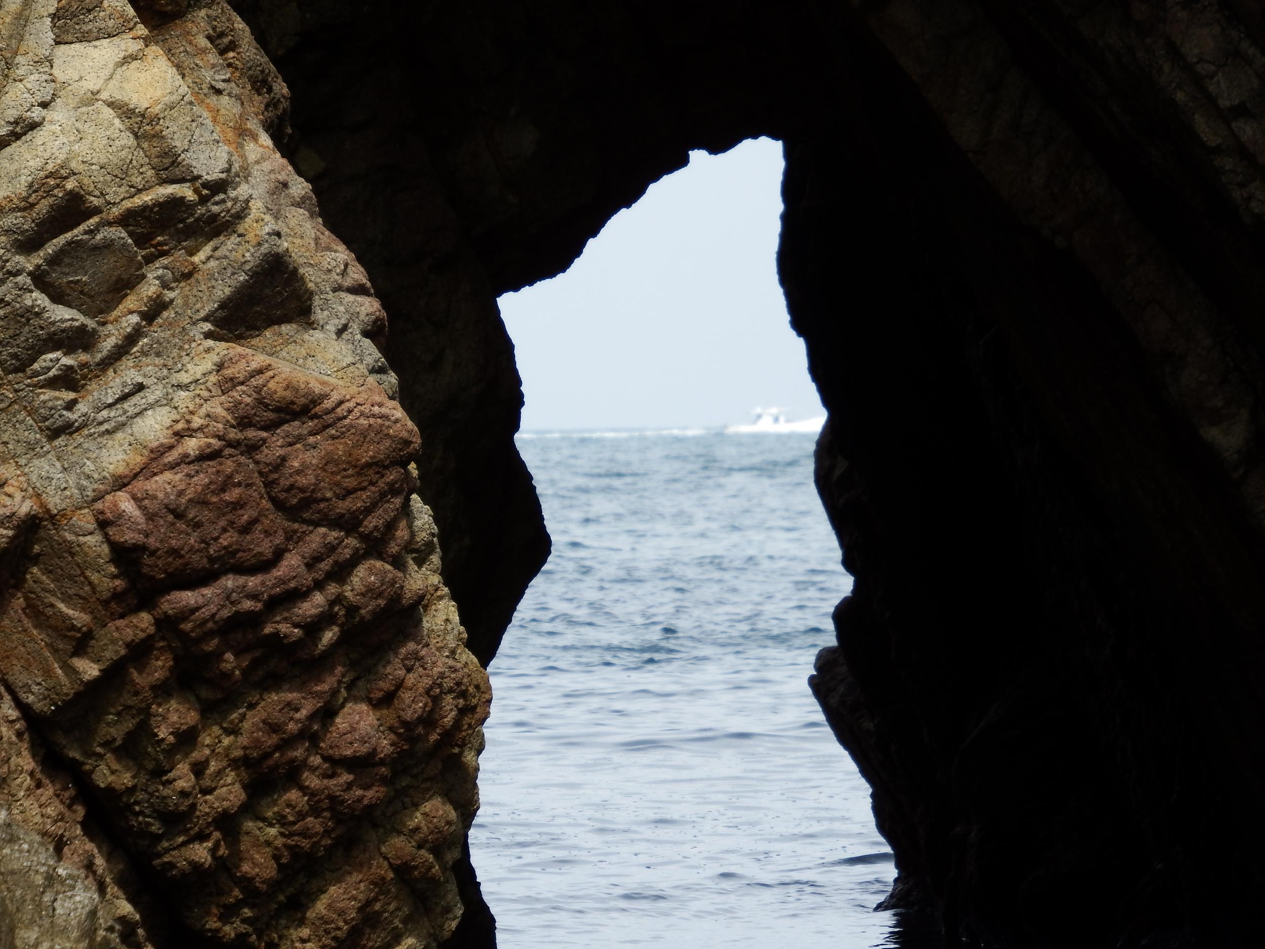 洞窟の向こうに船が見えます。トビが枝に止まったままピーヒョロロと入江に響かせています。