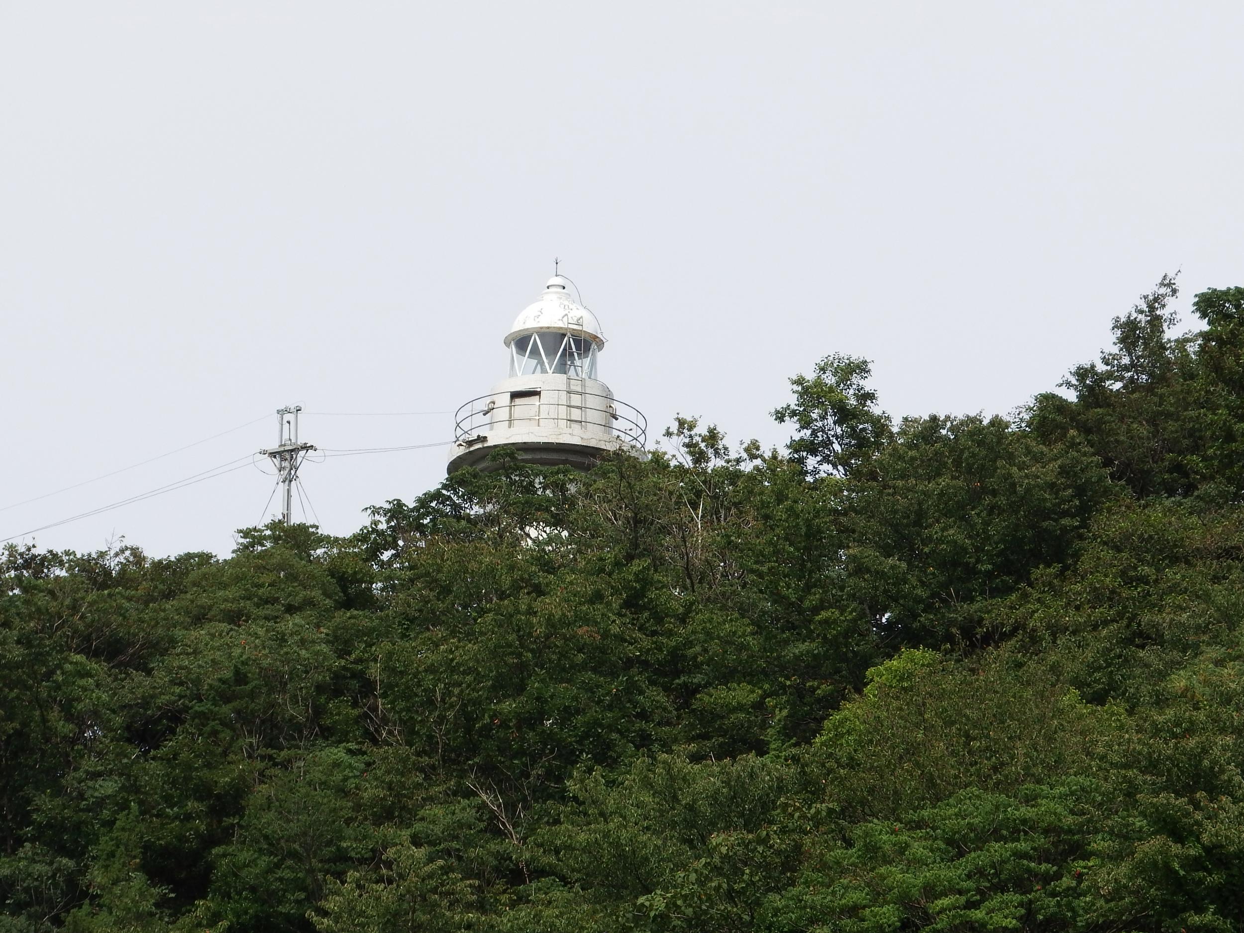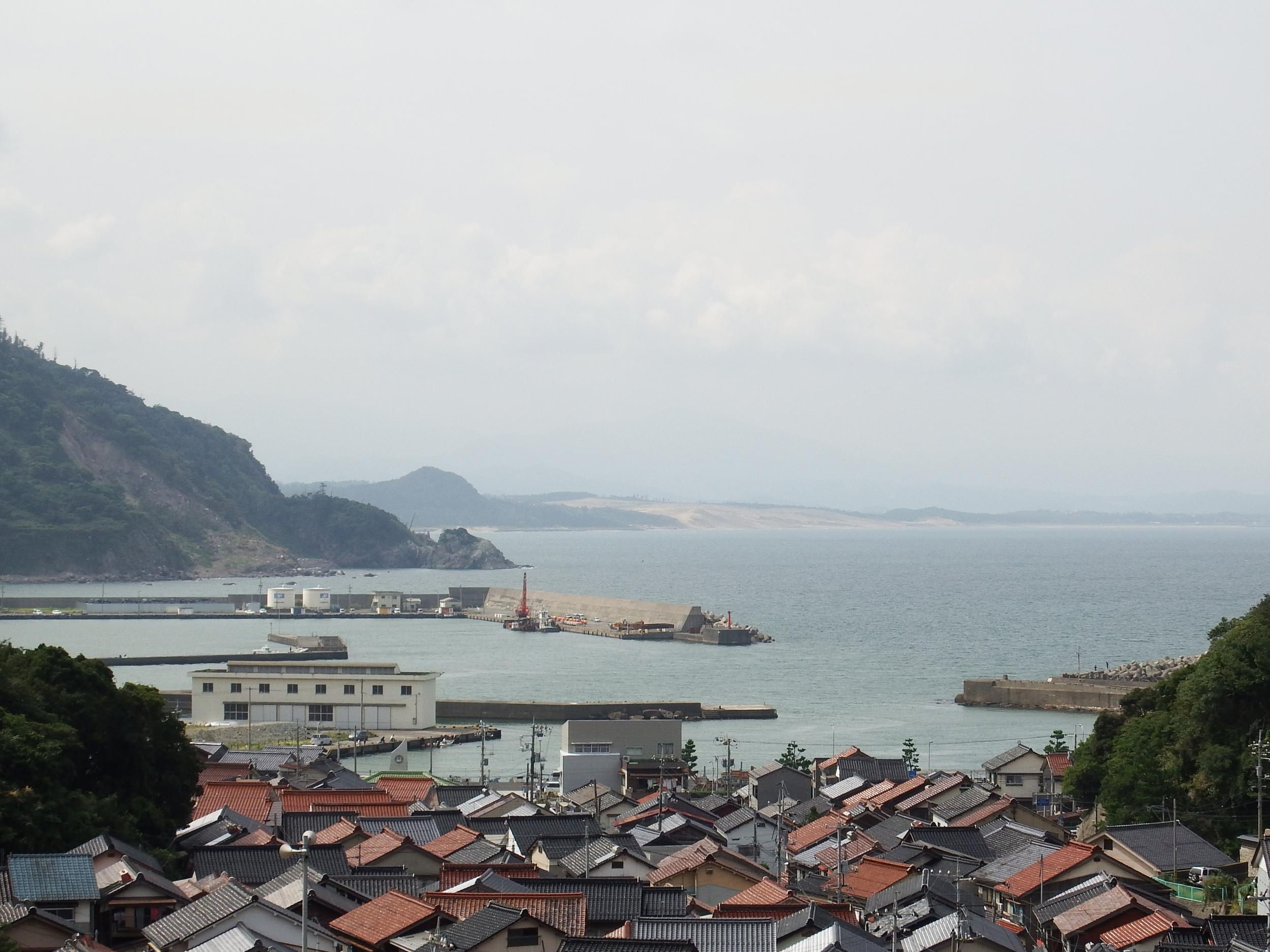 網代漁港が広がり向こうに鳥取砂丘が見えます。網代崎灯台は岬の先端じゃなくて森のなかにあってかなり藪漕ぎしないと近づけないようです。