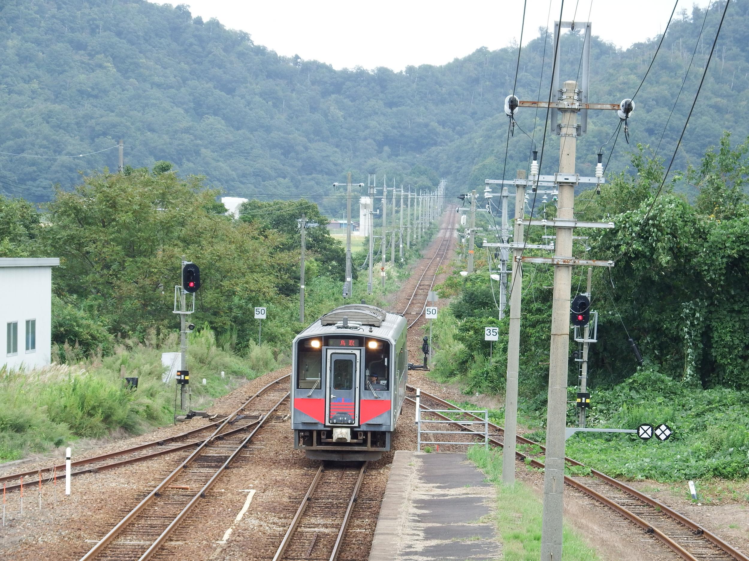 泊駅を通過、2番線のキハ121系は対向の米子行、3番線のキハ47形は先行していた鳥取行。