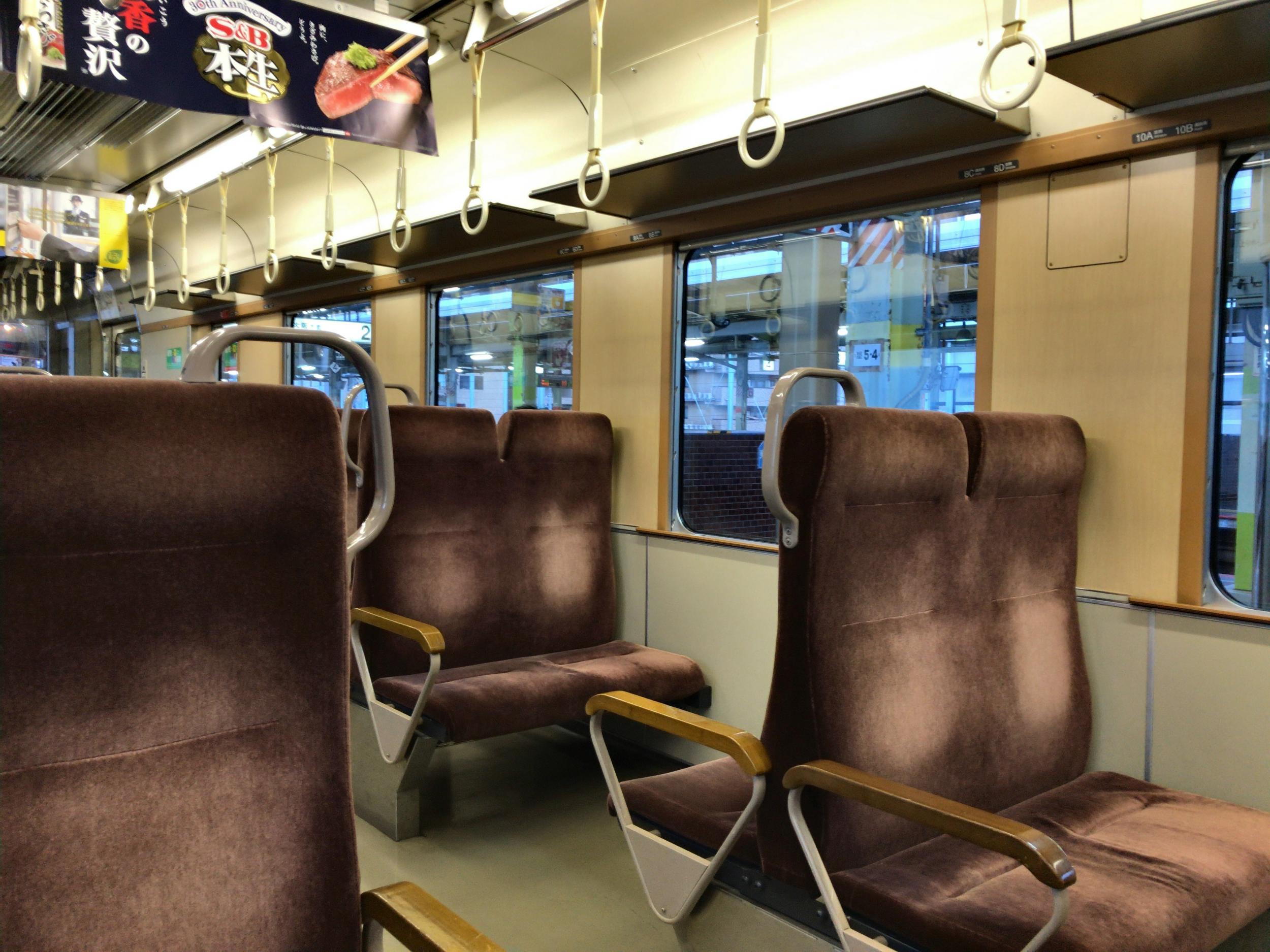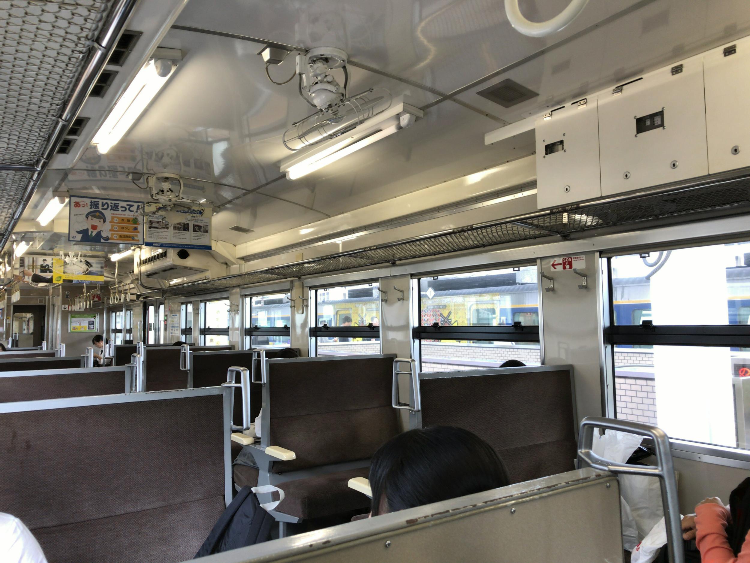 キハ47形の浜坂行に乗り換え、昭和なボックスシートです。