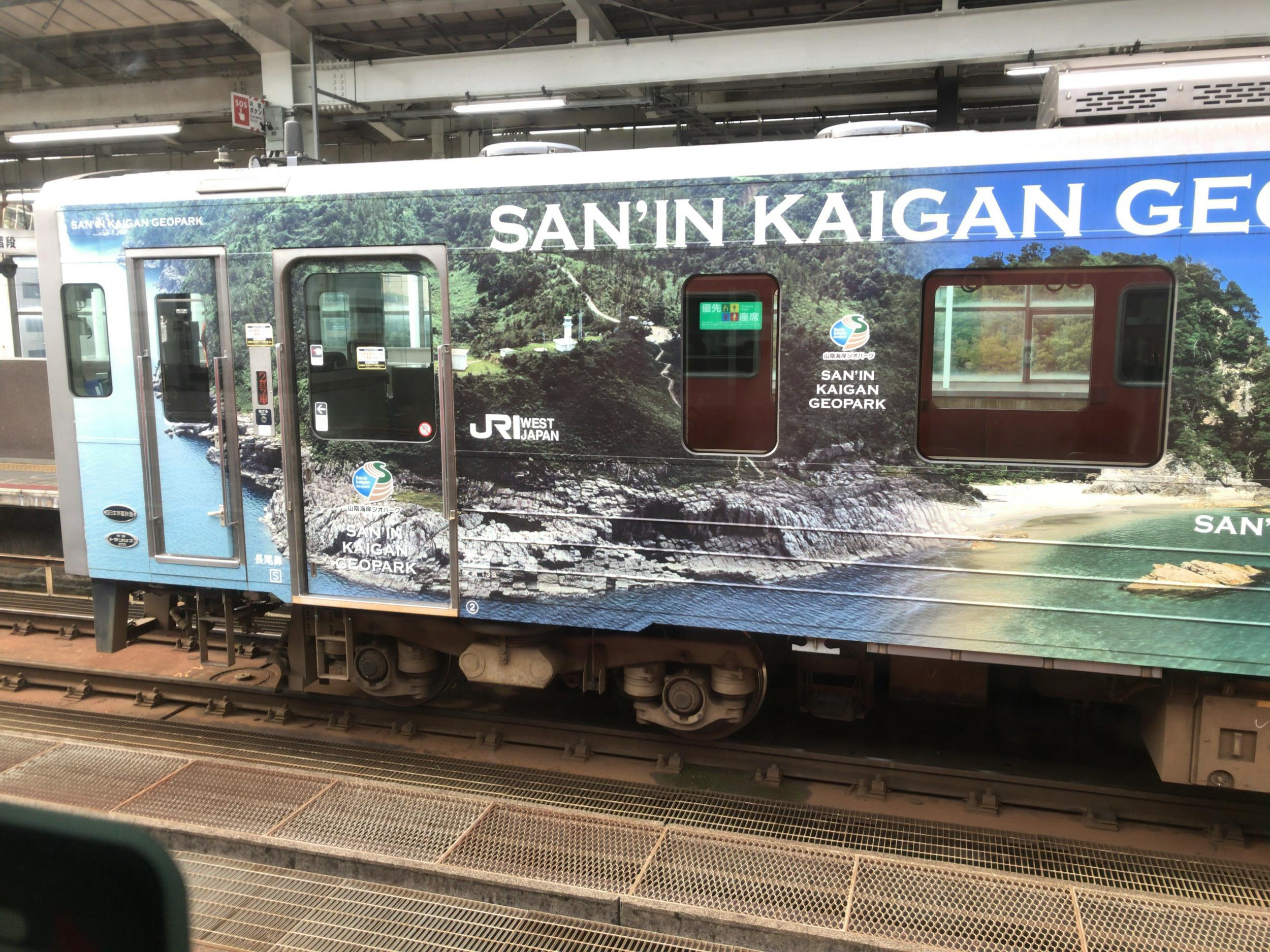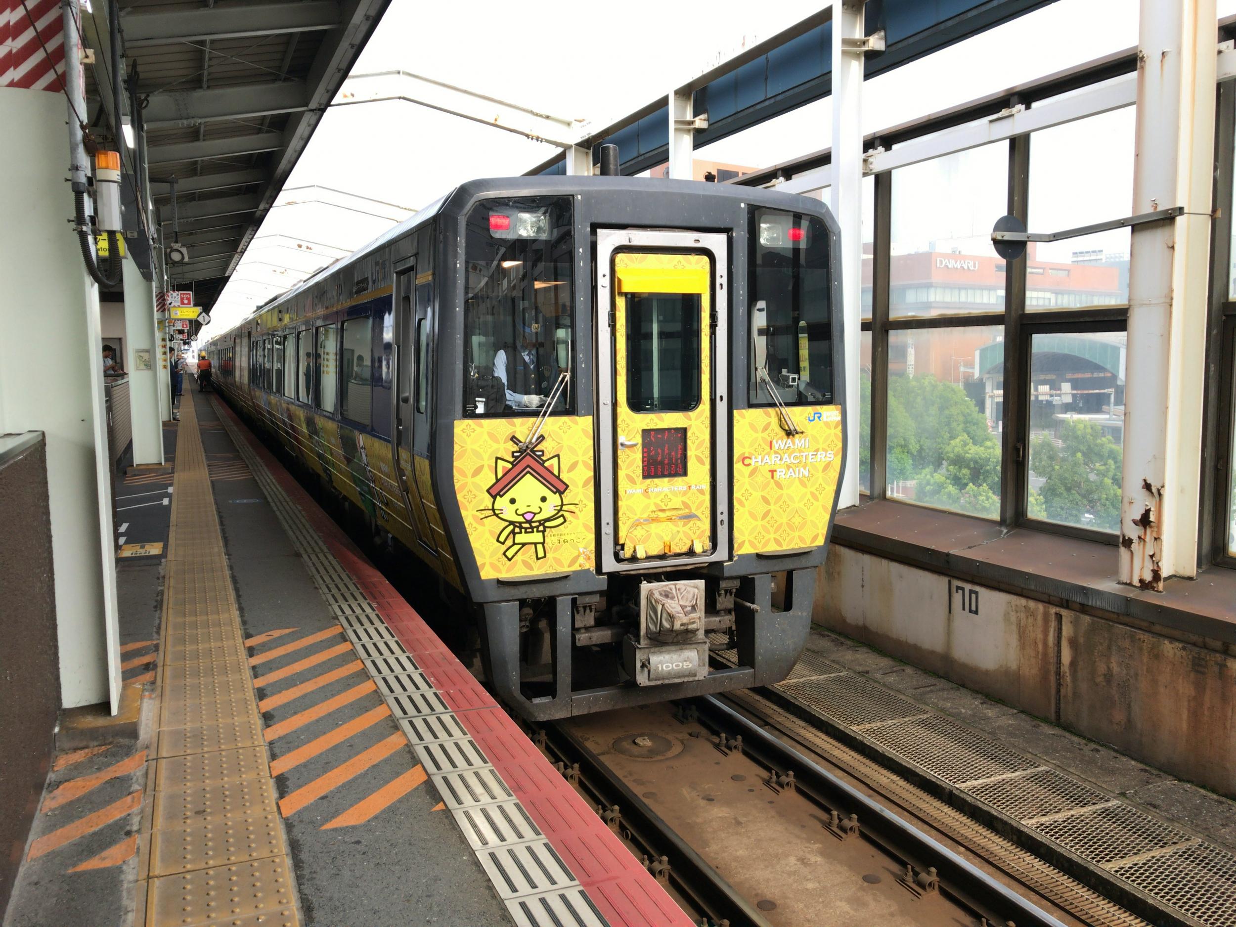 いわみキャラクタートレインというラッピング列車で、しまねっこしか写っていませんが、客室窓の下には石見地方のゆるキャラがずらっと並んでいます。