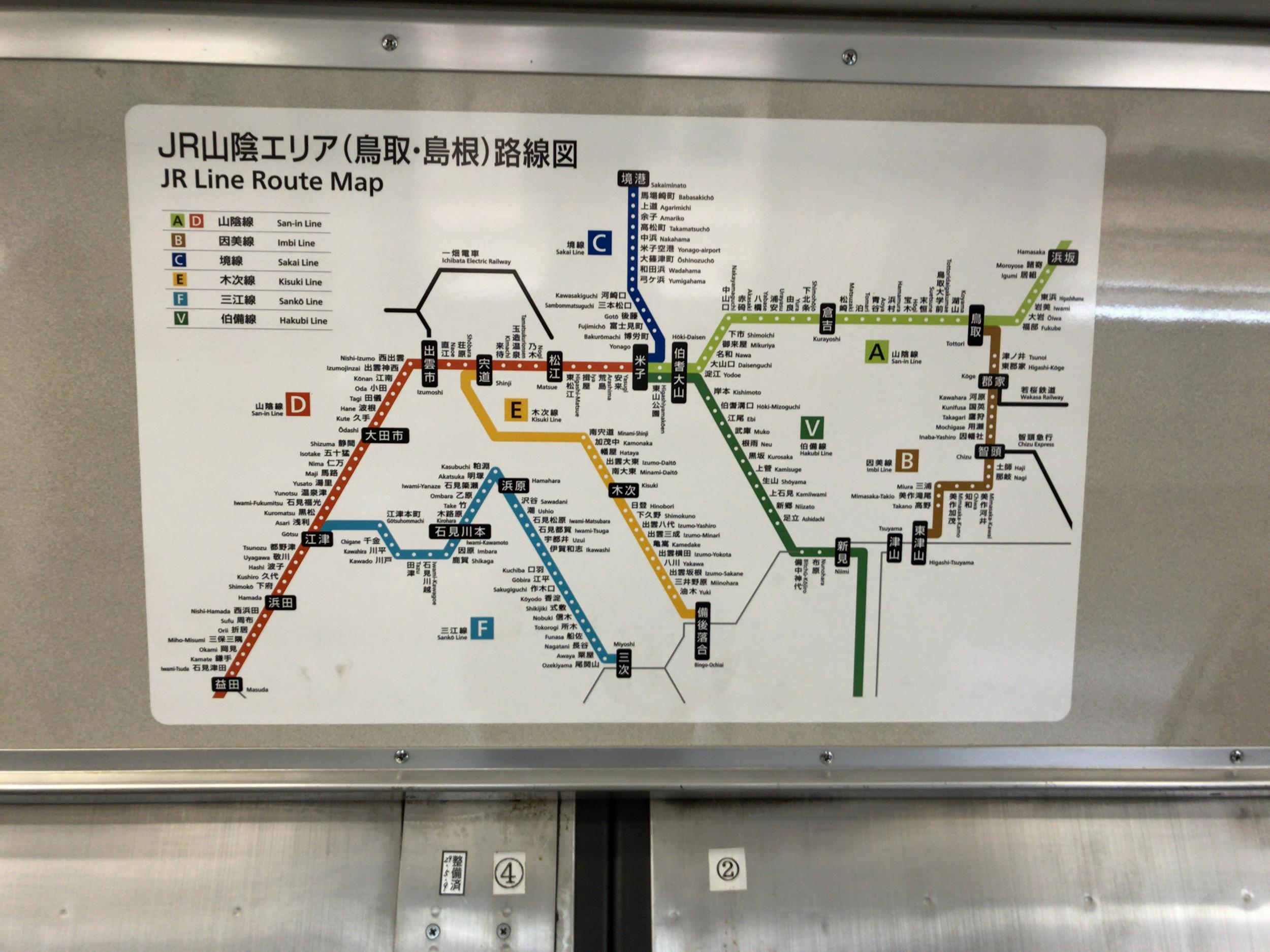 18キッパーくらいにしか役立たないと思われる山陰地方全体をカバーした路線図、左下の青い線、三江線がごそっと無くなってしまうとかなり寂しい地図になります。