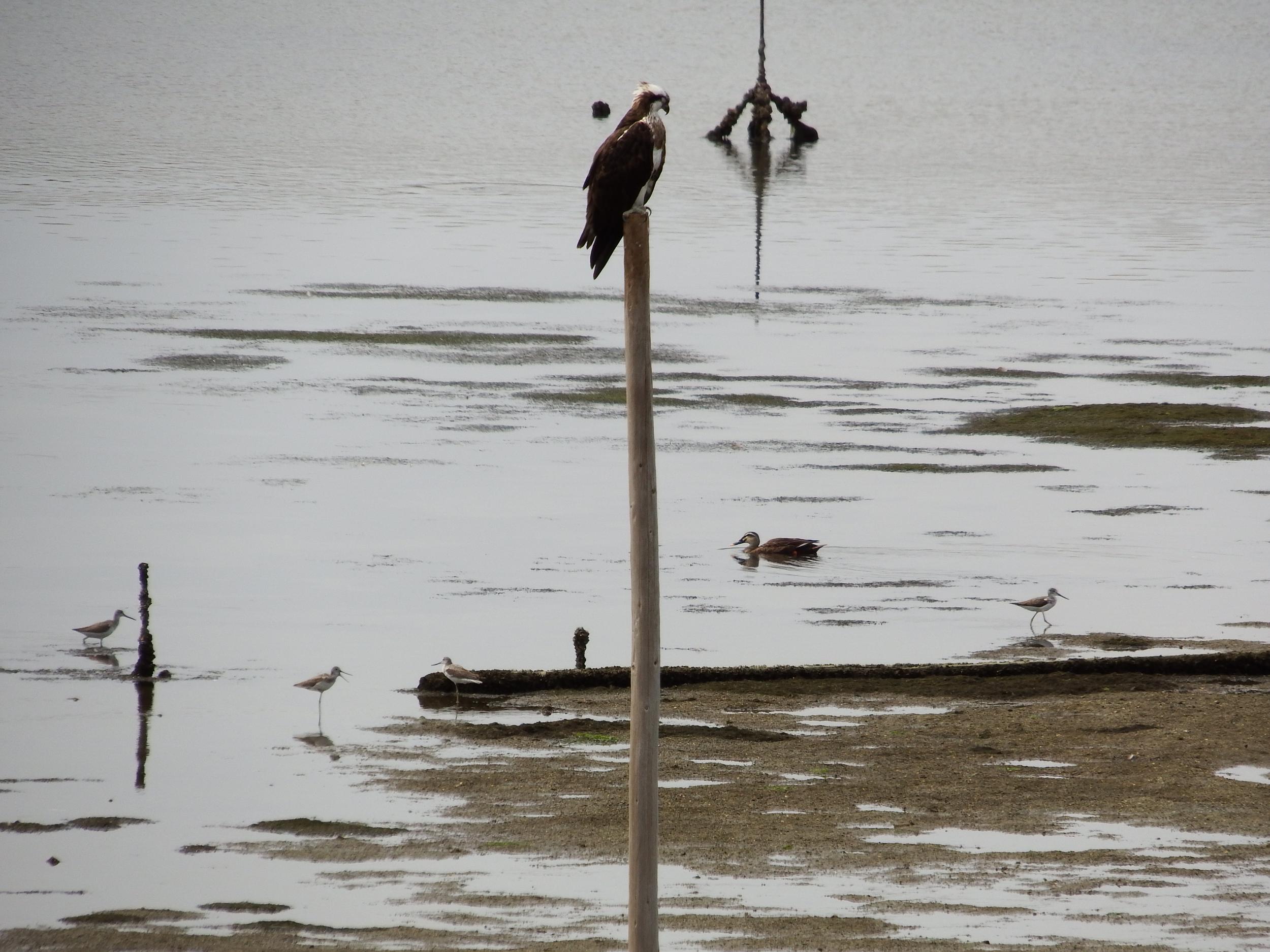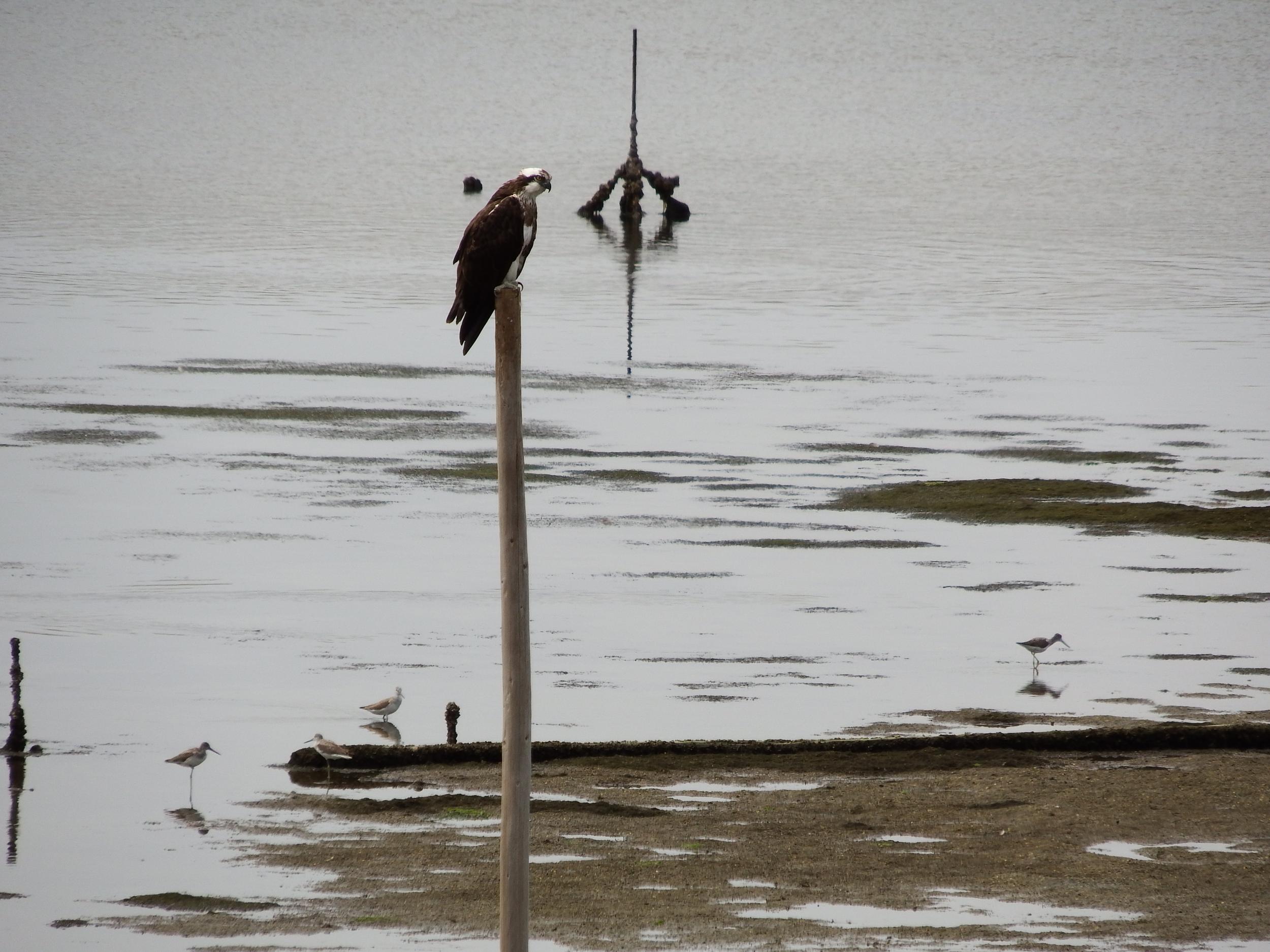お寛ぎのミサゴの向こうにいる4羽はアオアシシギです。