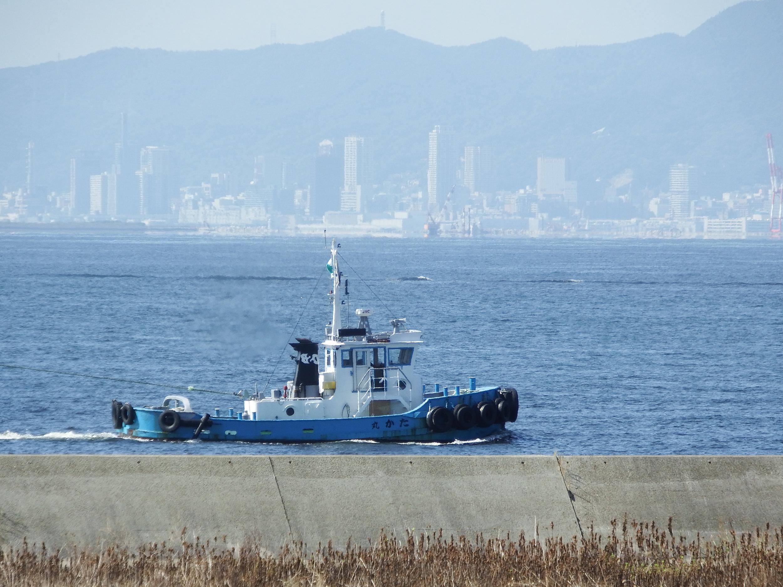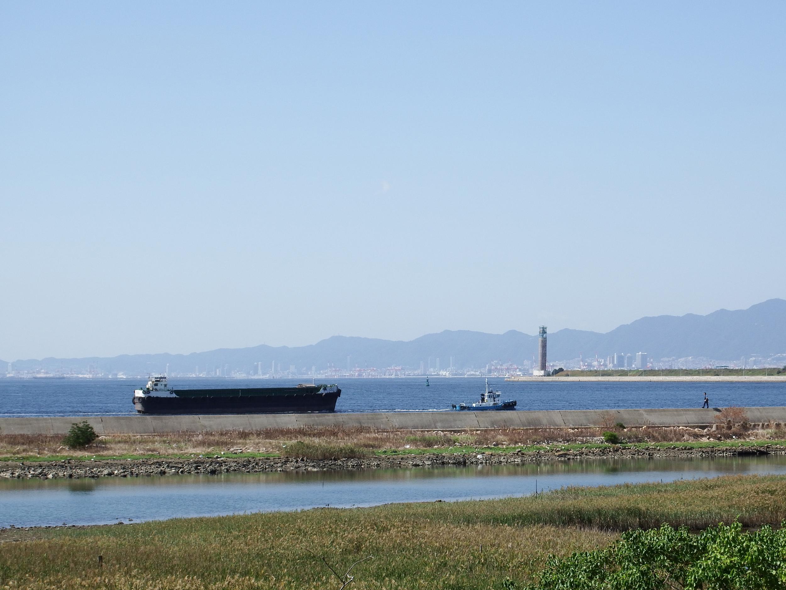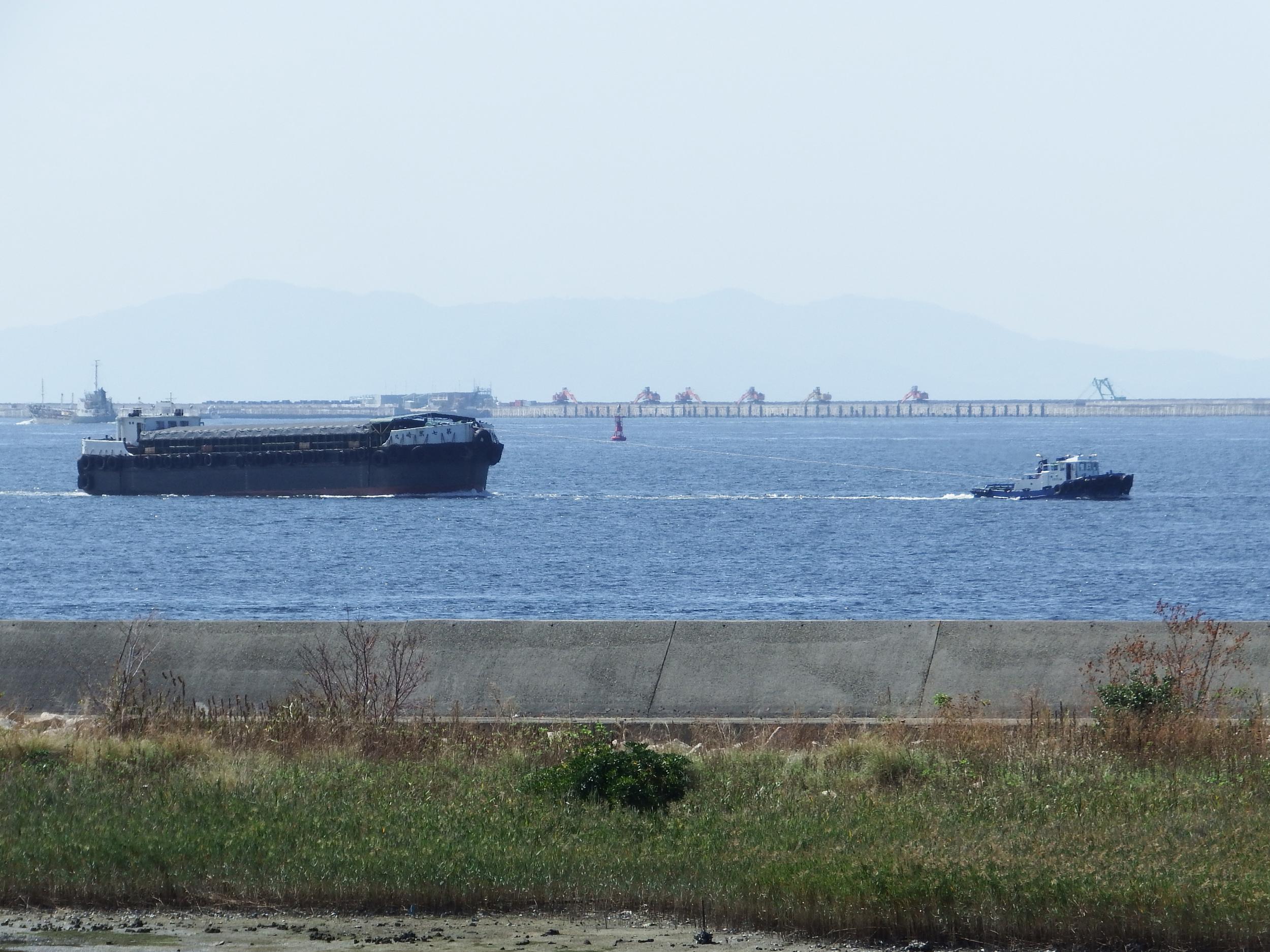 野鳥園の堤防の向こうからタグボート「たか丸」に牽かれた艀「SK1002」が入港してきました。