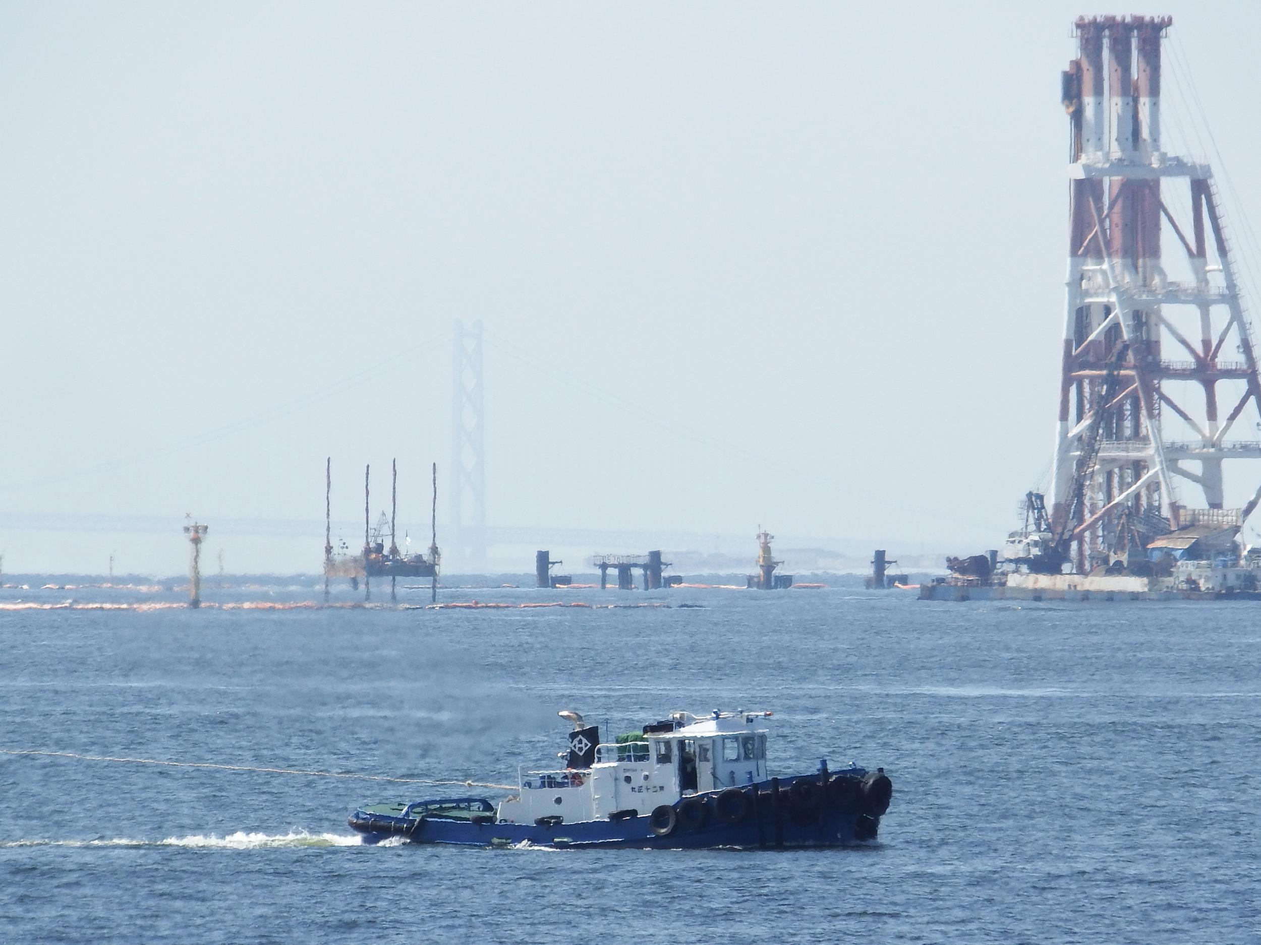 間髪をいれずもう一組、艀は第七黒崎丸、タグボートは第二十匠丸、遠景に明石海峡大橋。