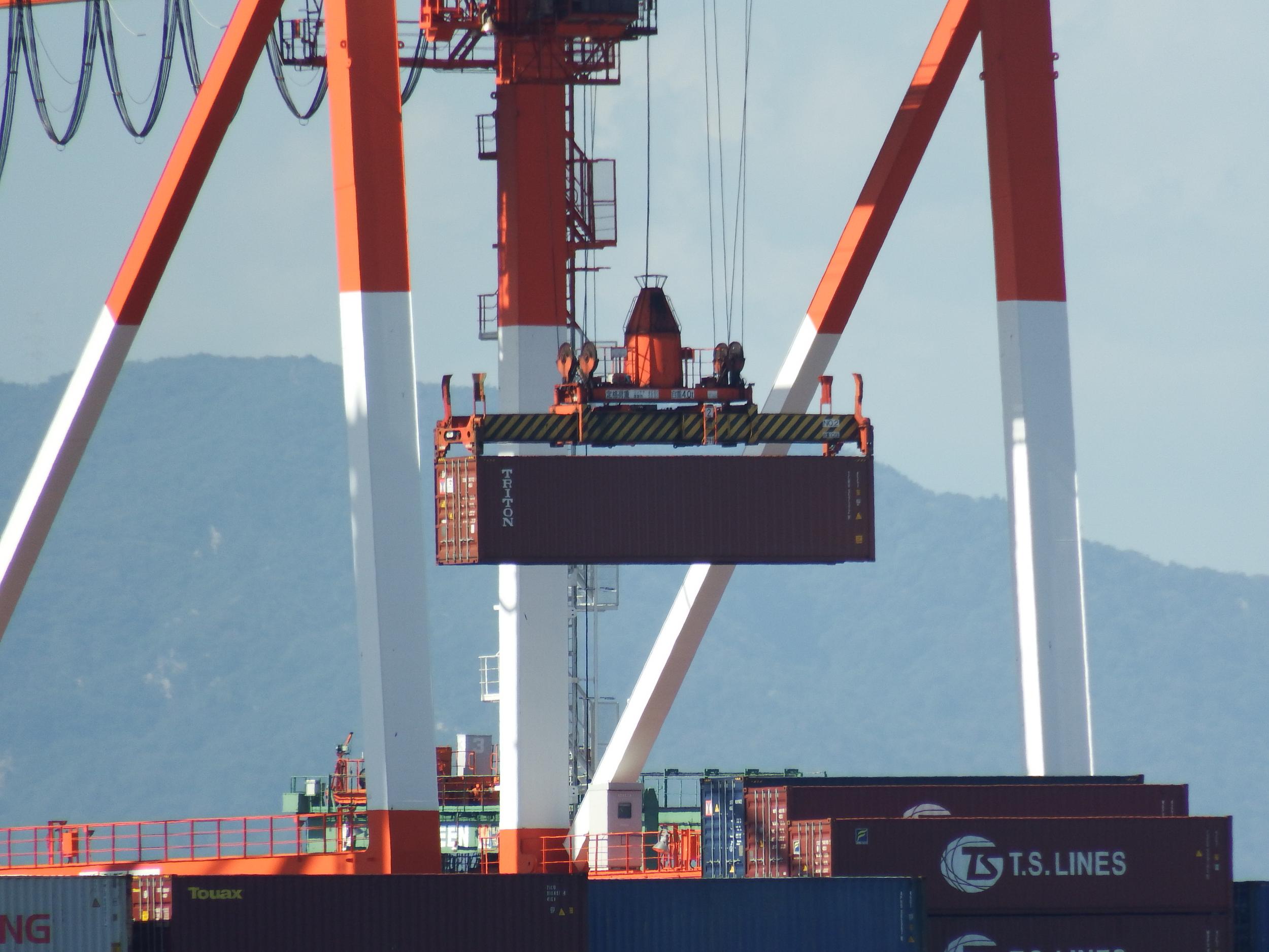 北港のガントリークレーンが首を下げコンテナを釣り上げています。