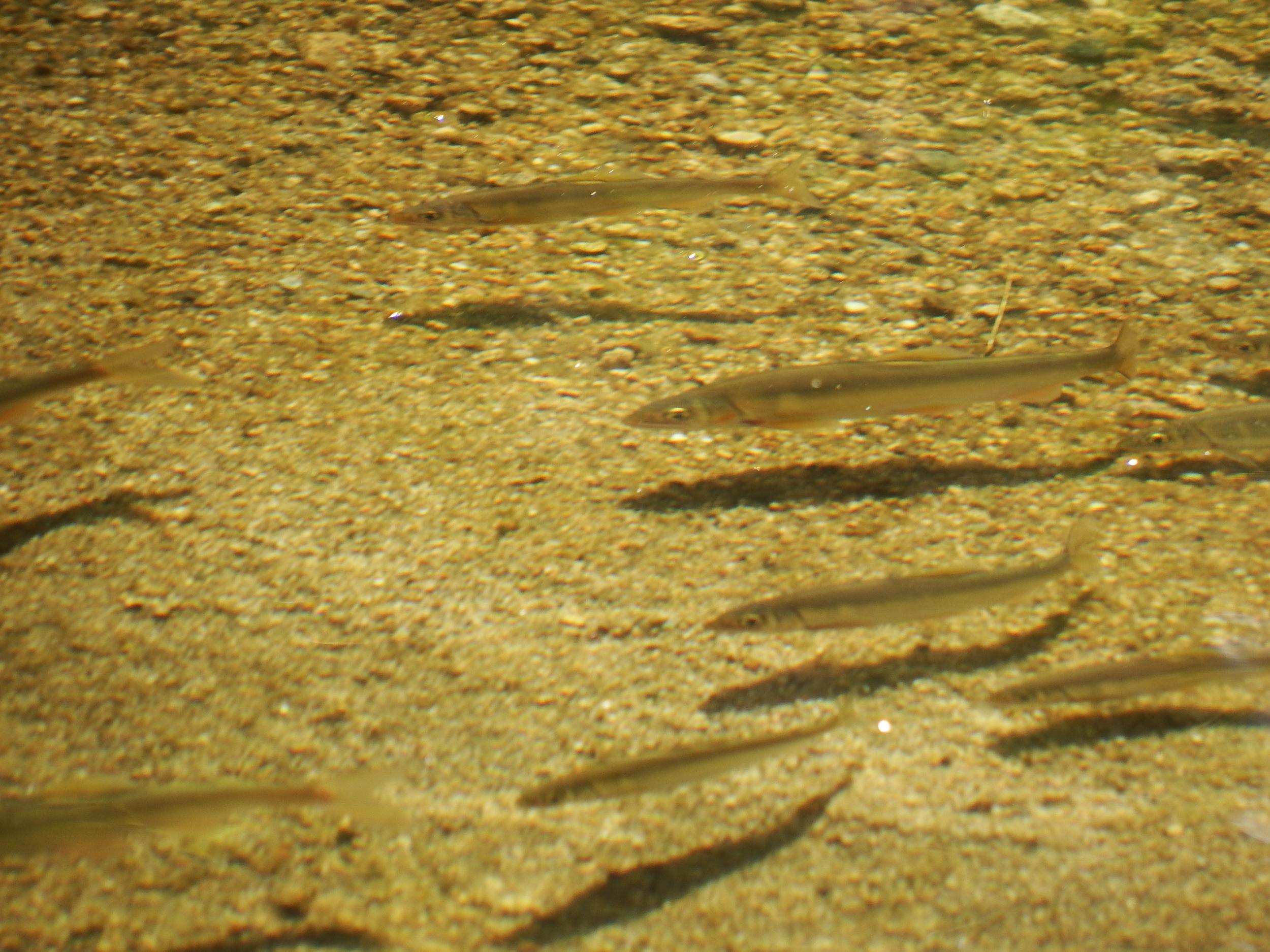 調べて調べて判明、アユで間違いないと思います。決め手は胸びれの後ろ側の黄色い楕円形の斑点、冒頭の2枚の写真のそれぞれの個体にもあります。それに黒い背びれもアユの特徴です。