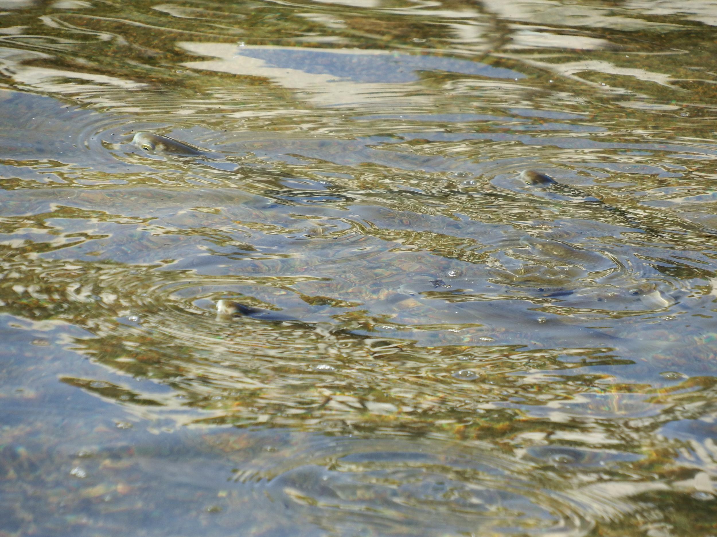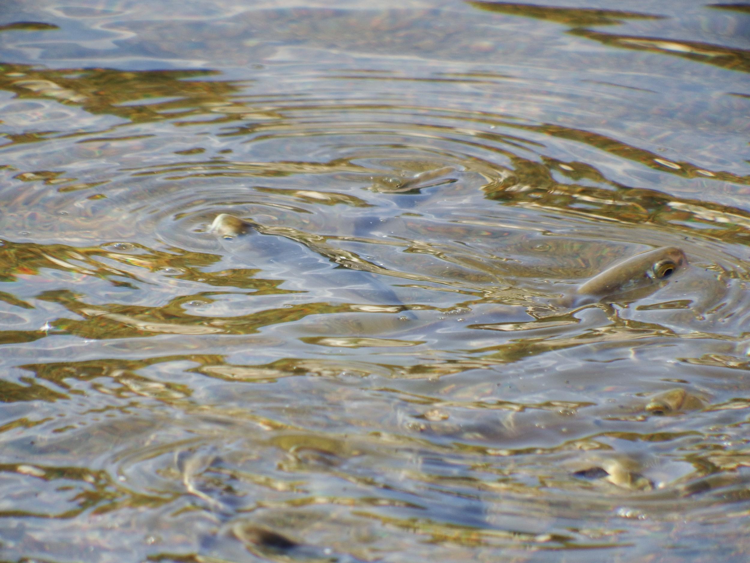 河口の水面に顔を出している魚たち、たぶんボラです。