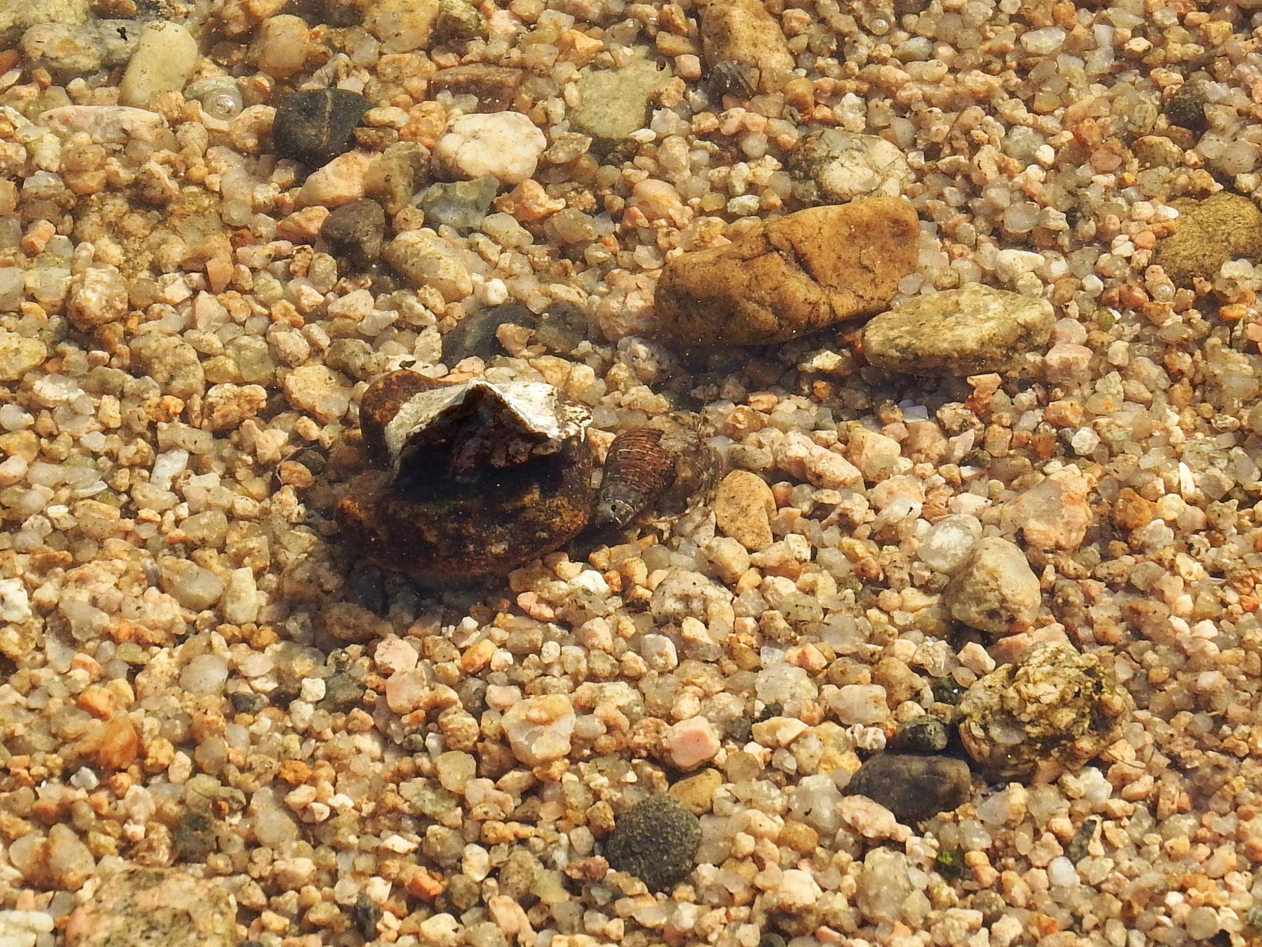 浜辺の波打ち際の水面をじっと観察していると、小さいヤドカリがたくさんいます。
