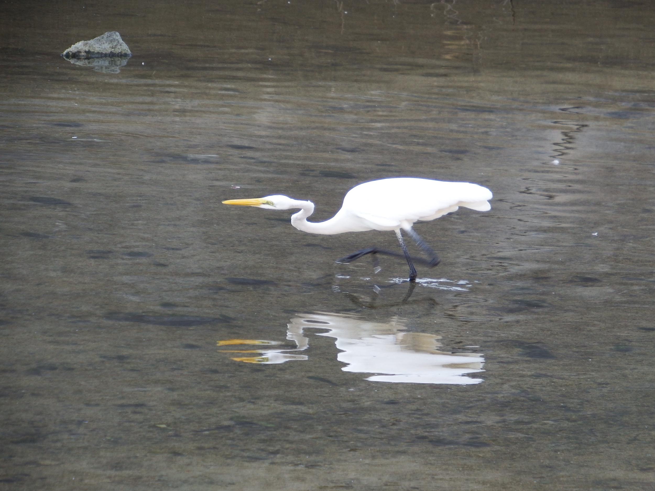 河口のボラとダイサギ。姿勢を下げて近づいていくものの、あまり上手に魚を捕まえているようじゃなさそうです。